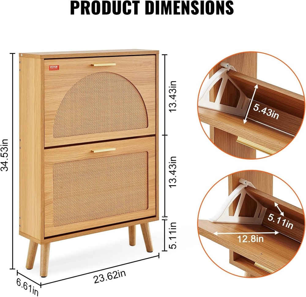 About this product: Wooden Smart Shoe Cabinet Storage Solution: Featuring an innovative, space-saving design, our shoe cabinet allows you to easily access your shoes while keeping them neatly organized when not in use, maintaining a tidy entryway. Ample Storage Space: Two flip-up drawers maximize storage space. Compared to other shoe cabinets of the same size, it can accommodate more different styles of shoes, including heels and ankle boots. Simple and Versatile Design: This entryway shoe cabinet features a classic white finish, solid wood legs, and aluminum handles. Its simple and stylish design perfectly complements various home décor styles, enhancing overall harmony and aesthetics. High Quality and Durability: This shoe cabinet with drawers is crafted from premium materials, with side and back panels thickened to 15mm/0.59 inches, significantly improving stability and durability. On Nov 3, 2025 at 02:25:06 PST, seller added the following information: