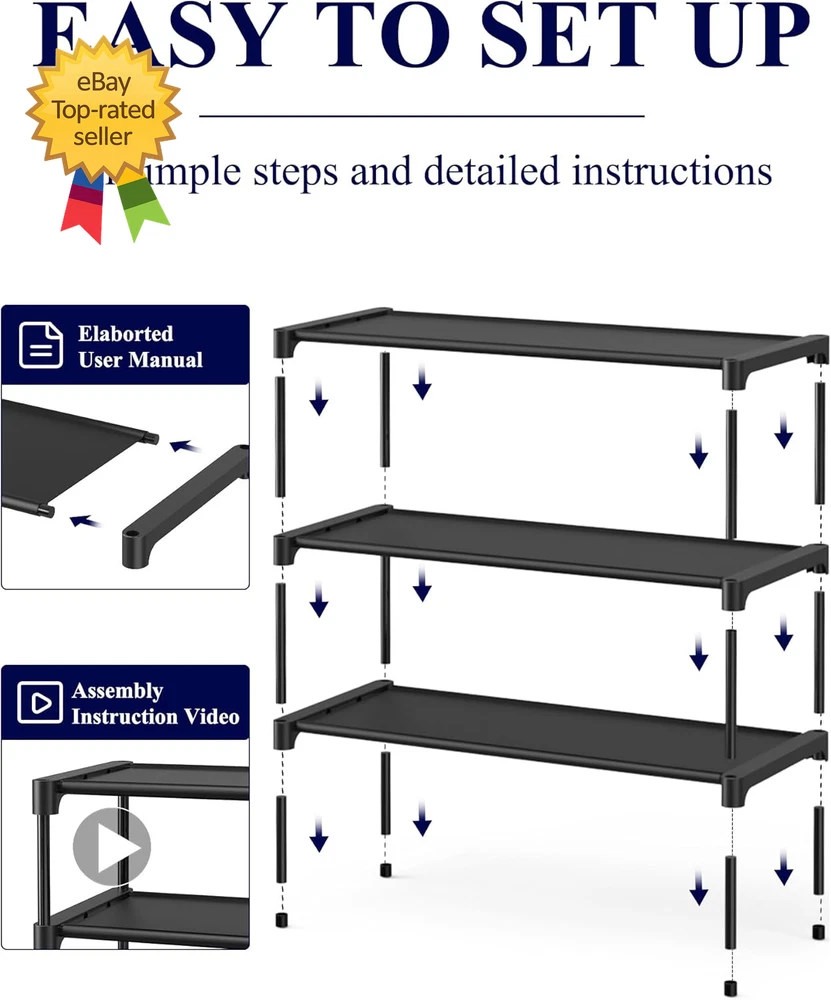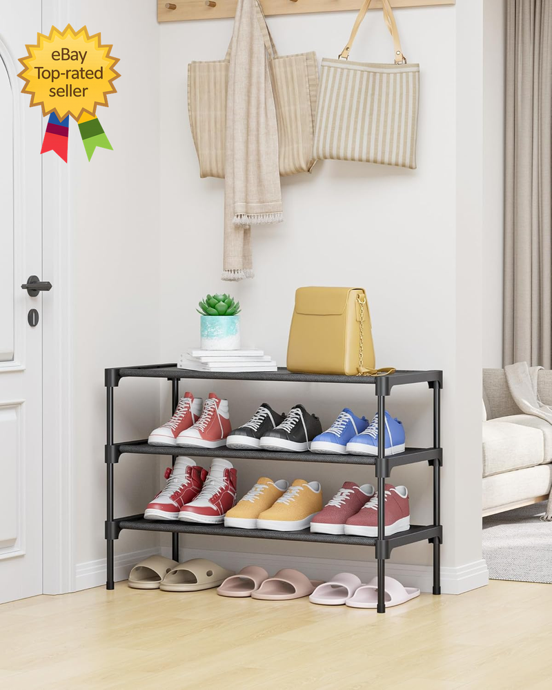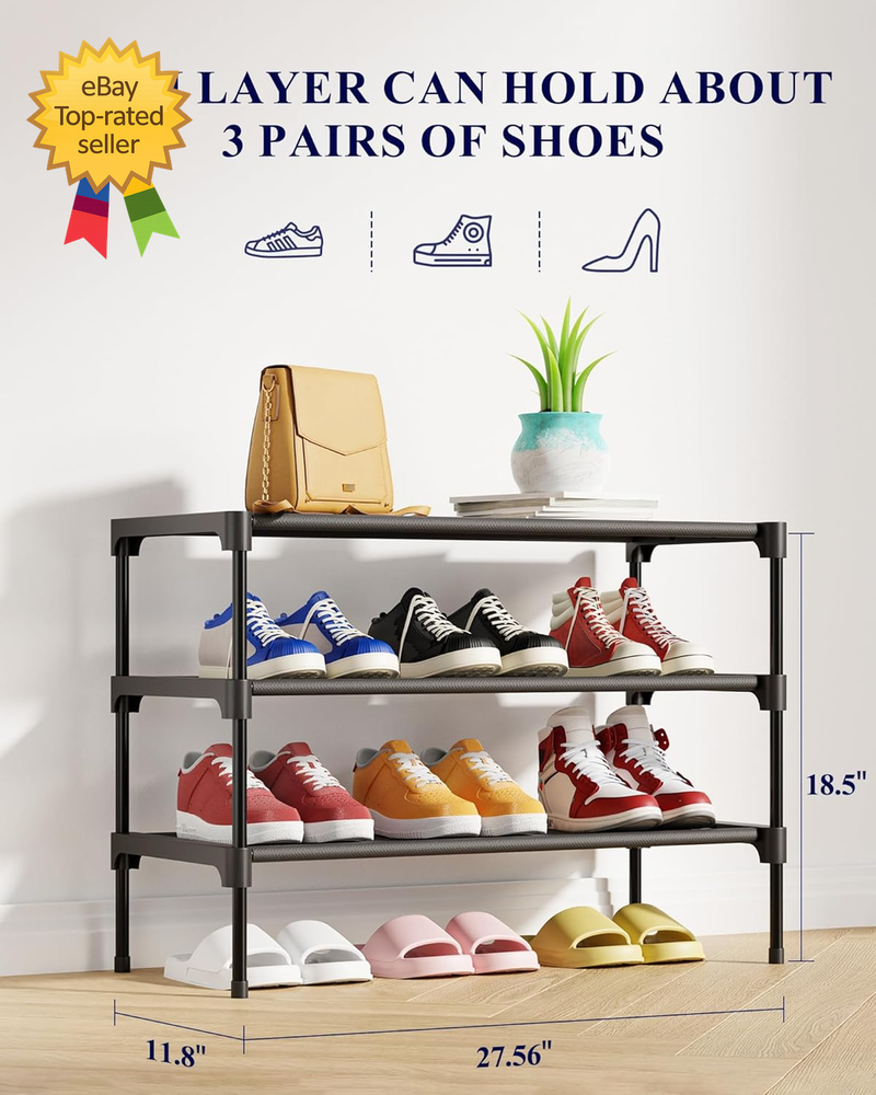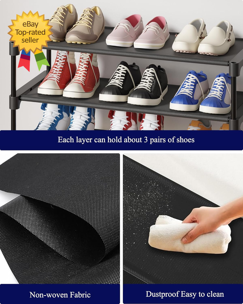 Store New Arrivals Add to Favorite View Feedback Contact Shoe Rack Non Woven Shoe Rack Shelf Shoe Organizer Closet Entryway Shoe Shelves Description Style Modern Shelf Thickness 1 Inches Unit Count 1.0 Count Product Dimensions 11.8"D x 27.56"W x 18.5"H Material Non-Woven Fabric, Plastic, Metal Item Weight 1.76 pounds Color Black Shape Rectangular Size 27.5" Wide - 3 Tier SPACIOUS STORAGE: This shoe rack offers plenty of space to accommodate your everyday footwear, including sneakers, heels, and slippers. It's designed to meet all your storage needs efficiently. MATERIAL: Made from metal tubes with plastic frames. The non-woven fabric shelves protect footwear from scuffs while preventing dust from falling through layers, keeping your collection clean and well-maintained. EASY ASSEMBLY: provides step-by-step instructions and installation video to ensure quick and easy tool-free assembly. With only 4 steps you can easily set up this shoe rack organizer without screws or any other tools. STACKABLE DESIGN: closet shoe organizer features a stackable design that is perfect for customizing storage to fit your space. You can pile up 2 or more racks to organize your shoes, bags, suitcases, and more in a limited space. MULTI-PURPOSE USE: With its compact size, this free-standing shoe rack fits seamlessly into small spaces around the home like garages, walk-in closets, and living rooms. Make the most of tight storage areas with this versatile closet shoe rack. ABOUT US We offer the best prices around on high quality products. Our E-store includes media such as books, movies, music and games while offering electronics, toys, sporting apparel, clothing, tools, general home, garden items and more. SHIPPING We are always working hard to ensure your package arrives as soon as possible. Please understand that some factors like weather, high postal traffic, and the performance of shipping companies are outside of our control. We offer free shipping to the lower 48 states and ship within 2 business days of payment, usually sooner. We do not accept P.O. Boxes. Please provide a physical address. For shipping outside of the continental USA, we only use eBay's Global Shipping Program.The item is shipped to KY and then sent to the rest of the world. International customers are responsible for all duties and taxes. Continue to check out in order to calculate costs for shipping the item to your country. Messages regarding eBay's Global Shipping Program MUST be directed at eBay EXCLUSIVELY. RETURNS We offer a 30-Day Return Policy on items which you are not completely satisfied with. You have the option for a full-refund or an exchange of the item. No returns are available on items shipped outside of the USA. PAYMENT We accept PayPal. CONTACT US This page content is yet to come Please ad us to your favorite seller and visit again later Thank You CUSTOMER SATISFACTION We try our very best to make sure every customer is completely satisfied. If there's a problem, message us! We're happy to help.