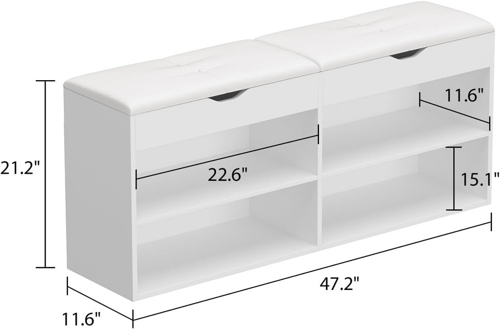Product Description About this item Ample Space - The entryway shoe bench possesses 2 lift top storage boxes and 2-tier storage shelves. It will provide you with ample space to organize belongings, like umbrella, purses and other items for outing. And shelves with adjustable design can meet various storage needs. Bench with Cushion Seat - This shoe storage bench comes with a cushion seat, covered with PU leather, offering you a comfortable experience when changing shoes or taking a break. The cushion is soft to sit while its surface is easy to clean. Just take a damp cloth to wipe the dirt. Sturdy to Use - The double seat bench is mainly made of sturdy PB, MDF and PU leather, ensuring stability and durability. With sturdy construction, it boasts good load bearing capacity and you can sit with no worry. Dimension: 11.6”D x 47.2”W x 21.2”H. Multi-Use - Possessing modern appearance and practical storage design, this warm white shoe storage bench can go well with many home decor styles and fit to many scenes. Our shoe storage is suitable for placing in entryway, living room, hallway, mudroom or cloakroom. Assembly - The shoe bench include a detailed instruction and labeled hardware. Please check out that all parts are received and intact before your assembly process. And please follow the directions to assemble it carefully. Shoe Bench with Adjustable Shelf, Storage Bench with Lift Top Storage, Double Seat Bench Entryway Shoe Storage Bench with Cushion for Hallway Living Room White, 11.6”D x 47.2”W x 21.2”H