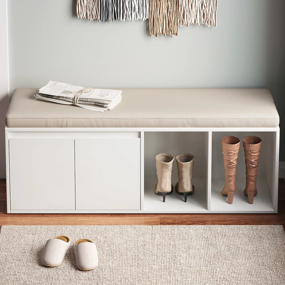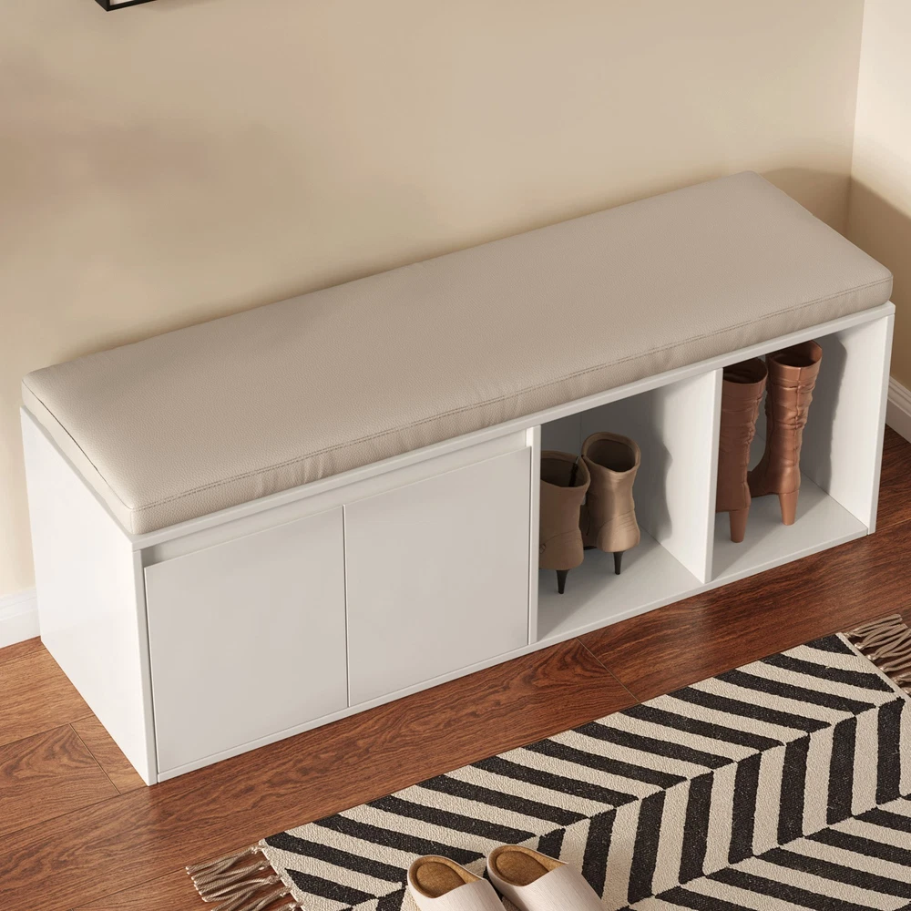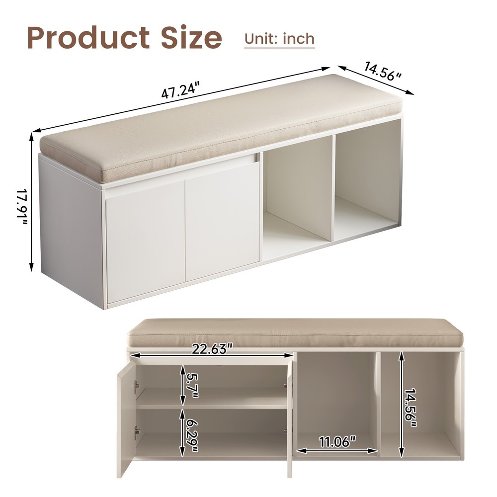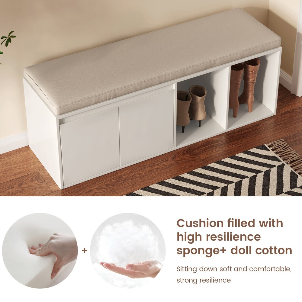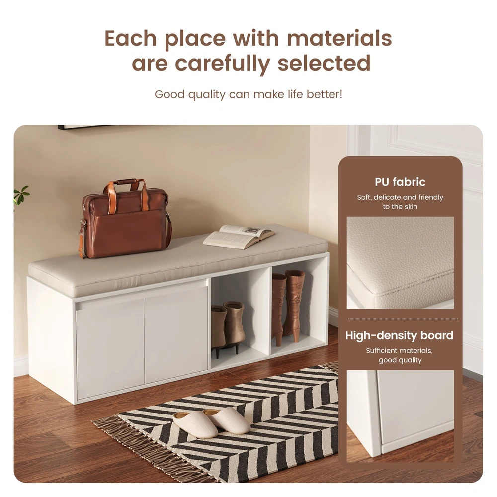 Shoe Storage Bench with PU Leather Cushion, 47.24" Shoe Cabinet with 2 Doors & 2 Storage Cabinets for Entryway, Hallway, Living Room, White 【Soft PU Leather Cushion】: The top cushion is made of premium PU leather that feels soft and smooth to the touch. It is breathable, skin-friendly, and easy to clean. Filled with a high-resilience sponge and cotton, it provides exceptional comfort whether you're putting on shoes or taking a moment to relax. 【Spacious Double Cabinet Design】: Designed with two door-style cabinets and two roomy storage compartments, this shoe bench keeps footwear and everyday items out of sight. Perfect for storing shoes, bags, or seasonal accessories, it helps keep your entryway tidy and well-organized. 【Durable Engineered Wood Structure】: Built with high-quality engineered wood, the bench ensures reliable sturdiness and long-term use. The frame is solid and doesn’t shake or wobble—perfect for daily seating. It can easily support adult weight and frequent use. 【Easy Assembly】: No professional tools needed. This bench comes with clear assembly instructions and all required hardware, so you can put it together quickly and hassle-free. Ideal for anyone who wants a fast and convenient setup. 【Excellent Customer Service】: We are committed to providing high-quality service. If you encounter any issues with the product, we promise to solve them promptly and efficiently. Your satisfaction is our top priority, and we will go the extra mile to ensure you are happy with your purchase. Packing Includes: 1 x Shoe Bench 1 x Assemble Instruction 1 x Accessories required for assembly
