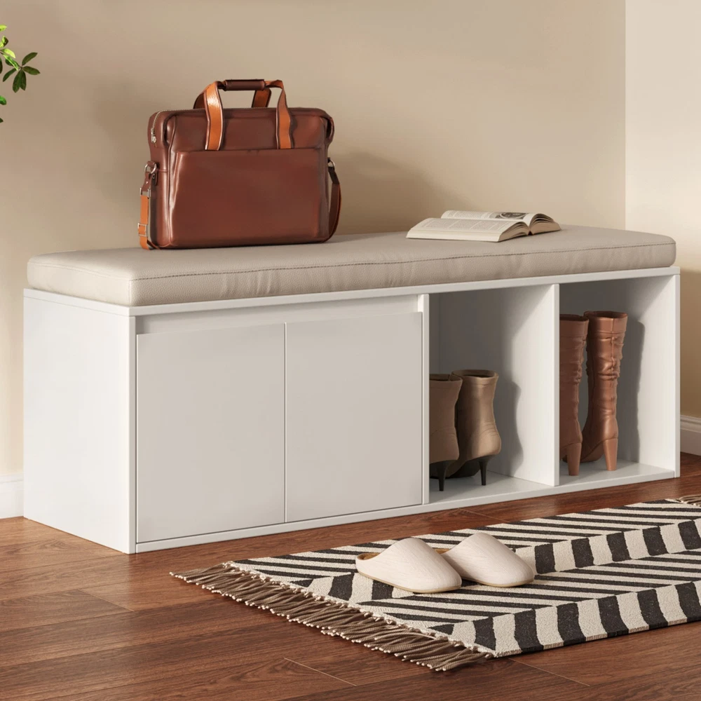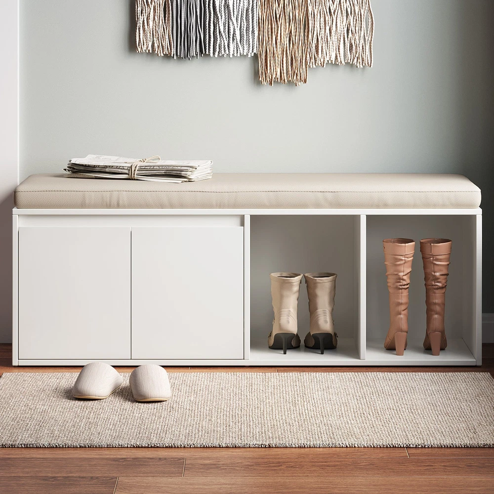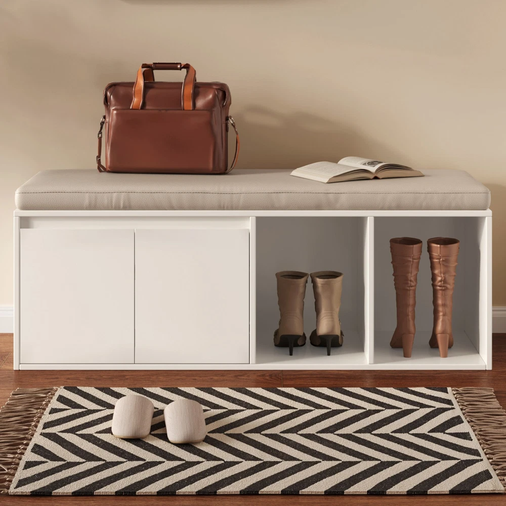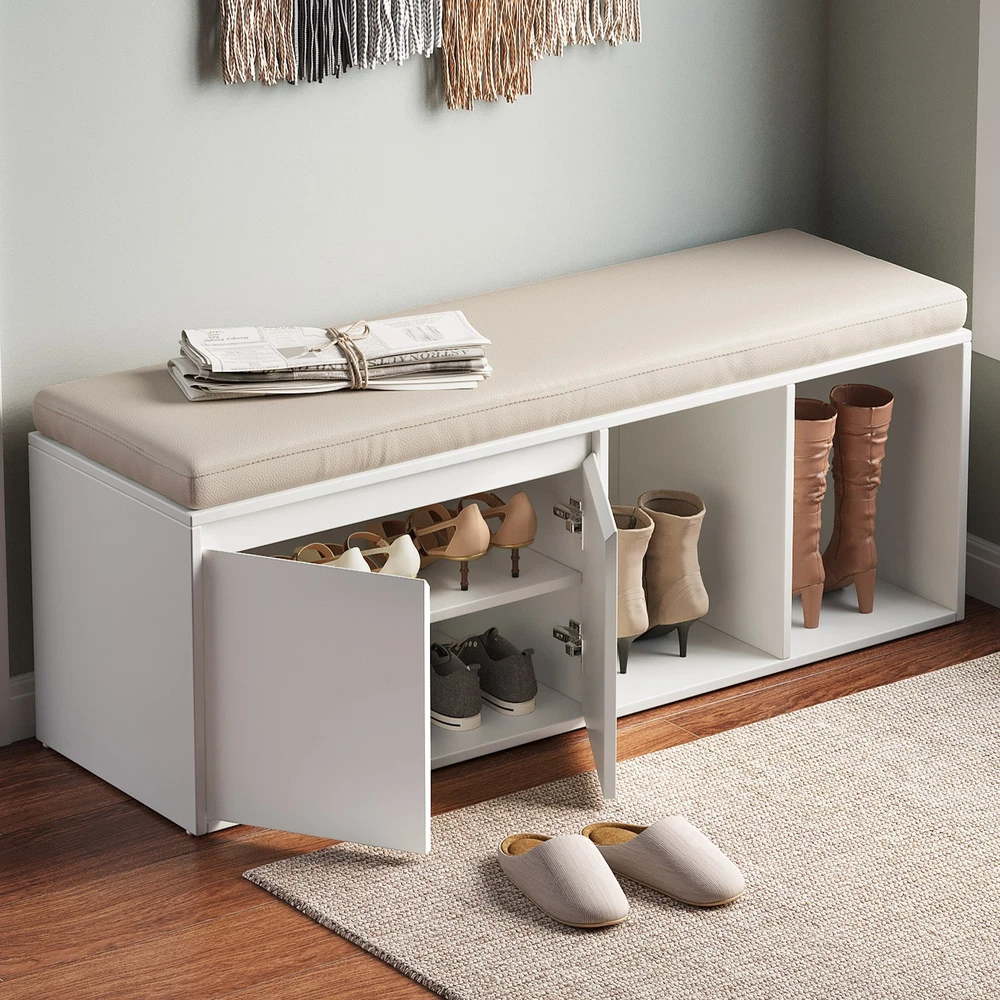 Shoe Storage Bench with PU Leather Cushion, 47.24" Shoe Cabinet with 2 Doors & 2 Storage Cabinets for Entryway, Hallway, Living Room, White 【Soft PU Leather Cushion】: The top cushion is made of premium PU leather that feels soft and smooth to the touch. It is breathable, skin-friendly, and easy to clean. Filled with a high-resilience sponge and cotton, it provides exceptional comfort whether you're putting on shoes or taking a moment to relax. 【Spacious Double Cabinet Design】: Designed with two door-style cabinets and two roomy storage compartments, this shoe bench keeps footwear and everyday items out of sight. Perfect for storing shoes, bags, or seasonal accessories, it helps keep your entryway tidy and well-organized. 【Durable Engineered Wood Structure】: Built with high-quality engineered wood, the bench ensures reliable sturdiness and long-term use. The frame is solid and doesn’t shake or wobble—perfect for daily seating. It can easily support adult weight and frequent use. 【Easy Assembly】: No professional tools needed. This bench comes with clear assembly instructions and all required hardware, so you can put it together quickly and hassle-free. Ideal for anyone who wants a fast and convenient setup. 【Excellent Customer Service】: We are committed to providing high-quality service. If you encounter any issues with the product, we promise to solve them promptly and efficiently. Your satisfaction is our top priority, and we will go the extra mile to ensure you are happy with your purchase. Packing Includes: 1 x Shoe Bench 1 x Assemble Instruction 1 x Accessories required for assembly