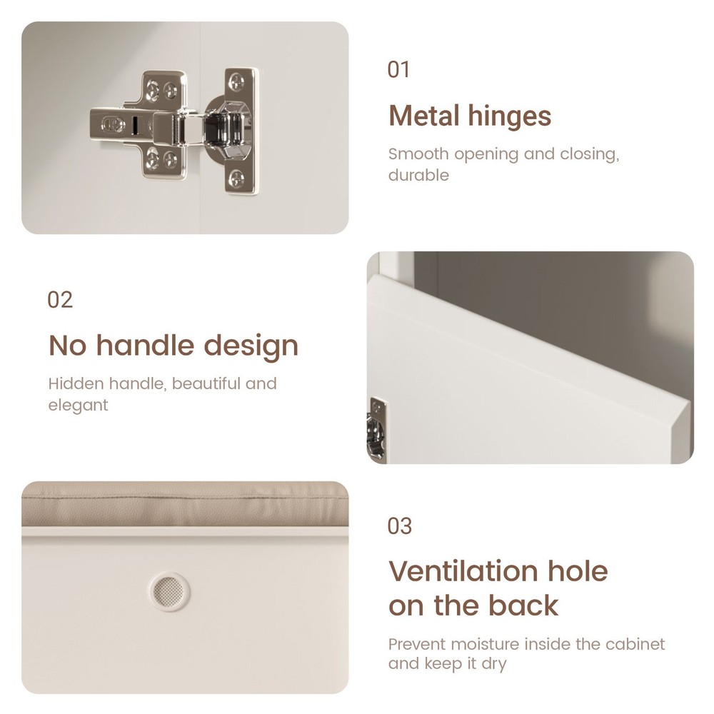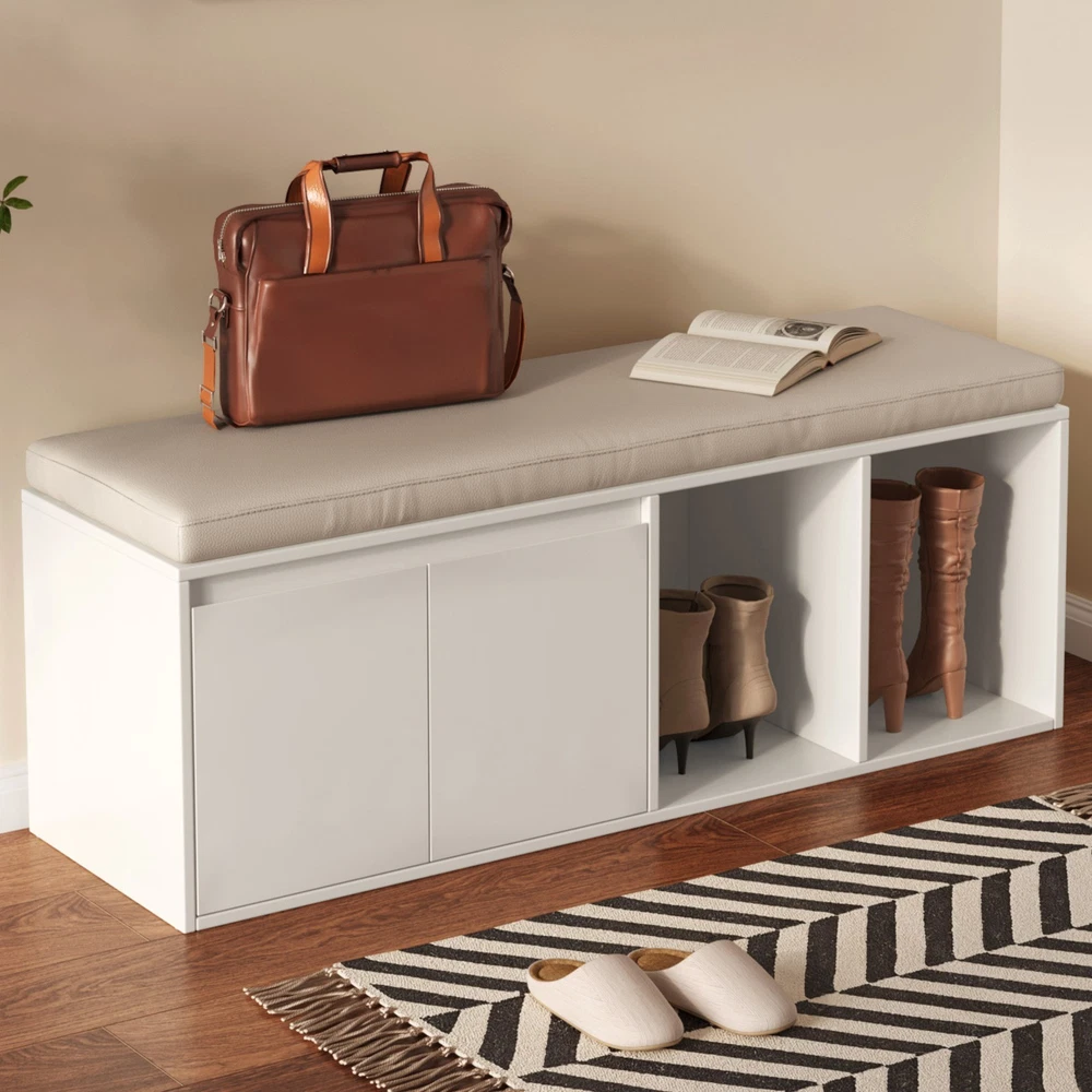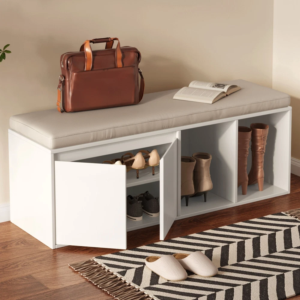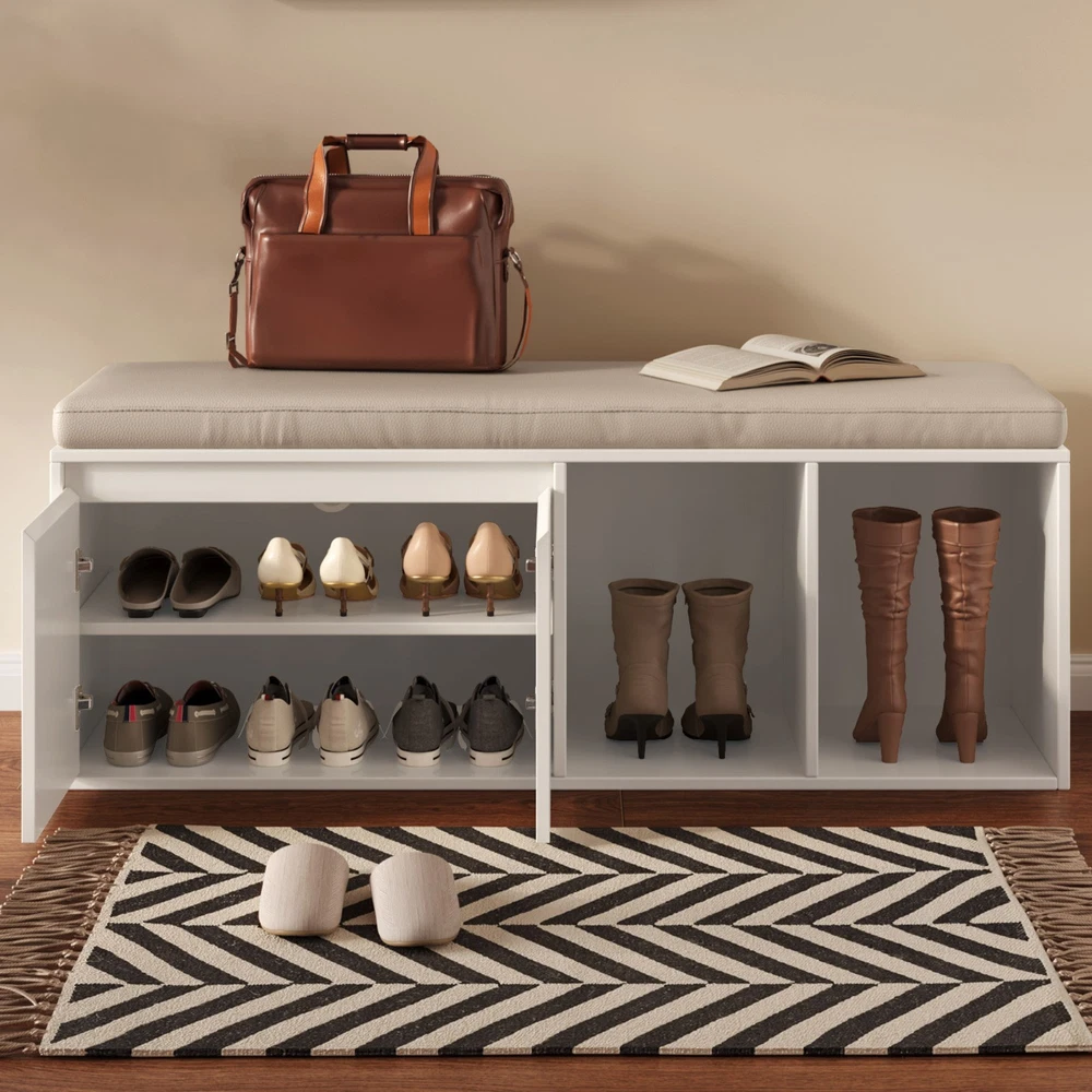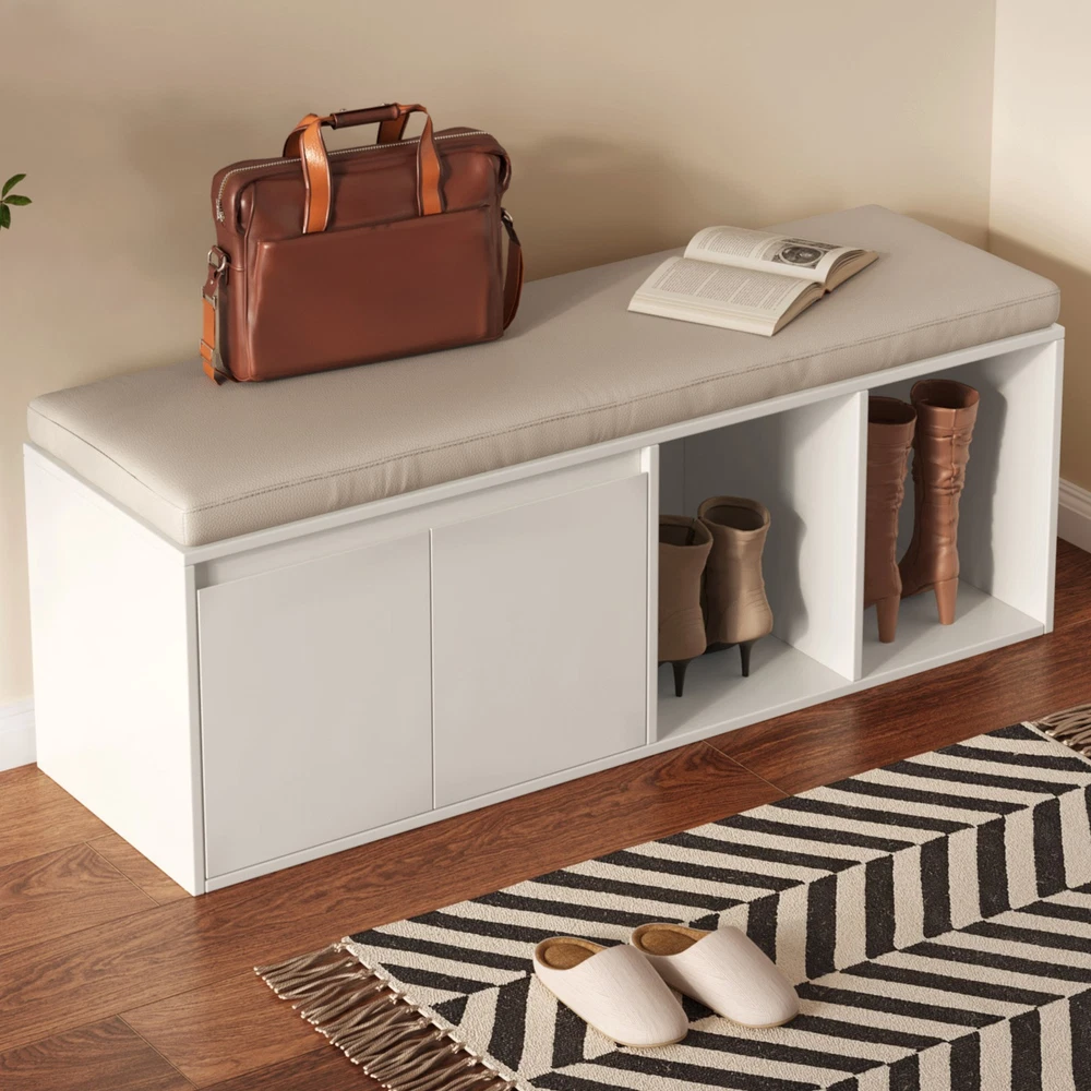 Shoe Storage Bench with PU Leather Cushion, 47.24" Shoe Cabinet with 2 Doors & 2 Storage Cabinets for Entryway, Hallway, Living Room, White 【Soft PU Leather Cushion】: The top cushion is made of premium PU leather that feels soft and smooth to the touch. It is breathable, skin-friendly, and easy to clean. Filled with a high-resilience sponge and cotton, it provides exceptional comfort whether you're putting on shoes or taking a moment to relax. 【Spacious Double Cabinet Design】: Designed with two door-style cabinets and two roomy storage compartments, this shoe bench keeps footwear and everyday items out of sight. Perfect for storing shoes, bags, or seasonal accessories, it helps keep your entryway tidy and well-organized. 【Durable Engineered Wood Structure】: Built with high-quality engineered wood, the bench ensures reliable sturdiness and long-term use. The frame is solid and doesn’t shake or wobble—perfect for daily seating. It can easily support adult weight and frequent use. 【Easy Assembly】: No professional tools needed. This bench comes with clear assembly instructions and all required hardware, so you can put it together quickly and hassle-free. Ideal for anyone who wants a fast and convenient setup. 【Excellent Customer Service】: We are committed to providing high-quality service. If you encounter any issues with the product, we promise to solve them promptly and efficiently. Your satisfaction is our top priority, and we will go the extra mile to ensure you are happy with your purchase. Packing Includes: 1 x Shoe Bench 1 x Assemble Instruction 1 x Accessories required for assembly