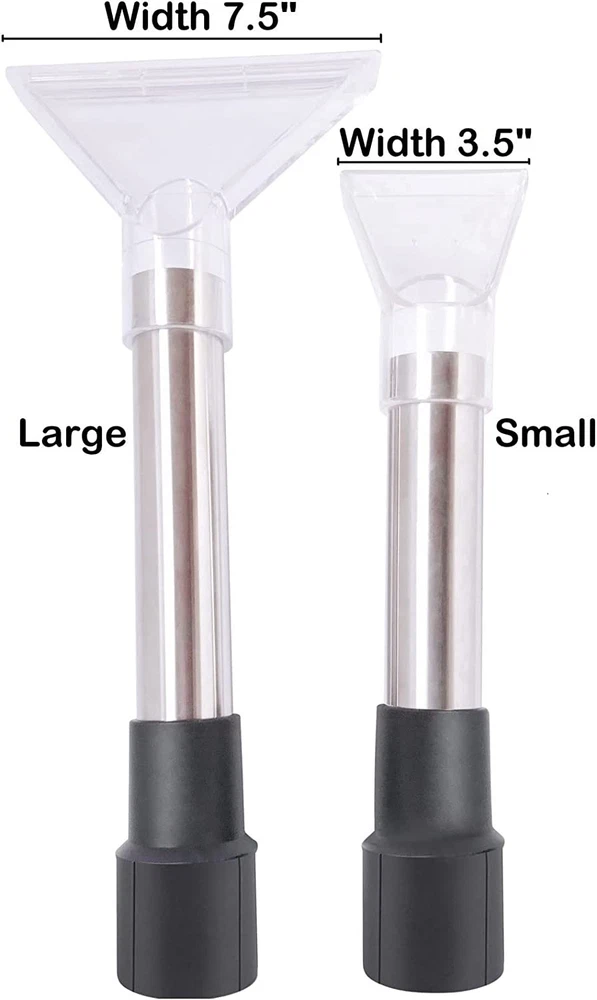 🍁TWO ADAPTERS AVAILABLE: The 2 hose sleeves meet your multipurpose home and vehicle use. Adapter A fits spiral wound hose in 1-7/8”; Adapter B fits spiral wound hose in 1-1/4”. These two adapters are with inside threads, so could only be connect to spiral wound hose directly. Please make sure your original hose end/cuff could be taken off before order 🍁DIY A CARPET EXTRACTOR: If you’ve got a shop vac you need a professional extract tool that enhances your suction capabilities and cleans things up quickly and easily. Our unique adapters help to convert any existing shop vac into a powerful extractor. You can therefore save the expensive cost of a pro extractor. A great alternative to buy a professional extractor. Don’t waste your money or overspend on “Pro” extractors. Harness the power of your shop vac! 🍁 STRONG 304 STAINLESS STEEL TUBE: Standard 1-1/2" vacuum tubing compatible with portable extractors & truck mount and most carpet cleaning system for optimal cleaning support 🍁UNBREAKABLE SEE-THROUGH HEAD: This clear head is made from special premium materials and will not breakable even your automobile roll on it. Don’t worry to drop it anywhere, it is unbreakable! The transparent head lets you view the whole cleaning process and effect, see the dirt and impurities being cleaned. This small 3-1/2” width nozzle extract stains from stairs, car interiors, upholstery, mats, boats as well as all those other hard to reach place