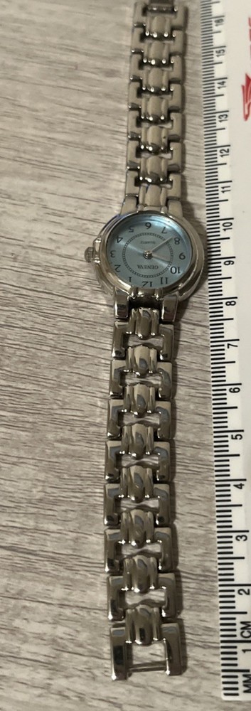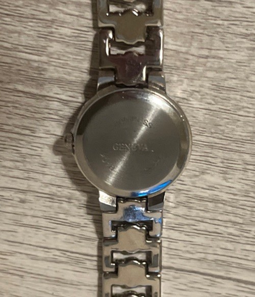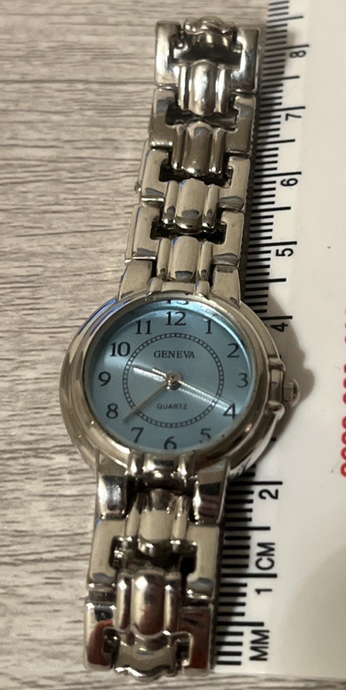 This Geneva women's silver watch features a light blue face, quartz movement, and a stainless steel case. The watch has a two-piece metal strap with a buckle closure, and it is designed for casual style. It has a round shape with Arabic numerals on the indices, and the case size is 20mm. The watch is not vintage, and it does not come with papers, service records, or the original box. This stylish timepiece is perfect for everyday wear and adds a touch of elegance to any outfit. ***See photos for additional details. The watch is fully functional even has a fresh battery. The bracelet clasp needs some adjustment. See photos for additional details. Buyer pays for shipping. Sold as is. Will entertain serious offers.***