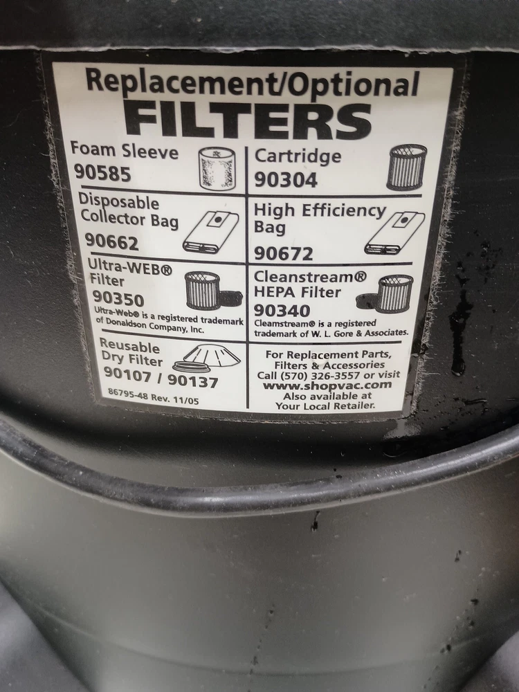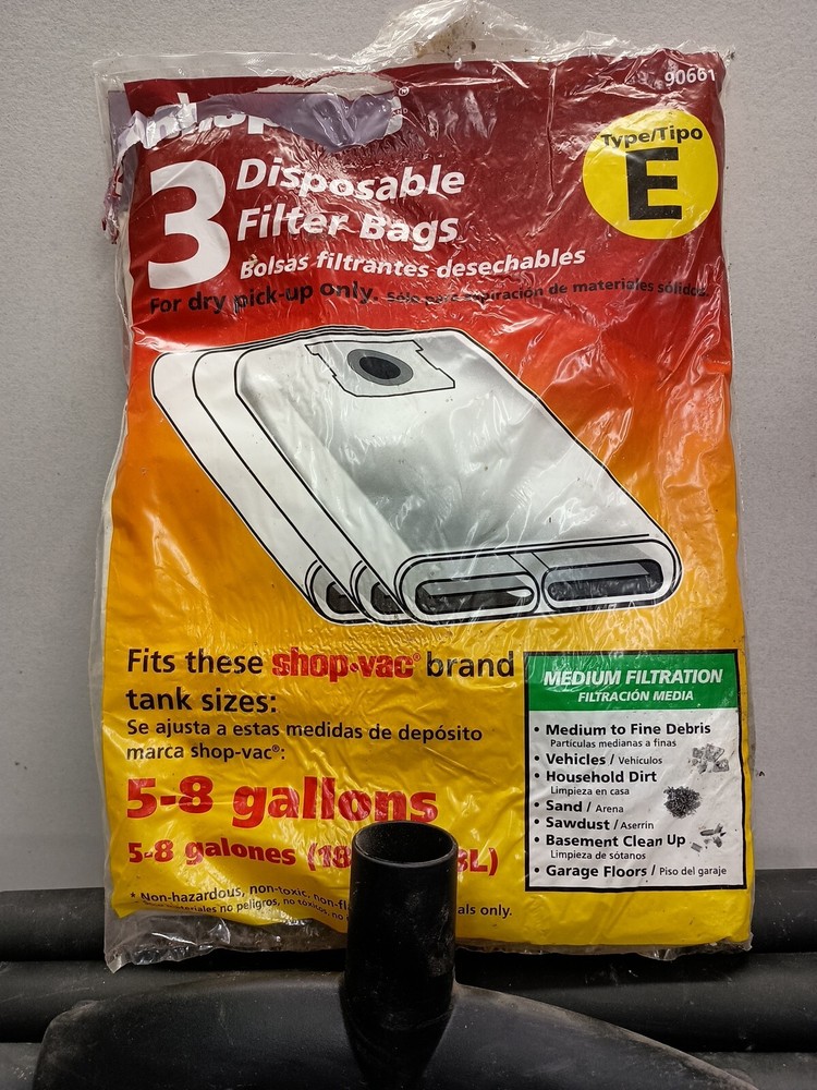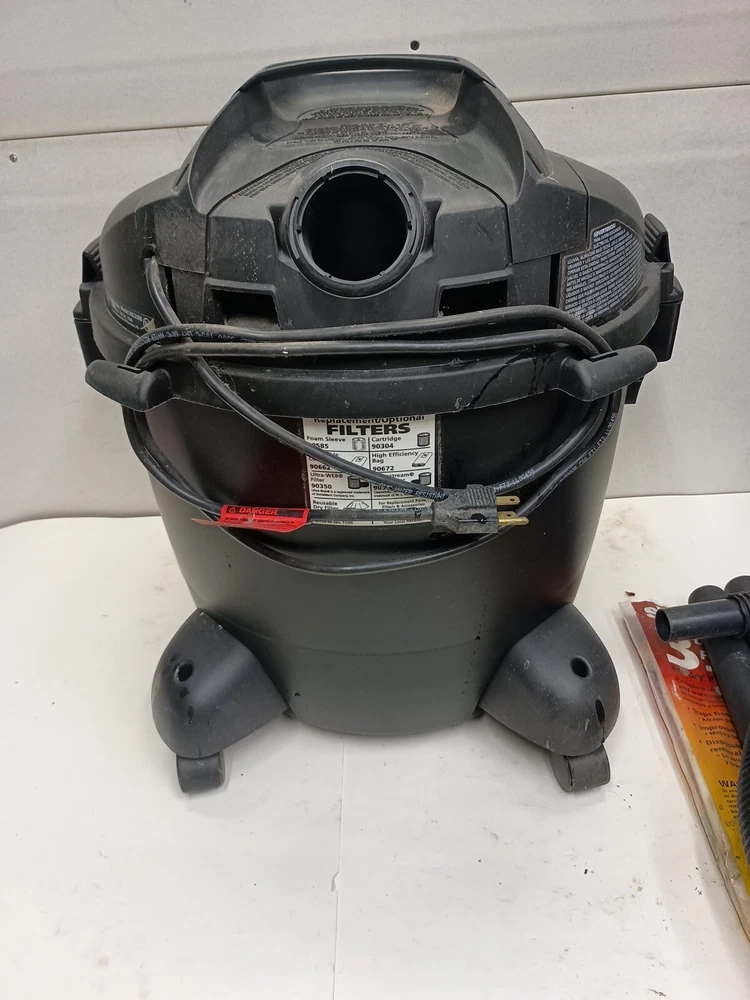 This thing was rarely used like once or twice. There are still two of the original filter bags left but I don't know what condition they're in but they look usable. It's just been sitting in storage and it's time to get rid of it. The Shop-Vac 87722-67 is a wet/dry vacuum with a 10 gallon capacity and a 2.5 horsepower motor. It comes with a cartridge filter and a micro filter, and includes accessories such as a nozzle, extension wand, and floor brush. The vacuum is bagged and has a voltage of 120V. It is portable, has a blower feature, and is compact. The unit type is measured in gallons and has a weight of 15 pounds.