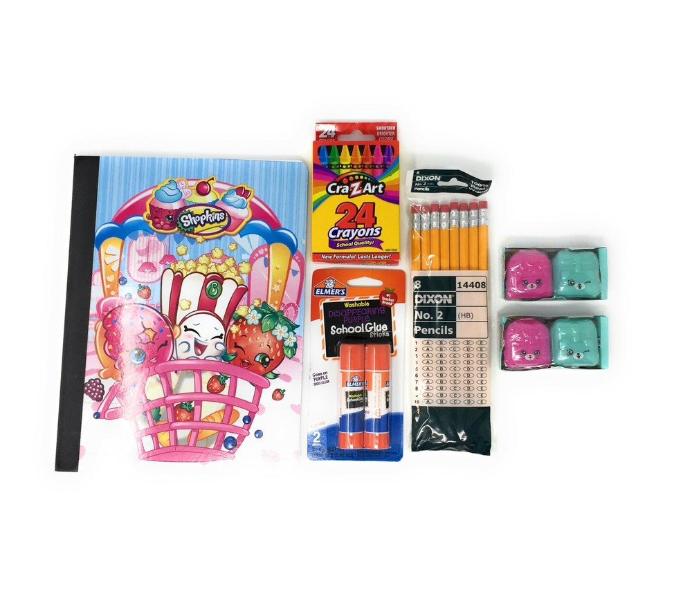 Shopkins Back To School Girl's Backpack Bundle with Season 5 Blind Backpacks Product Overview Brand: Shopkins A fun way to go back to school! Shopkins back to school girl's backpack bundle includes backpack, collectors tin with Who's The Super Shopper Card Game (also can be used as a lunch box), composition notebook, crayons, pencils, glue sticks & 2 sets of Shopkins Season 5 Blind Bundle Backpacks (2 Shopkins+2 Petkin Backpacks+collectors guide inside each set). Backpack can be used as a book bag, travel bag or day pack & has adjustable padded straps with 1 main large zippered compartment. Collectors Tin/lunch box has a latch closure and plastic handle. Features Shopkins Adjustable Padded Strap Backpack Measures 16" x 12" x 4" Shopkins Collectors Tin with Who's The Super Shopper Card Game/Lunch Tin Box Shopkins Composition Notebook 100 Wide Ruled Sheets Cra-Z-Art Crayons 24 count, Dixon No. 2 Pencils 8 Count & 2 Elmer's Washable Glue Sticks Shopkins Season 5 Blind Bundle Backpacks 2 sets Details Product Dimensions: 16 x 4 x 12 inches Shipping Weight: 2.65 pounds