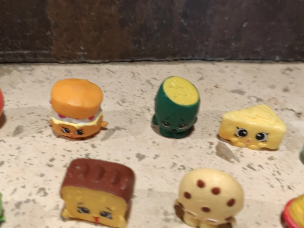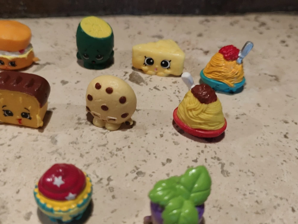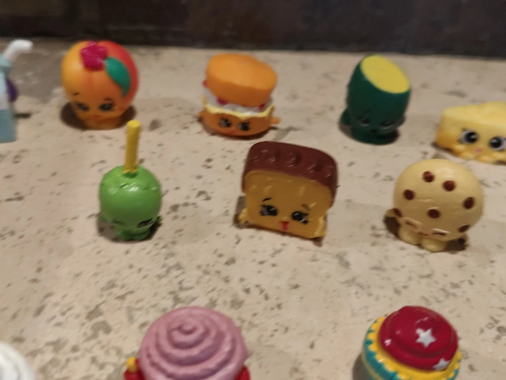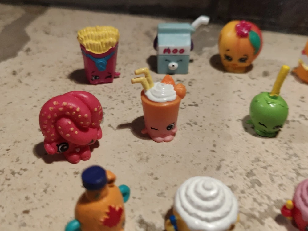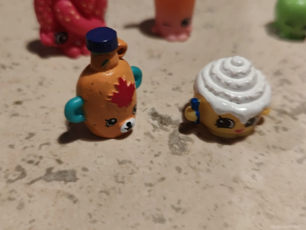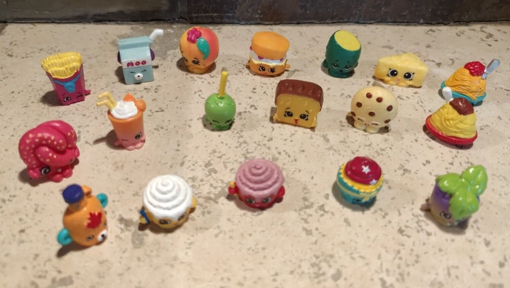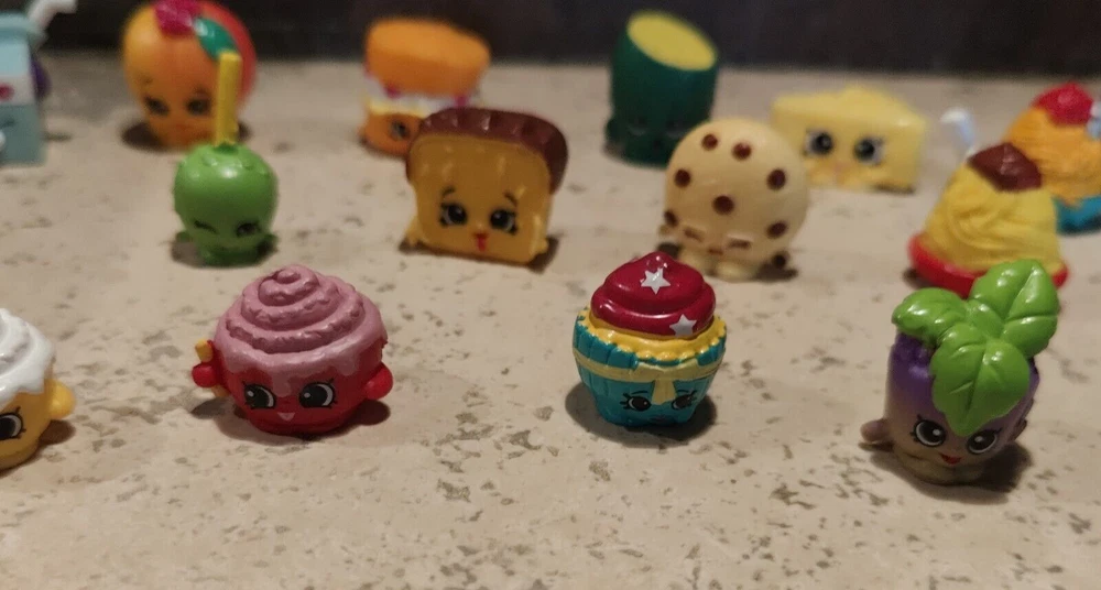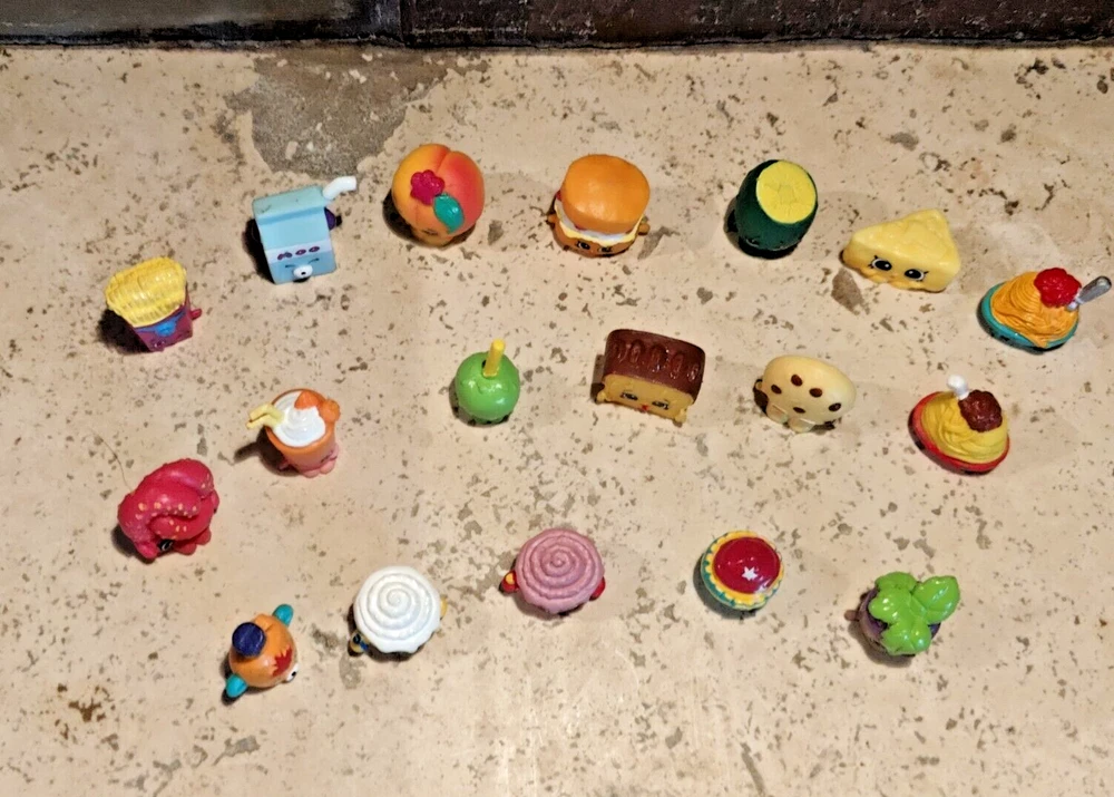Add some fun to your collection with this lot of 18 colorful Shopkins figures. These 1-inch plastic action figures are perfect for any fan of the Shopkins franchise and feature various characters from the series. All items are preowned showing typical signs of wear from age and use. The bear syrup bottle at the front left does have some discoloration/marks on the front. (toy8)