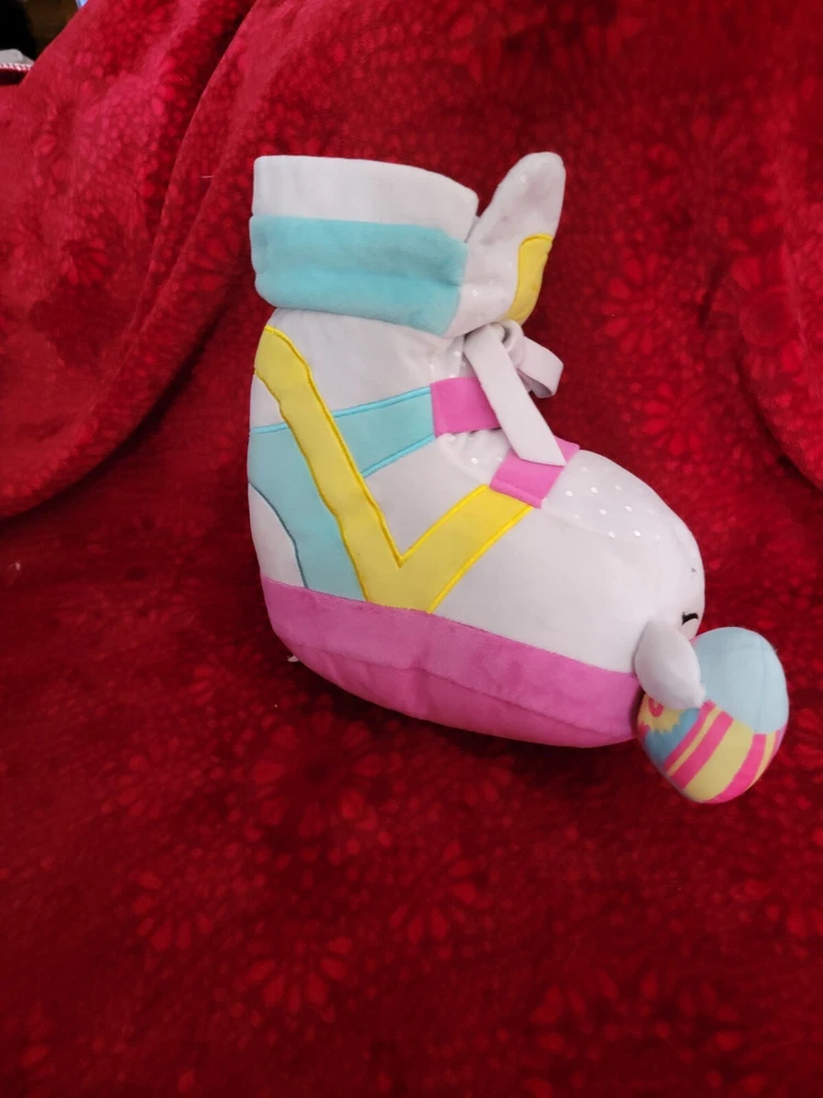 Pet friendly home. Normal wear and tear. The Shopkins Sneaky Wedge Sneaker Plush Stuffed Animal Toy is a 6 inch plush figure from the Shopkins Shoppies line by Moose Enterprise. This toy is based on the character Sneaky Wedge, a food-themed character from the Shopkins TV show. It is suitable for both boys and girls and is part of the Shopkins franchise, featuring cute and colorful designs.