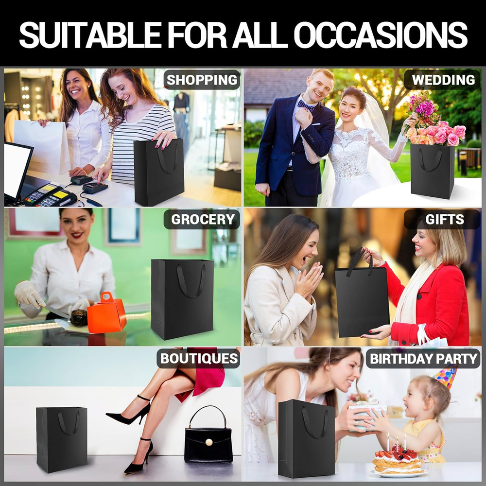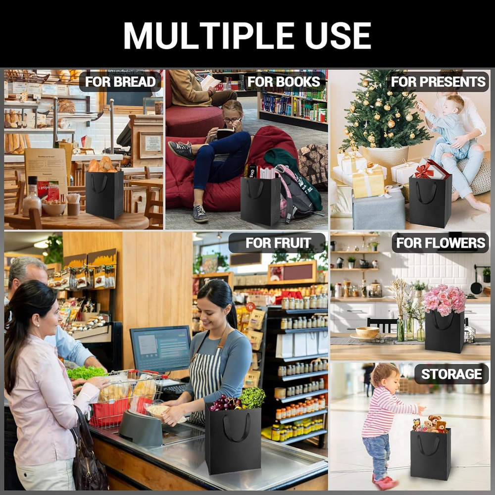 【Medium Size】7.8 x 3.9 x 11 inches(pack of 20), kindly suggest you to choose the appropriate bags by referring to the 2nd picture for the size details. 【Heavy Duty】 Reinforced and flat bottom makes our craft bag stand well on heavy load. They are sturdy and can be trusted with breakable gifts. 【Reusable & recycled】 Made with thick Recyclable biodegradable kraft paper, they are eco-friendly and can also be disposable. 【Cloth Handles】Cloth handle is stronger than normal paper handle, and also provides you a more comfortable feeling on heavy load. 【Multiple Use】Great as gift wrapping bags for party favors such as birthday, wedding, christmas. Also suitable as shopping and take out bags for retail, merchandise, business,lunch packing, kitchen, restaurant, and food storage. Product Description 1 Premium Quality Paper 2 Wide Cloth Handles 3 Heavy Duty 4 DIY Available Click the Pictures to Explore Add to Cart Add to Cart Add to Cart Add to Cart Customer Reviews 4.5 out of 5 stars 19 4.6 out of 5 stars 259 4.7 out of 5 stars 738 4.6 out of 5 stars 478 4.8 out of 5 stars 166 Price — $25.49 $ 25 . 49 $22.49 $ 22 . 49 $15.71 $ 15 . 71 $26.87 $ 26 . 87 Sizes 12x6x16 inch 9.8x5.1x12.6 inch 7.8x3.9x11 inch 5.9x2.3x7.8 inch 3 Sizes Pack 20/25/50 20/25/50 20/25/50 20/25/50 20/25/50 Multi Colors ✔ ✔ ✔ ✔ ✔ Reusable ✔ ✔ ✔ ✔ ✔ Recycled ✔ ✔ ✔ ✔ ✔
