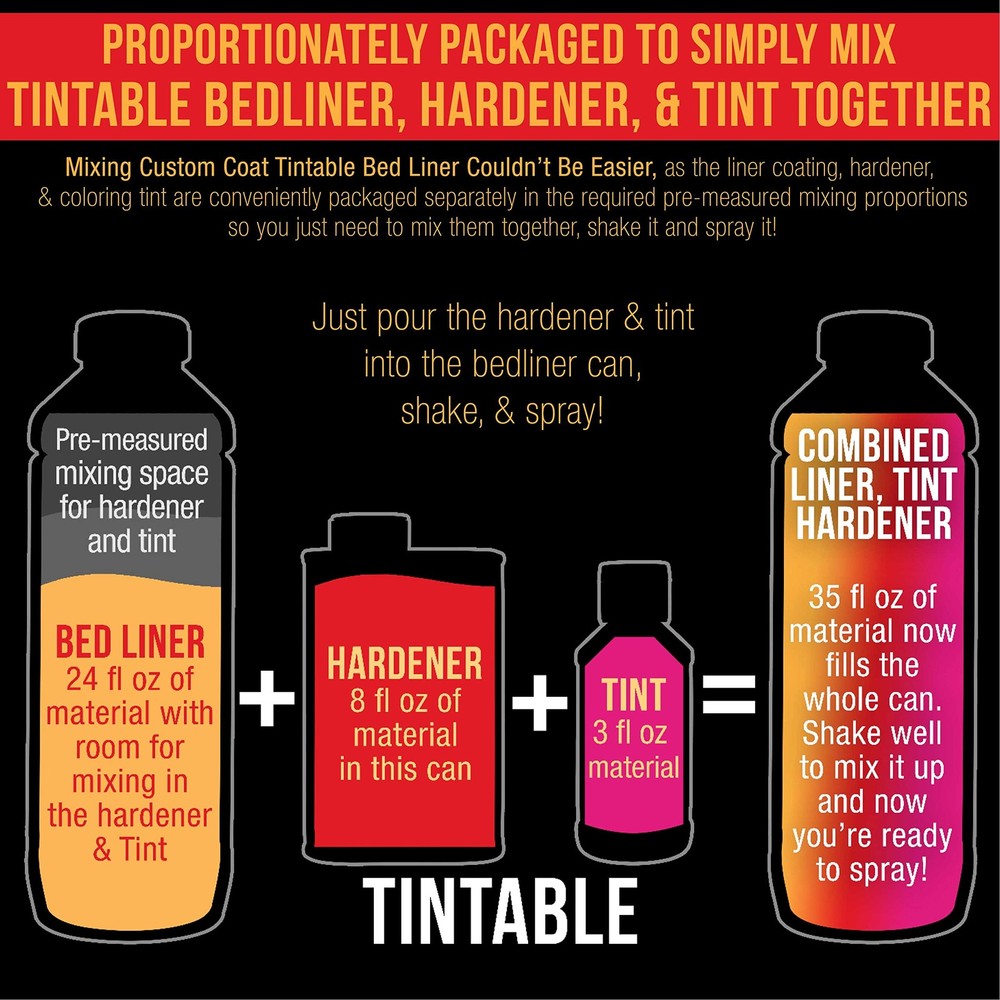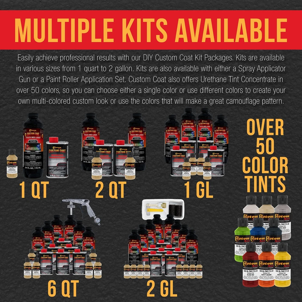 Professional Custom Coat Spray-On Truck Bed Liner 1 Quart Kit. Custom Tintable Color Kit Includes: 1 - 21 fl. oz. Cans of Tintable Truck Bed Liner Base, 1 - 8 fl. oz. Cans Custom Coat Standard Hardener and 1 - 3 fl. oz. Bottle of Basecoat Color Tint. Estimated coverage is 110 to 130 square feet @ 10 mils wet film thickness. Custom Coat Truck Bed Liner is a premium durable long lasting textured protective coating that can tolerate extreme climatic temperature conditions. It is heat, UV resistant and waterproof, so it protects coated surfaces from rust. Use it to help dampen sounds and vibrations. Custom Coat was developed to provide a great looking durable yet flexible textured surface and is a heavy duty 2 part urethane coating that is easy to apply. It provides the ultimate surface protection for almost any application. Unlike other protective and bed liner coatings Custom Coat is a flexible material that will resist chipping, while providing impact protection and abrasion resistance. These features and benefits make it perfect for its most popular application as a truck bed liner. Custom Coat is a very versatile product that can be used for endless amount of applications. Use it on truck beds, entire vehicle exteriors, chassis, bumpers, commercial vehicles, equipment and trailers. It's also great for home uses as non-skid coating for floors including garage floors, concrete, wood, steps, walkways, wood decks, docks, bath tubs, basement floors, walls, tool boxes and engine compartments. Easily achieve professional results with our DIY Custom Coat Kit Packages. Kits are available in various sizes from 1 quart to 2 gallon. Kits are also available with either a Spray Applicator Gun or a Paint Roller Application Set. Custom Coat also offers Urethane Tint Concentrate in over 50 colors, so you can choose either a single color or use different colors to create your own multi-colored custom look or use the colors that will make a great camouflage pattern.