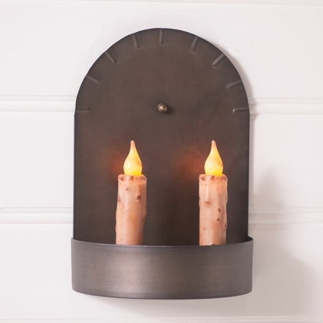 Here is a new colonial candle sconce called the short sconce, made of tin and has a distressed smokey black finish, holds 2 small battery candlesticks that are NOT INCLUDED, Beautiful in its simplicity, the warm glow of this sconce provides a hearty country welcome to every room in your home, from entryway to family room. A versatile decorating accessory, it is perfect either alone or as part of a wall grouping. Measures 9.5-Inches high and 6.5-Inches wide and 4-Inches deep For use with a regular or battery taper which is sold separately Solid metal construction Made in the USA
