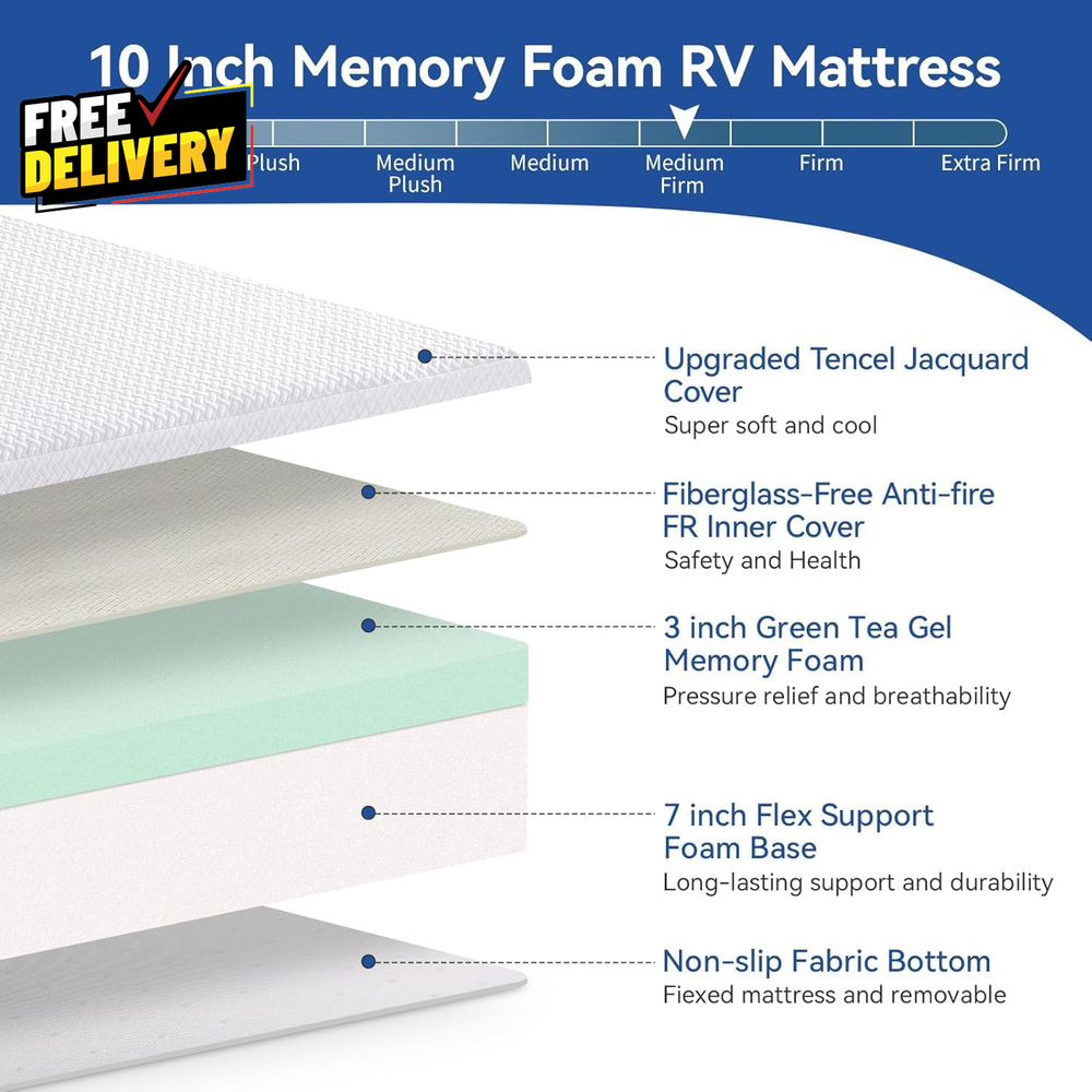 Store New Arrivals Add to Favorite View Feedback Contact Short Queen RV Mattress 10 Inch with Tencel Cover Premier Cooling Green Tea/G... Description ❤️【QUALITY MEMORY FOAM MATTRESS】: Cool Gel Mattress in a Box with luxurious Tencel removable cover, softer and cooler, fiberglass-free, premier cooling gel/green tea memory foam, hug your shape to soothe you to sleep. Experience the luxury of high-quality CertiPUR-certified foams. Perfect family gift for Camper. ❤️【UPDATED TENCEL FIBERGLASS-FREE COVER】: The green tea gel mattress with a breathable and soft jacquard Tencel cover, is smooth and comfortable, softer and cooler, to allow you to also enjoy a safe deep sleep in summer. Zipper near the back, machine washable. Zipper near the back, machine washable. ❤️【CertiPUR-US RV MATTRESS】: Our memory foam and fabrics have been safety evaluated to comply. The bed mattresses are perfect for your RV/Camper/Trailer/Truck, From camping to everyday living, this mattress will give you and your family a great night’s sleep. ❤️【PRESSURE-RELIEVING & STRONG SUPPORT】: The firm mattress for back pain conforms to the body, with breathable green tea and cooling gel memory foam to control odors, and you awake refreshed. This high-grade foam of the bottom provides spinal support and keeps the sleeper's muscles relaxed. Item model number White Mattress Style White Color White-rv-10'' Cover Material Tencel Number of Layers 2 Top Style gel_top Item Weight 30 pounds Fill Material Memory Foam Model Name White Mattress Age Range (Description) Adult Construction Type Memory Foam Special Feature Pressure Relief, Green Tea Gel, Breathable, Removable Cover, Low Motion Transfer Product Dimensions 75"L x 60"W x 10"Th Item Weight 30 Pounds Item Firmness Description Medium Firm ABOUT US Prior to making any purchase from our store, we’d like to introduce ourselves. My name is Shahzad Yaqub , and I am the proud owner of Epic Emporium Deals , located in the great state of Illinois, USA. I have been an active and trusted eBay seller since Jan 14, 2025 . At Epic Emporium Deals , we are committed to offering competitive prices and top-quality products . Our extensive collection features a wide variety of items, including media such as books, movies, music, and games , as well as electronics, toys, sporting apparel, clothing, tools , and general home and garden essentials —and much more! If you have any questions or require assistance, please don’t hesitate to reach out. Your satisfaction is our priority, and we look forward to providing you with an exceptional shopping experience. SHIPPING We are always working hard to ensure your package arrives as soon as possible. Please understand that some factors like weather, high postal traffic, and the performance of shipping companies are outside of our control. We offer free shipping to the lower 48 states and ship within 2 business days of payment, usually sooner. We do not accept P.O. Boxes. Please provide a physical address. For shipping outside of the continental USA, we only use eBay's Global Shipping Program. The item is shipped to IL and then sent to the rest of the world. International customers are responsible for all duties and taxes. Continue to 'check out' to calculate costs for shipping the item to your country. Messages regarding eBay's Global Shipping Program MUST be directed at eBay EXCLUSIVELY. RETURNS We do not accept returns under normal circumstances. However, we will gladly consider a return if the item is received broken or if the wrong size is sent to you. In all other cases, returns will not be accepted. CUSTOMER SATISFACTION We try our very best to make sure every customer is completely satisfied. If there's a problem, message us! We're happy to help.