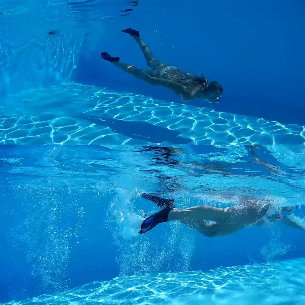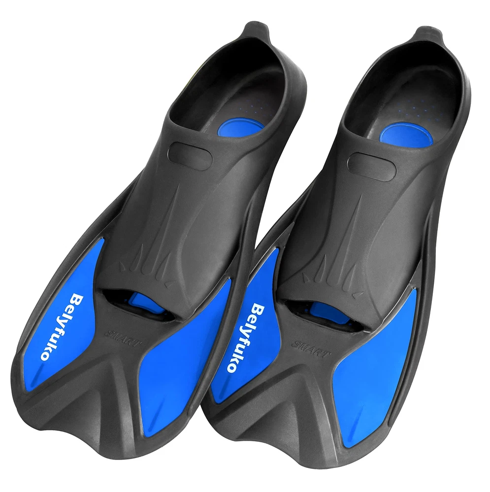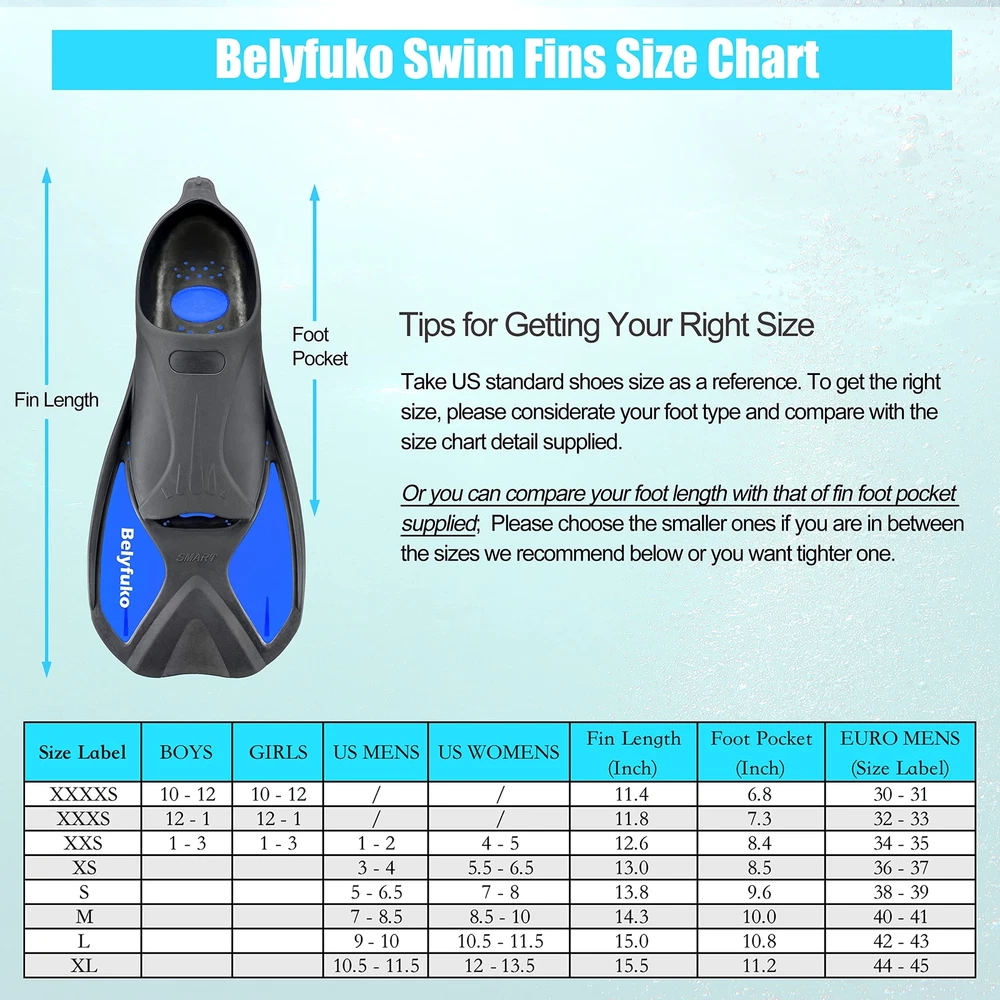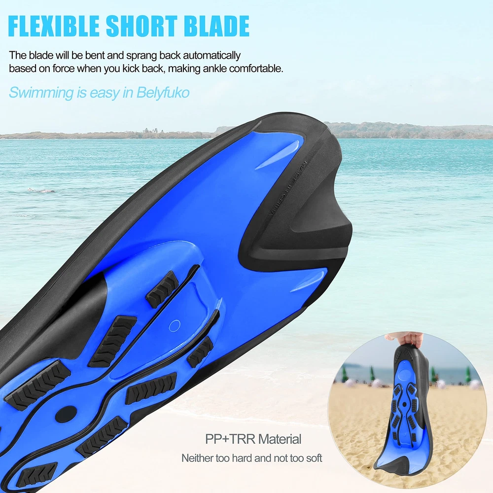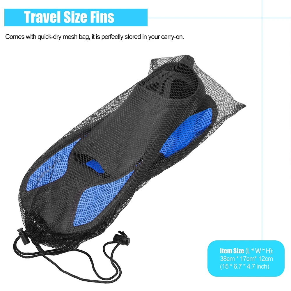COMFORTABLE FIT - Lightweight design with soft ergonomic foot pocket and short blade, swim fins offers you great deal of comfort and help you develop a stronger, faster flutter kick during snorkeling diving and swimming. PORTABLE AND COMPACT SIZE - Travel size short flippers, and quick-drying mesh bag included, it enables you to carry these fins conveniently in your carry-on and avoid purchasing or renting fins on your vacation. UNIQUE BLADE AND SOLE DESIGN - Combined with durable PP and TPR material, short reflective dual-composite fin blades are designed for excellent training, powerfull and styling. Non-slip and regular groove sole offers you fast swimming speed and safer walk on seaside or poolside. WIDELY USE - Perfect flippers for pool use and for swim training, snorkeling and swimming. The "left" and "right" fins are the same and so they can fit types of feet, including men's, women's and the younth's, making them can be shared with families and friends under similar feet. TIPS for SIZE CHART - To get the suitable snorkel fins, just know your feet length and with that of the foot pocket in the size chart supplied; Order the bigger size if you like to wear fins with booties/neoprene socks or have wide feet.