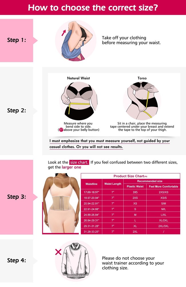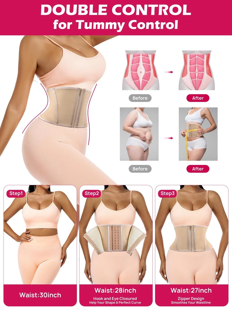 HOW TO CHOOSE RIGHT SIZE: The waist trainer is different from our other clothes, please read our size chart before your purchase, our size chart is in the product pictures. And please choose the size according to your real waist circumference. 7 INCHES SHORT TORSO: The super short torso of the waist trainer shorter than the 9 inches the 11.5 inches torso waist trainer. It is more suitable for very short torso, short short torso, young girls, the women of small body. And the waist cincher is also fit for working on office, outdoor sports, gym fitness, yoga, postpartum belly abdomen corsets etc. The 7” short torso waist trainer will make your body more flexible than other long torso waist training. SHAPE HOURGLASS FIGURE: The waist corsets made off the high elastic latex, and have a great function of ductility, high compression, reduce waist circumference up to 3-5 inches instantly; And shape the perfect hourglass waist and tighten abdomen for you. BURN EXCESS FAT: It is also sport and fitness waist trainer, it can be worn for fitness, used for postpartum belly abdomen corsets, increase blood flow to the torso and help you burn excess fat of your abdomen to lose weight. The slimming tummy control also can reduce your stomach. KEEP CORRECT BODY POSTURE: The spiral steel bones of the tummy trainers are covered in front and back for offering support, smooth waist line, and make your waist stiffness and keep your straight and prevent slouching. And the waist shaper also can protect back and reduce back pain.