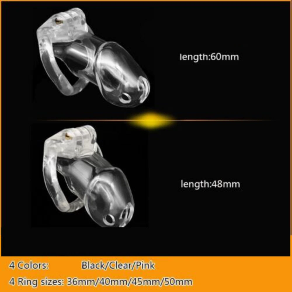 D iscreet Package Feature: A new locking system "Magic Locker" enables the closing of the device without a padlock. Even more discreet. No more hump under your pants. Material: 100% Resin Model: with 4 rings Colors: Clear, Black, Pink Measurement: Short Type: Ring size: with four rings. 36 mm / 40 mm / 45 mm / 50 mm Cage: about 48mm (1.89inch)in length and about 34mm in diameter Number of air Vent: 3 Long Type: Ring size: with four rings. 36 mm / 40 mm / 45 mm / 50 mm Cage: about 60mm (2.36inch) in length and about 34mm in diameter Number of air Vent: 3 The whole set contain s: 4 rings 1 Cage 1 Magic Locker (high quality) and 2 key Notes: Please feel free to contact us if you have any questions. If you contact us out of office hours, we will get back to you the next business day. Thank you for your understanding. Thank you for your visit!