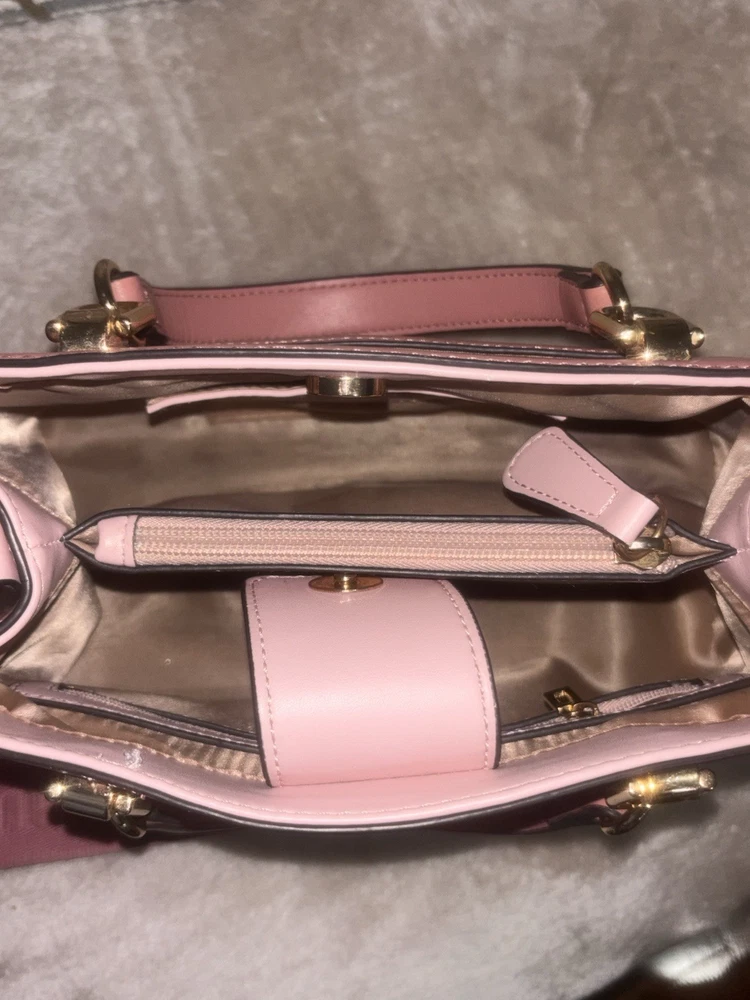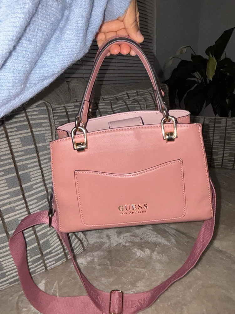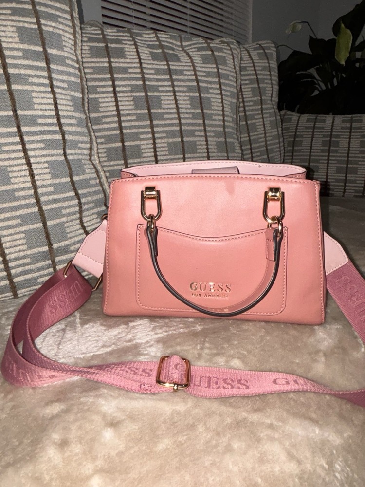 The product is a small rectangle shaped shoulder bag and handbag by Guess, featuring gold hardware and an adjustable shoulder strap. The exterior is made of faux leather in a pink color with silver hardware accents. The bag has a zip closure and is lined with fabric. It is not vintage and is designed for women who appreciate designer accessories. Perfect for carrying everyday essentials, this stylish bag combines fashion and functionality with its adjustable strap for added convenience.