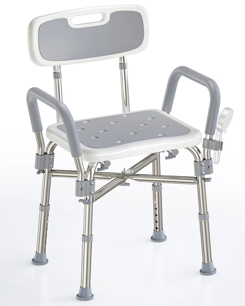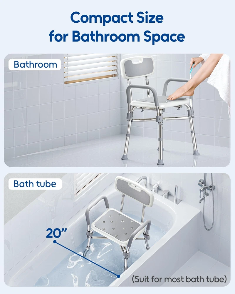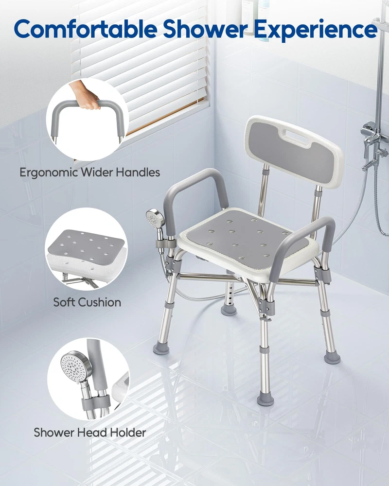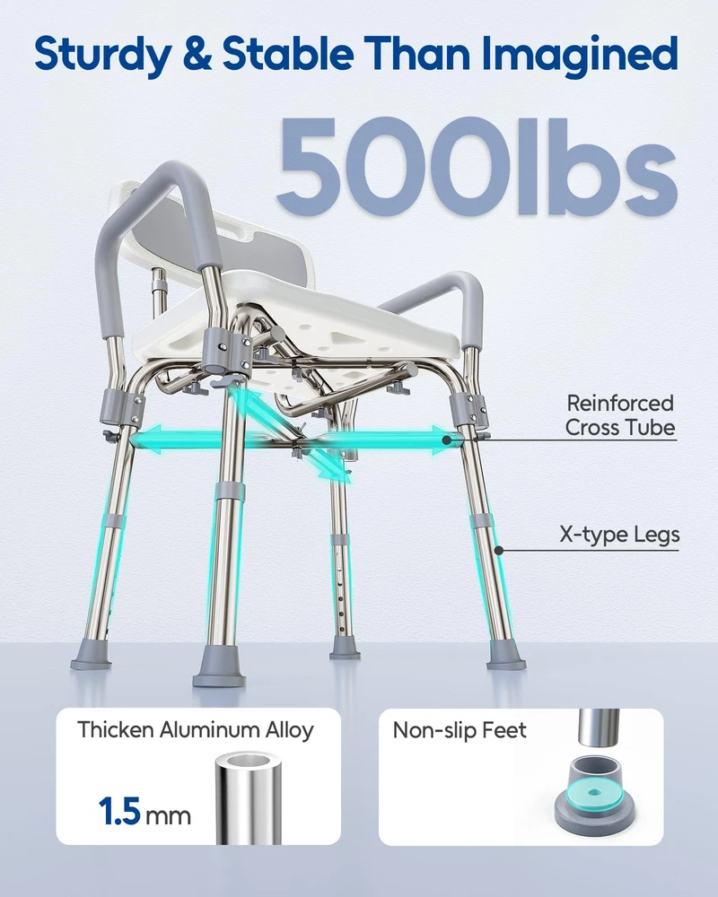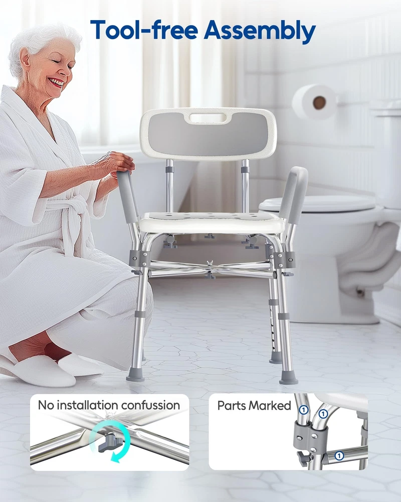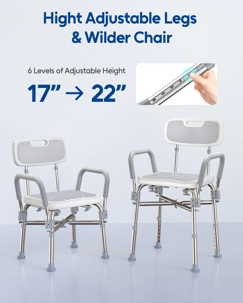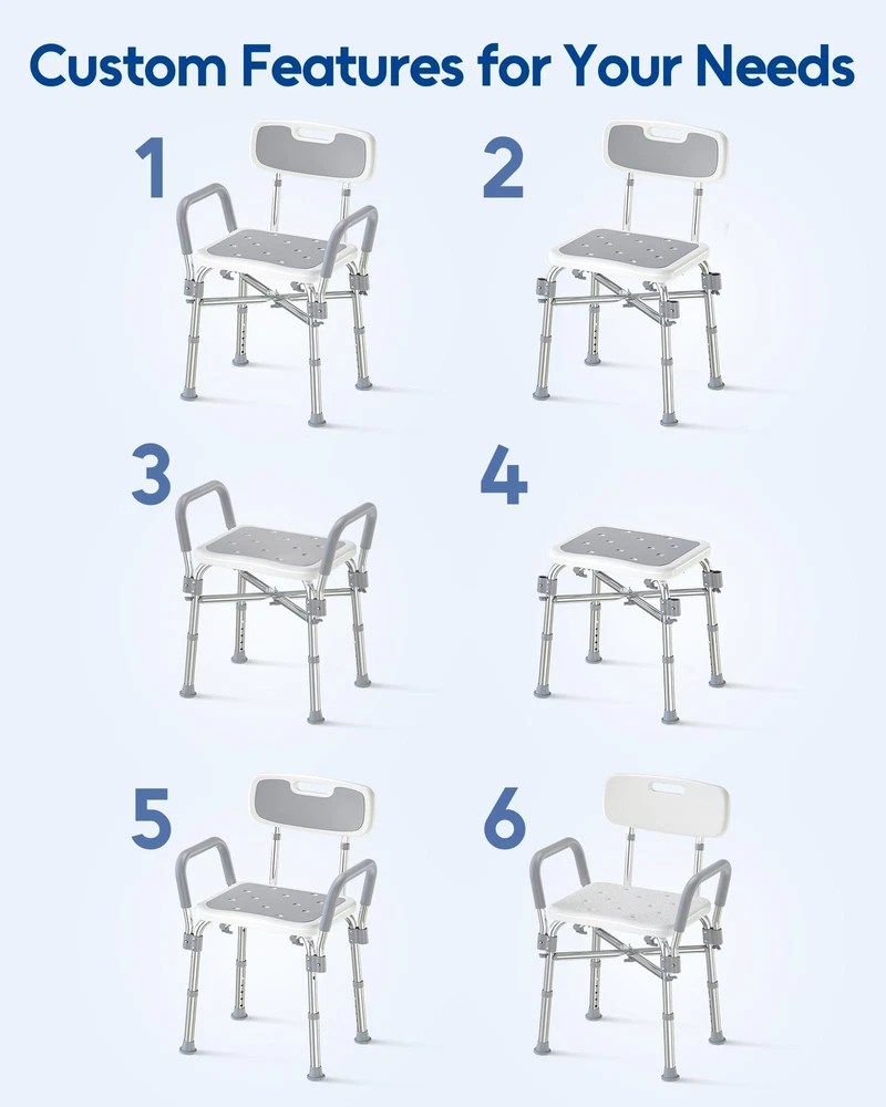 Safety-Assured Crossbar Design: Engineered for peace of mind, this shower chair features 1.5mm thickened crossbars and lab-tested X-shaped legs, offering up to 500 lbs weight capacity. Stay secure while sitting with unmatched stability in any bathroom setting Customized Comfort and Fit: Adjust the seat height between 17" and 22" to suit your preferences. The 22" extra-wide padded seat provides ample support, ensuring comfort for elderly, disabled, or bariatric users Versatile Assembly to Match Your Needs: Easily transform the chair into 6 different setups, whether you prefer a shower stool, bench with arms, backrest, both arms and back, padded seat, or bath chair with reinforced crossbars. Personalize it based on your mobility needs and space requirements Effortless Assembly with Labeled Parts: Clear number labels on each accessory make assembly intuitive and frustration-free. Follow the step-by-step manual or video guide, and set up the chair in minutes—no tools required Thoughtful Details for Enhanced Comfort: The anti-slip padded seat ensures stability and is detachable for easy cleaning. With 4 rubber feet reinforced by metal cores, the chair stays steady while protecting your bathroom floor. A convenient showerhead holder keeps your hands free, adding extra convenience to your routine Trusted USA-Based Customer Support: Enjoy a 1-year warranty and lifetime support from our dedicated USA-based team. Reach us by phone from Monday to Friday (9 AM–5 PM PST) or via email 24/7 for fast, friendly assistance