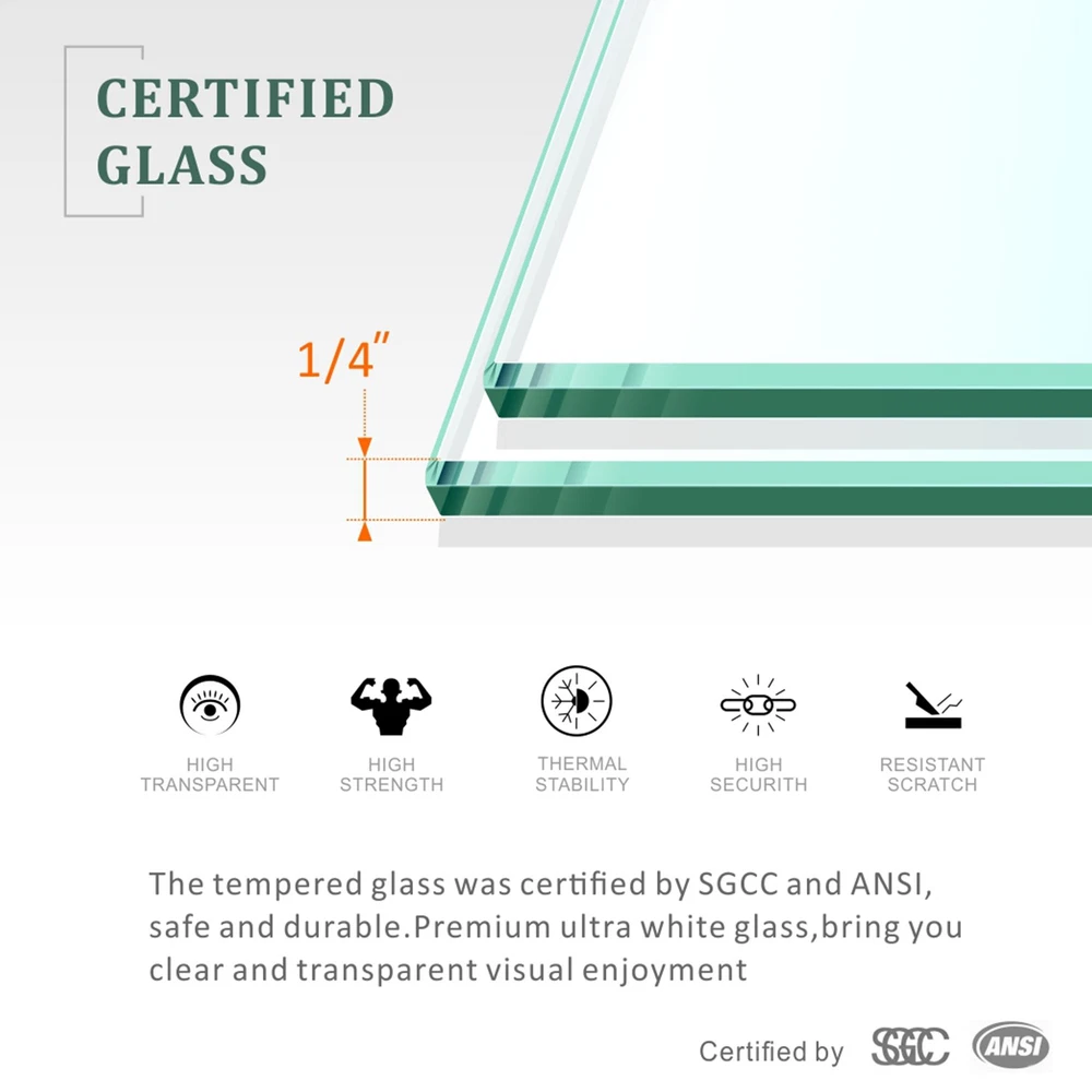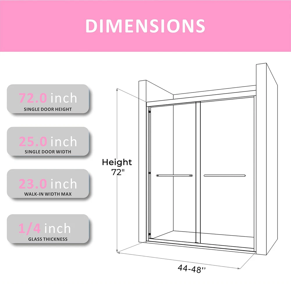 Sliding Door Glass 48" W x 72" H; Width Adjustment Range: 44 in. to 48 in. by cutting guide; Color: Brushed Gold Double Sliding Design The 48 inch shower door with 2 long handles allows 2 shower glass panels move smoothly and easily.The aluminum alloy material makes them more sturdy and resistant to rust. Safety Clear Glass Sliding door glass with 1/4" (6mm) tempered glass is certified by ANSI, not easy to break, making your shower enclosure safer and less stressful Splash-Proof Design The 48 inch brushed gold shower door adopting high-quality materials and structural design to enhance waterproofness, the splash-proof structural design at the bottom can effectively prevent water leakpage, and each glass panel side is covered with a waterproof sealing strip to effectively prevent water splashing and leakage, thus keeping the rest of the shower enclosure dry. Easy Assembly The sliding door glass can be installed left and right, with an illustrated instruction and all necessary fixings supplied, easy to install. Professional installation is recommended DOUBLE SLIDING GOLD SHOWER DOOR TEMPERED GLASS SHOWER DOOR ADVANCED DETAILS DESIGN As a professional bathroom product manufacturer, we always provide you with better products and more efficient services, but the following service terms need to be known to you: 1: If you find some problems with the product after receiving the goods, please do not discard the product, because we need you to provide pictures or videos of the relevant faults to better serve you. 2: Please note that we do not bear the installation/assembly costs. If you find a fault during the installation of the product, we will not bear or reimburse this cost because we stipulate that all parts must be checked before booking. 3: Delivery within the United States only, excluding Alaska/Hawaii, Puerto Rico, Guam, Saipan, APO/FPO, US Protectorates and PP Box. Usually the delivery time is 1 to 7 business days. If you still have not received the goods after 7 business days, please contact us immediately and we will track the order for you. 4: If your goods are damaged when delivered, you must refuse the order and describe the damage on the receipt. Just fill in "the goods are damaged". If you accept the goods and the damage is not noted on the receipt, we reserve the right not to refund or replace your goods. If you are not satisfied with your purchase, please contact us within 7 days. Please note that there is a 20% restocking fee and all shipping and handling charges are the responsibility of the buyer.