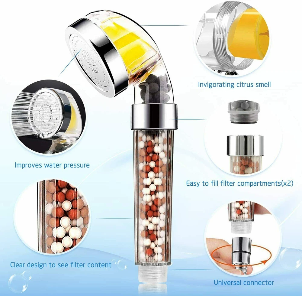 20-Stage Shower Filter with Cartridge, Universal Shower Head Filter for Hard Water Shower Water Filter Removing Chlorine Fluoride Heavy Metal Odor Advanced Features · 20-Stage Filtration : KDF 55, Alkaline Ceramic Balls, Activated carbon, Calcium Sulfite and other filtering materials ensures best effect of water quality purification. 20 Stages filter materials can effectively reduce chlorine, heavy metals, rust, sand and other sediments. · Replacement Cartridge : Capacity of each cartridge is 12,000 gallons of water, which provides clean and odorless water and can be used by a family of four for 2months/1Pack. · Essentials For Body Care : High output shower filter removes unpleasant odors & impurities, relieves fatigue quickly, slows down aging and makes your skin smooth. This shower filter water softener acts as a moisturizer, purifier, softens and provides the best feeling for sensitive skin. · Complete Compatibility : Universal shower filter can be installed in any home, it uses a standard 1/2" thread type. Fit for most rain shower heads, fix shower heads and hand showers. · Easy Installation Without Any Tool : Installation takes only a few minutes and no tools required even if you are not good at hand. We also supply free teflon tape and 2 rubber washers to avoid leakage. Package list: 1 * 20 Stages Shower Filter 1 * Teflon Tape 2* Water-proof Pads 1 * Instructions DB1 Filtered Shower Head with Pausing Switch High Pressure Hand Held Detachable and Removable Filter Showerhead Advanced Features ENJOY A COMFORT AND LUXURY SHOWER AT HOM E-New high pressure ionic filtration shower head,increase the activity of the water,and provide you with soft & good water,which could help you release the itchy feeling of dry skin,reduce the split hair,Get smoother skin,reduce oil secretion,increase cell viability,improved cleaning effect and hair loss prevention. Enjoy Spa experience with high pressure ionic filtration shower head! Unlike other product which have a close to 90° angle,The New Ionic Shower Head has a curved head which allows the spray to flow in a more vertical direction.The injection angle is more reasonable.The head is detachable but no longer separated,reducing the water leakage coefficient. Specifications: 3 modes:Rainfall, Massage and Jet Material:Stainless Steel,eco-friendly PC materials and bioactive mineral stones Dimensions:9.25 in* 3.15 in Weight:450g Package Contents: 1 xDB1 handheld filter shower head ( Hose not Included ) DB2 Filtered Shower Head – Handheld High Pressure Showerhead, Softens Hard Water, Filters Chlorine & Fluoride, Helps Dry & Itchy Skin, Purifies Rust & Dust, Standard Fit, Easy Installation Features PREMIUM QUALITY - Made of High Standard Scratch Resistant Chrome Plated Premium ABS Plastic, which is durable, lightweight, BPA free and heat resistant. The micro nozzle technology makes the outlet holes smaller and denser, increasing the speed of the water flow, thereby increasing 200% water pressure and steady the water flow. Up to 30% water saving than the ordinary showerhead. EXTRAORDINARY SHOWER - Unlike other showers, our filtered shower head removes chlorine, chloramines, significantly reduces fluoride, and softens well water by filtering up to 99.9% of sediments, heavy metals, dissolved solids present in hard water such as lead, rust, and iron TOOL FREE INSTALLATION - G1/2’’ fits any standard size hose and easy to install. Without tools and a handyman, it allows you to install the shower head as easily by yourself. REVITALIZING YOUR BODY - Our shower head attachment increases pH level and effectively helps hair loss, dry scalp, itchy skin, dandruff, and eczema. Shower with filtered water reduces stress, improves mood and sleep quality Package Included 1 x DB2 Filter Shower head(Filter Pre-installed) DB3 Vitamin C Filtered Shower Head & Replacement Filters, Universal Beauty Water Softener Filtered Shower Head - Chlorine, Hard Water, Fluoride Filter for Dry Skin, Hair Loss Vitamin C Shower Head is a powerful shower filtration system for your bathroom, designed to remove up to 99.9% of chlorine, fluorine, chloramines, sulfur, sediments, and heavy metals presented in hard water such as lead, chrome, copper, magnesium, and iron. Our shower filter softens your water, dramatically improves your hair, skin, nails condition as well as helps with hair loss and skin dryness. Showerhead purifier is made of abs plastic wand and 3 parts – scented filter cartridge with tourmaline stone and zeolite mineral stones. Special Features: - 4 Scented Replaceable Filters Set (Vitamin C, Lavender, Jasmine & Rose) - 1 Mineral Balls Set (Tourmaline, Zeolite, Ceramic Balls) - Aroma Filter Cartridge will need to be replaced every month - Mineral Beads Need to be Replaced Every 4 Months SUGGEST:Replace the lime balls every 4 months. DB4 Filtered High Pressure Shower Head, Handheld 3 Mode Function with ON/OFF Switch, Mineral Filter Shower Heads Soften Hard Water About this item 【 Soften hard water 】The filter stone of the eco-shower head is composed of minerals and anionic particles, forming a three-layer filter system, which can reduce the hardness of the water by 50%. It can improve the dry and allergic skin, prevent hair loss and make hair softer. Very suitable for use in hard water areas 【 Water saving and Pressure increase 】The shower head adopts a new type of micro-sprinkler technology to make the water outlet smaller and denser, increasing the water flow speed, thereby increasing the water pressure. Save up to 30% of water at the same time 【 3 Adjustable modes 】This powerful shower head has different adjustment modes (rainfull/Massage/Jettimg), each mode has a different water pressure, allowing you to enjoy the special SPA shower in the bathroom Experience 【 Unique ON/OFF Switch 】The unique switch function of the shower head can help you turn off the water flow when bathing, and will not affect the water temperature when it is turned on again, which