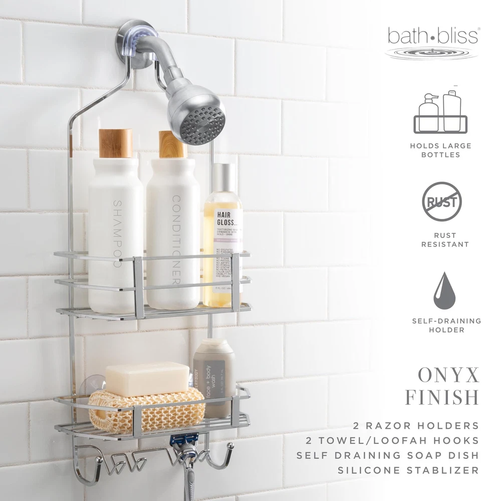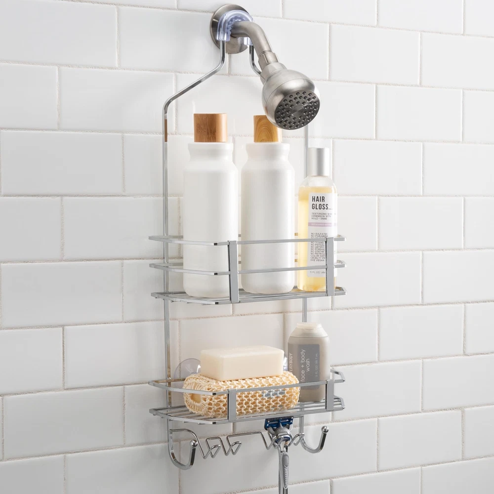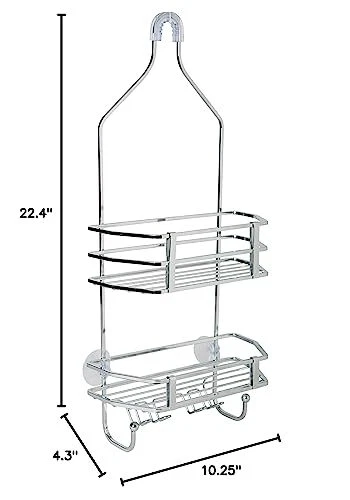 Keep your shower organized with the shower caddy. Mounts easily over your shower head and with 2 suction cups this caddy stays stable keeping all of your items sturdy. Features 1 deep and 1 shallow basket for multiple storage options. Complete with 2 hanging hooks for towels and 4 built in hooks for razors and toothbrushes. The rust resistant iron construction design allows this item to last! Rust resistant finish tier shelving Six accessory hooks- 2 hanging hooks, 4 built in hooks for razors and toothbrushes Suction cups and non-slip neck grip for added stability Features 1 deep and 1 shallow basket for multiple storage options Dimensions:10.25"x 22.4"x 4.3"