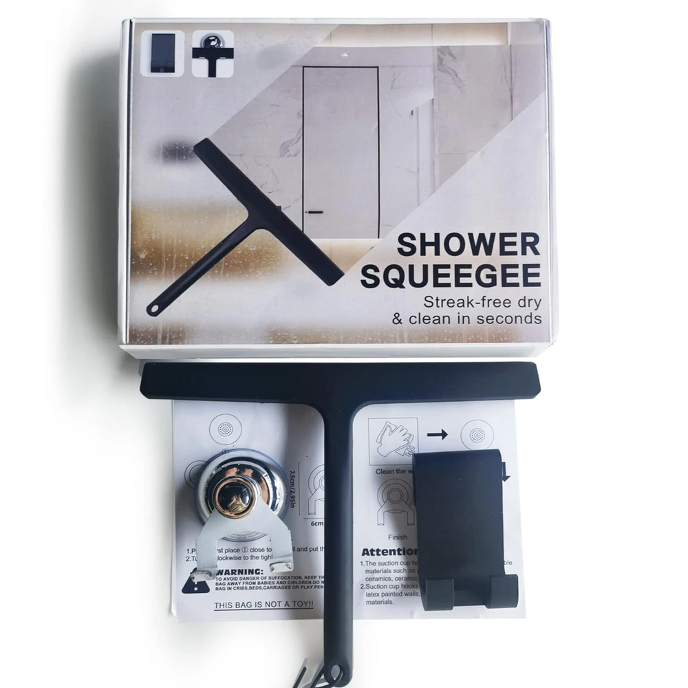 Shower Squeegee Glass Doors,Silicone Shower Squeegee Glass Cleaner Tool Holder 【General Cleaning Tools】The silicone shower squeegee is not only suitable for glass window cleaning, but also suitable for glass walls, car windshields and windows, shower doors, foggy bathroom doors, marble counters and vanities, mirrors and tiles or whatever you may want any other place. 【Double Hook Design】Comes with 1 silicone hook and 1 stainless steel suction cup hook, no drilling or gluing required, you can easily remove and reinstall the suction cup hooks to smooth surfaces, such as window panes, tiles, shower walls, shower Glass surfaces, doors, compartments and enclosures are very convenient for daily use and storage. 【Shiny and Streak-Free】No pushing required, the silicone squeegee for window cleaning removes water well without leaving streaks. Use it with household cleaners to make glass surfaces sparkle. 【Efficient Size】The silicone shower squeegee measures 9.45 inches x 7.87 inches and has a slim design that fits any space,perfect for your home. 【No Noise】The unique design and soft silicone material allow this wiper blade squeegee to fit perfectly on glass or tiles, so you don't have to worry about making squeaking sounds during the cleaning process, giving you a comfortable cleaning experience. Shipping We offer FREE shipping on all orders! We ship within Three business days of payment, usually sooner. We use a selection of shipping services such as UPS, FedEx, USPS etc. We only ship to the lower 48 states, no APO/FPO addresses or PO Boxes allowed. Local pickups and combined shipping options are not provided at this time. Return You can return a product for up to 30 days from the date you purchased it. Any product you return must be in the same condition you received it and in the original packaging. Please keep the receipt. Payment We accept payment by any of the following methods: PayPal Please pay as soon as possible after winning an auction, as that will allow us to post your item to you sooner! Feedback Customer satisfaction is very important to us. If you have any problem with your order, please contact us and we will do our best to make you satisfied. Contact Us If you have any queries, please contact us via ebay. We usually respond within 24 hours on weekdays. Please visit our eBay store to check out other items for sale! Thank you for shopping at our store.