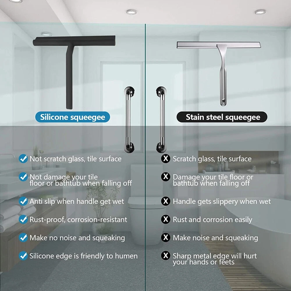 New Shower Squeegee Glass Wiper Scraper Shower Squeegee Cleaner With Silicone Holder Bathroom Mirror Scraper Glass Cleaning About this item: 【Material】: Our shower squeegee is crafted from metal core and wrapped entirely by premium silicone. It is wear-resistant, durable, and ensures much longer lifespan than rubber blade. 【Easy to Clean】: The silicone blade will be in touch well with the surface you clean, effectively pull water and soap film quickly and easily off of all flat. 【Easy Insallation】: Bathroom shower squeegee requires no tools and no hardware mounting.The window wiper come with a flexible hook for easy storage on shower heads, caddies, towel bars and more. 【Multi Usage】: The glass shower squeegee can wipe water drops off any flat smooth surfaces quickly and easily. Perfect for bathroom wall, soapy shower doors, tiled surfaces, fogged mirrors and smooth car windows. 【No Damage & Scratching】 - Solf silicone rubber scraper is friendly to glass surface. with the specail holder design, the squeegee can be hung over the top of the shower glass, no suction cups or sticky holder needed which end up falling off and damaging your bathtub or tile surface, even hurting your feet.