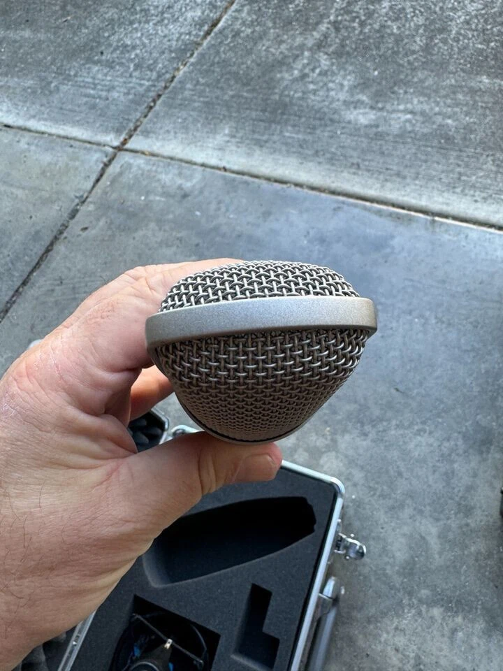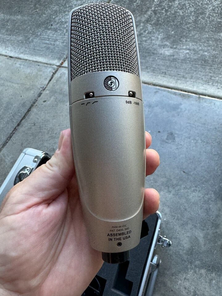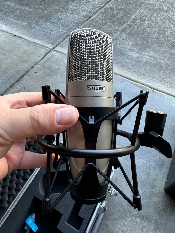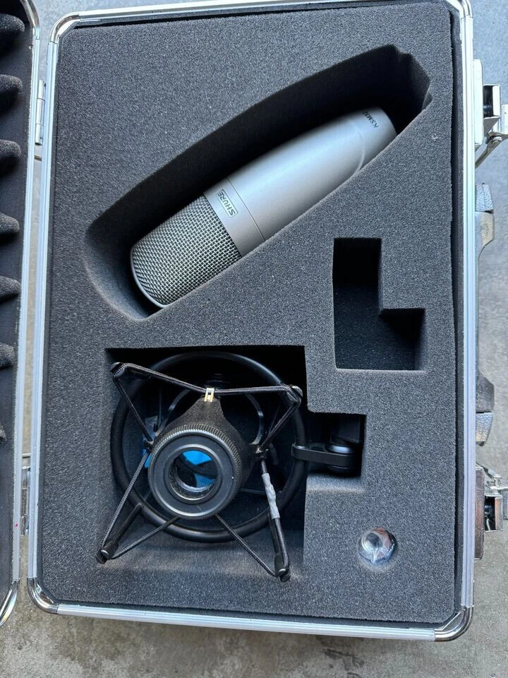 Used Shure KSM32 large diaphragm condenser microphone with shock mount in case. Champagne color. Please see photos.