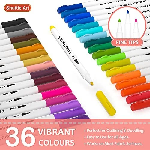36 Colors Fabric Markers, Shuttle Art Fabric Markers Permanent Markers for T-Shirts Clothes Sneakers Jeans with 11 Stencils 1 Fabric Sheet, Permanent Fabric Markers for Kids Adult Painting Writing MULTIPLE-COLORS: Shuttle Art 36 fabric markers set contains 36 bright colors including Red, Yellow, Blue, Green, Orange, Purple, Black, Pink and More! Fine bullet tip provides extremely precise control for underlining, outlining, writing, doodling or any DIY projects on fabric or paper. MULTIPLE-USES: These eye-popping colors have rich vibrant pigments for intense colors on almost all fabric and they can resist fading and water that makes your art project looks great for a long time without worrying about color fading. Perfect for clothing, sneakers,handbags and more! FREE BONUS: Free Stencil and Fabric sheet for coloring are coming with fabric markers set which can bring more fun and inspiration to your creations. SAFE: Shuttle Art fabric markers are Non-toxic, Acid-Free, and conforms to ASTM D-4236&EN71. SERVICE GUARANTEE: Your satisfaction is our top priority, please rest assured to purchase our products. If you are not satisfied with our products or have any questions, please feel free to contact us at any time.