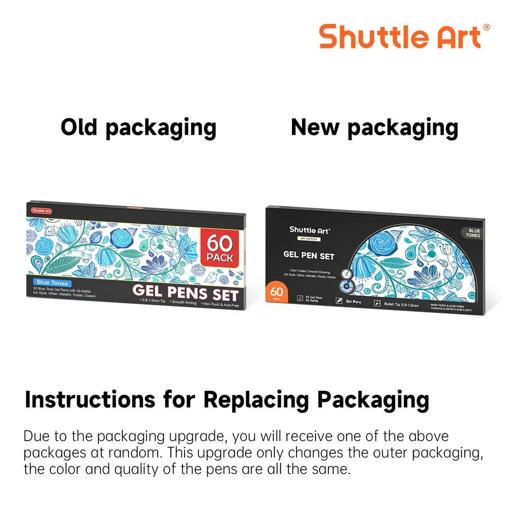 Shuttle Art 60 Pack Blue Tone Gel 1 Count (Pack of 60), 60 Product Features 60 PACK BLUE TONE GEL PENS: Shuttle Art gel pens set has 30 unique blue tone colors with 30 matched refills, including 4 color types: glitter, metallic, pastel, classic. Specific color tone is suitable for nature, landscapes, animals and so on. COLOR CODED: Refills are coded for easy identifying. Each refill in the pen matches the number of the additional refill, convenient for you to replace it. And there will be a bonus blank color chart, which will be more efficient for you to choose what you need. SMOOTH WRITING: Without skipping or bleeding, 0.8mm-1.0mm ballpoint tip can produce smooth and no skipping fine lines for coloring. Just enjoy the wonderful writing experience. VARIETY OF USES: The coloring gel pen set is non-toxic and acid-free. Conforms to ASTM-D4236. Great for bullet journaling, sketching, drawing, writing, coloring books and any other designs on Scrapbooks, School Projects, Party Invites, Greeting Cards, DIY Decor & Letters to Friends & Family. Shipping: Shipping is complimentary within the lower 48 US States. We Do Not Ship to PO/APO Boxes, HI or Alaska We Do Not Ship Outside of the Continental US All items ship within 24-72 hours of Payment For large items that require Freight shipping a valid phone number is required to call and schedule your delivery Terms of Sale and Feedback: Feedback is extremely important to us and eBay If you are satisfied with our transaction, please take a moment to leave Positive Feedback. YOUR Satisfaction is our #1 Priority! If there are any issues, PLEASE contact us BEFORE leaving a neutral or negative rating so that we may resolve any concerns. We PROMISE we can make you happy if you give us a fair chance. Returns / Concerns: All items qualify for returns within 14 - 30 days of receipt. Buyer is responsible for return shipping on any item that is not damaged Please be sure this is an item you want before making your purchase. Customer Satisfaction is our TOP priority! All items are IN STOCK at time of listing. Inventory on eBay changes constantly and it is impossible to maintain a perfectly accurate count of all items. Please do not penalize us if we have to issue you a refund! Thank You For Your Business!
