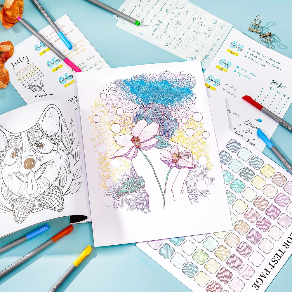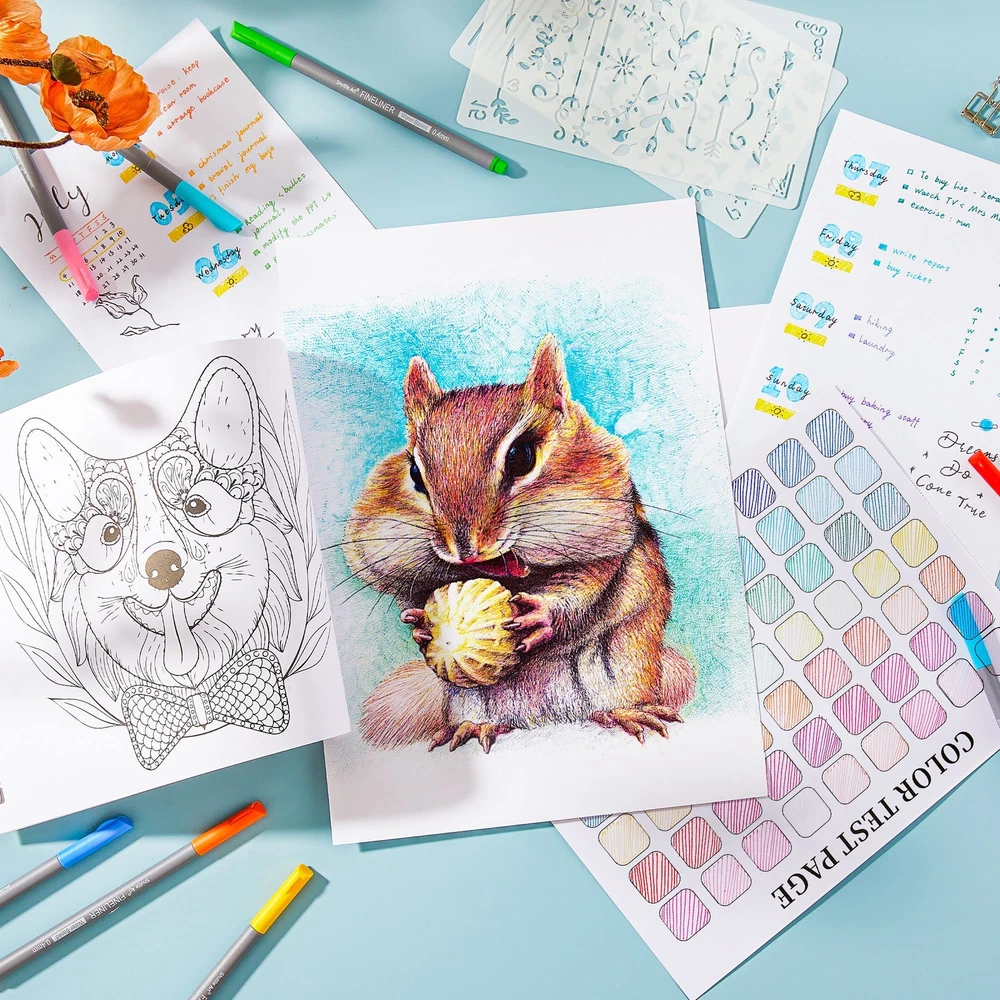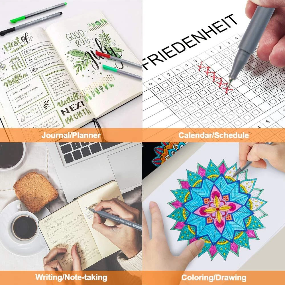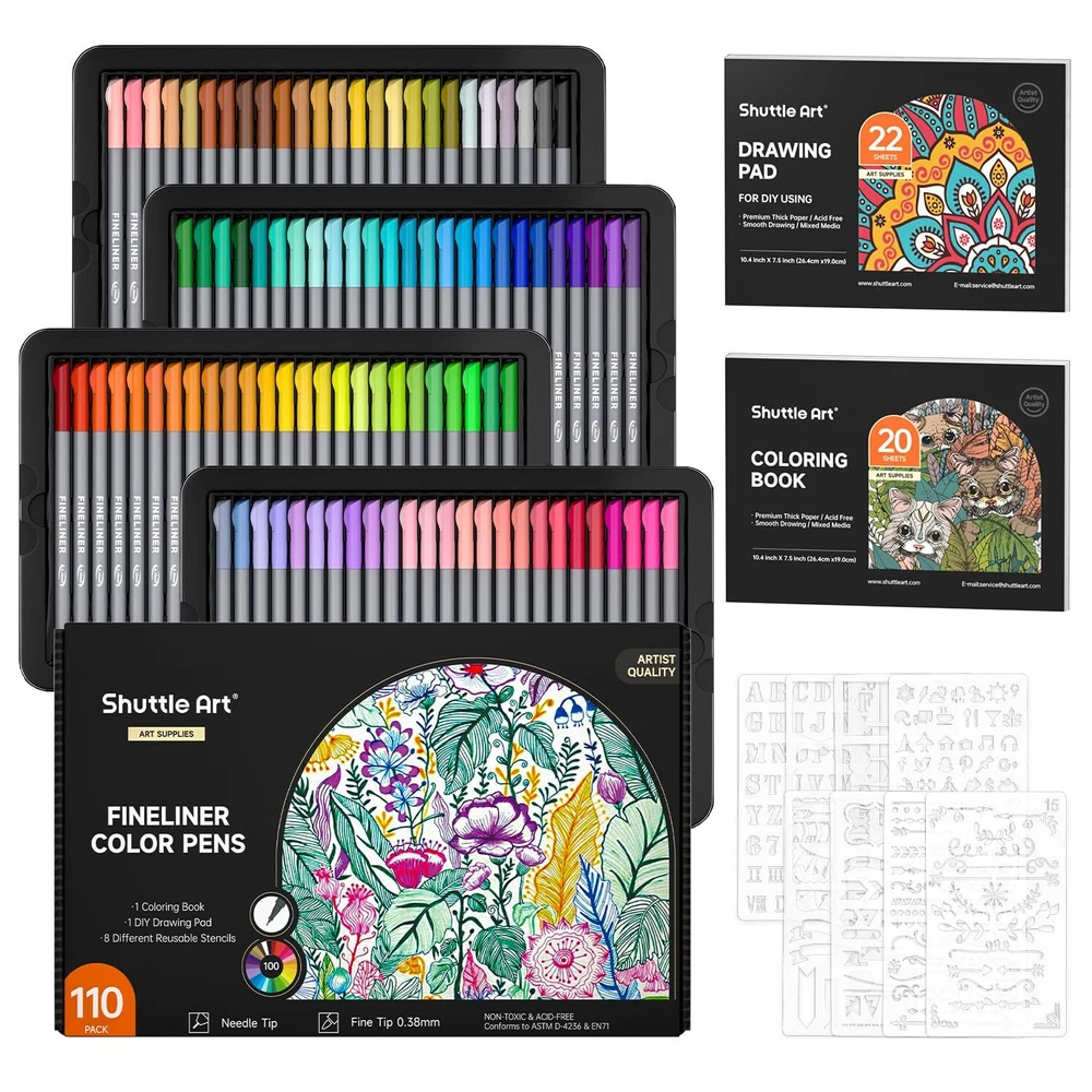 Shuttle Art Fineliner Colored Pens, 100 Colors 0.4mm Fine Point Pens with 8 Stencils & 2 Adult Coloring Books for Coloring, Drawing, Detailing, Writing Note Taking Calendar and Journal Art Projects THE GREAT FINELINER SET AVAILABLE: Shuttle Art Fineliner pack contains 100 unique, brilliant and gorgeous colors with 8 stencils and 2 adult coloring books making it the great set available on Amazon. Fineliner Pen have a 0.4mm extra fine fiber tip and great for sketching, card making, scrap booking, journaling and coloring. COMFORTABLE TO USE: Durable metal-clad tip and ergonomically round shaped barrel makes for a more comfortable grip. Artist quality ink is water-based, fast drying, odorless and blendable without bleeding. It’s safe as well, non-toxic. AMAZING CONVENIENT BOX PACKAGE: Fineliner Pens are organized in 4 individual black trays and stored in an exquisite cardboard box making them convenient to use and portable. Our Fineliner Pen Set is perfect for gift giving. BONUS COLORING BOOKS AND STENCILS: Includes a adult coloring book with stress relieving designs animals, flowers, paisley patterns and so much more. A DIY coloring book to locate colors for your project and free your art creation. 8 Different Stencils help to transform your boring pages into beautiful surprise SERVICE GUARANTEE: Your satisfaction is our top priority, please rest assured to purchase our products. If you are not satisfied with our products or have any questions, please feel free to contact us at any time.