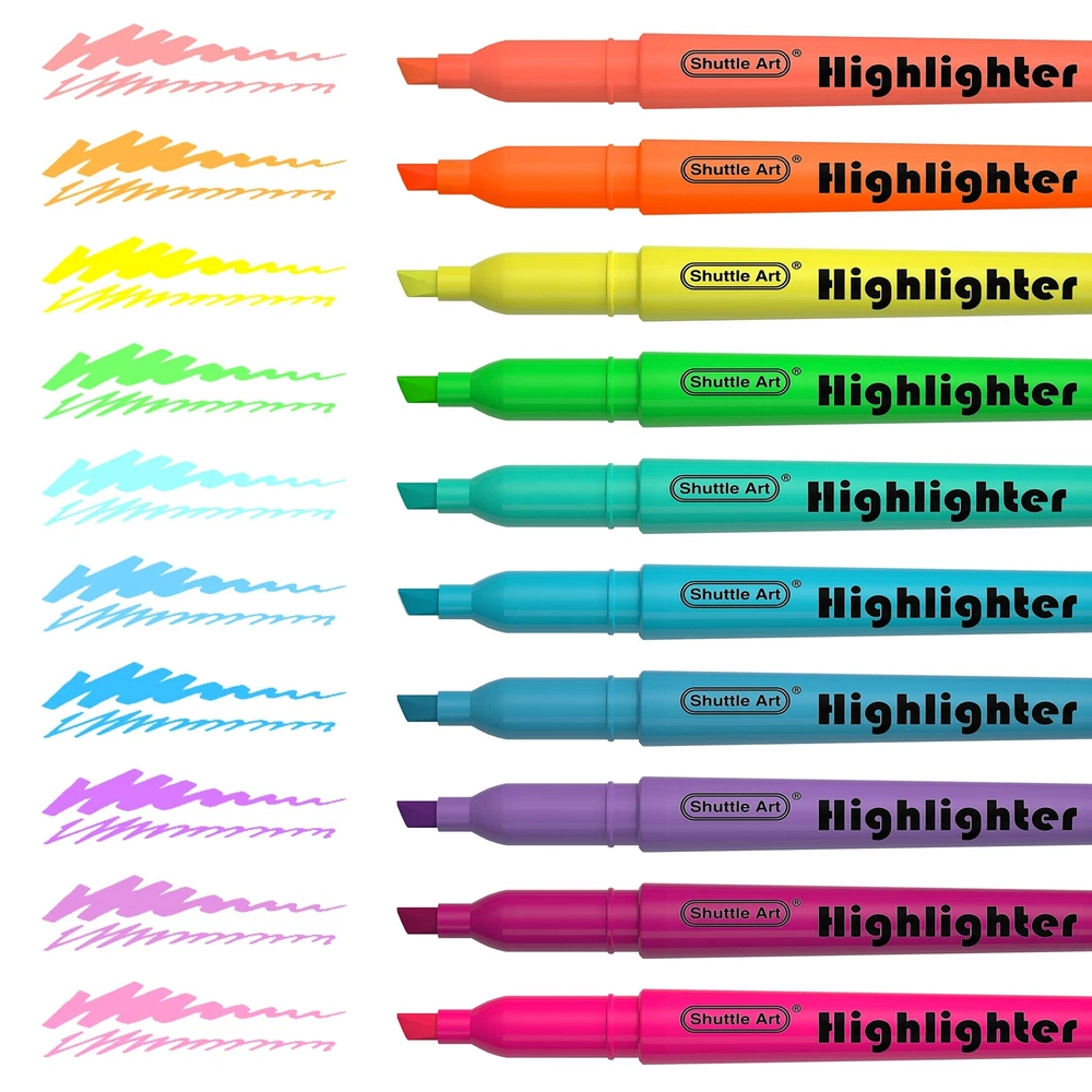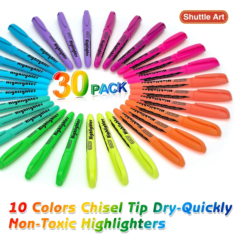 Shuttle Art 30 Pack Highlighters Assorted Colors, 10 Colors Chisel Tip Dry-Quickly Non-Toxic Highlighter markers for Adults Kids Highlighting in the Home School Office Shuttle art highlighters, 10 bright colors pack of 30 highlighter markers, include yellow, blue, teal, pale blue, pink, purple, violet, green ,orange and bright orange,no bleed. Bright, colorful, multi variety highlighting markers for adults or kids highlighting on bibles, assorted plans, journals,books, notes,or other office and school supplies. Durable, chisel tip highlighters can be used to highlight or underline won't fray and fade. Non-Toxic&Non Smear, Safe to use for any student, office worker and just about anyone (kids, adults etc.) Shuttle Art highlighters conform to ASTM D- 4236 & EN71. SERVICE GUARANTEE: Your satisfaction is our top priority, please rest assured to purchase our products. If you are not satisfied with our products or have any questions, please feel free to contact us at any time.