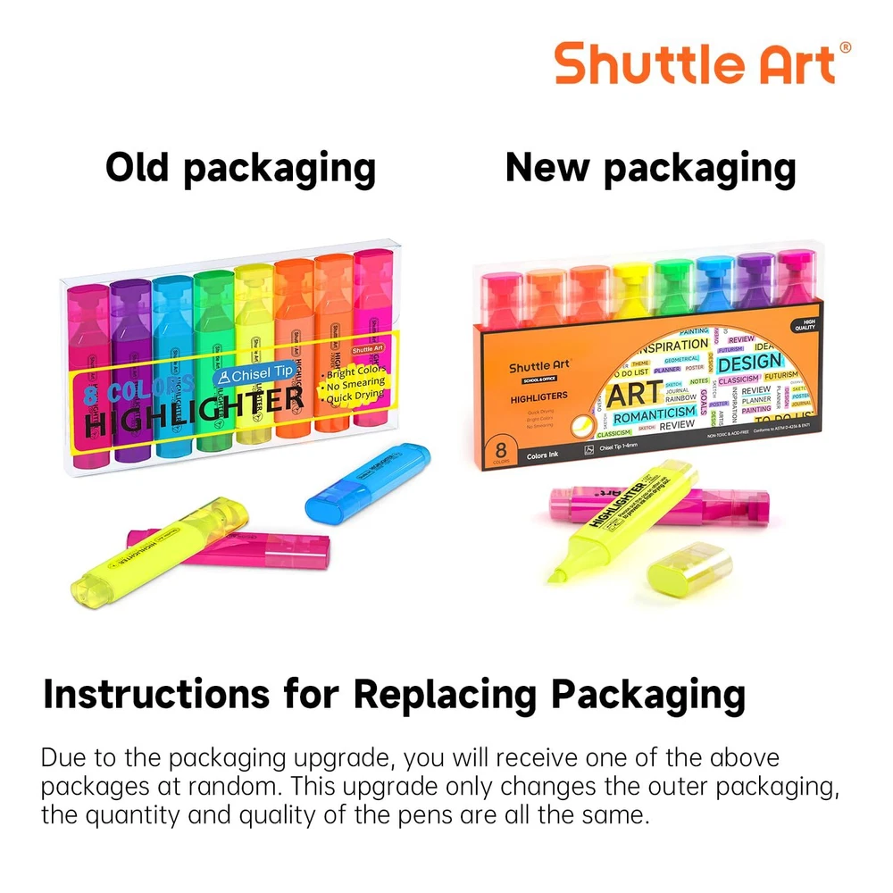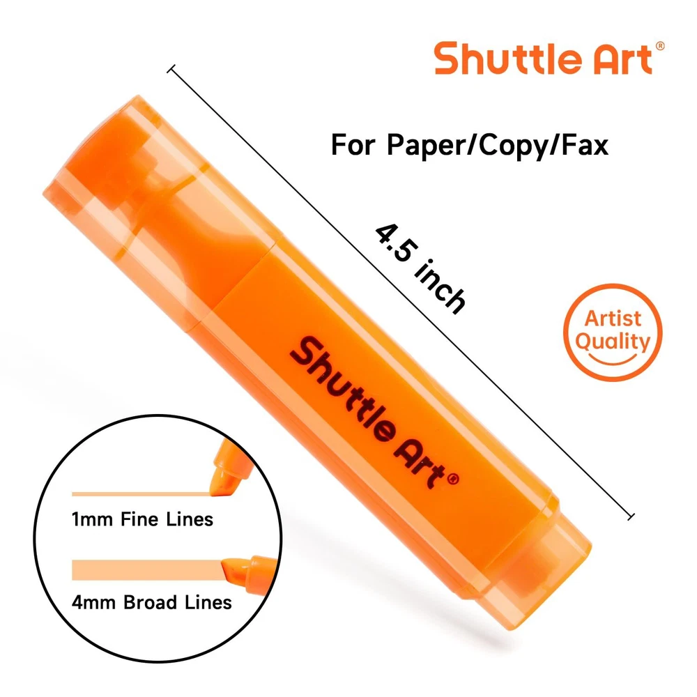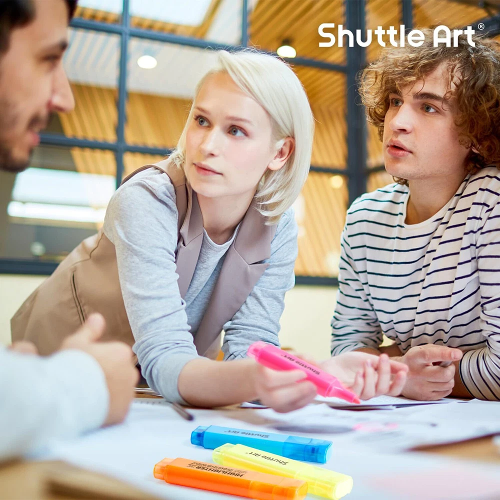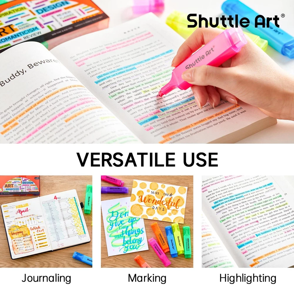 Highlighters, Shuttle Art 8 Assorted Colors Highlighter Pens, Chisel Tip Dry-Quickly Non-Toxic Highlighter Markers for Adults Kids Highlighting in the Home School Office ASSORTED COLORS FOR MULTIPURPOSE: Shuttle Art 8 bright fluorescent colors highlighters, including yellow, green, blue, pink, purple, violet, orange and bright orange, a perfect set for kids and adults emphasizing info on textbooks, faxes, copies, newspapers and assorted planners. NO BLEEDING & LONG-LASTING: Premium quick-dry ink drawing on words stay crisp and clear without smearing, leaking, fading or bleeding (let ink dry before highlighting). Each liquid highlighter is equipped with a durable pen cap to prevent ink from drying out for long-lasting use. Shuttle Art highlighters conform to ASTM-D4236. VERSATILE CHISEL TIP: Shuttle Art highlighter set with versatile and durable chisel tips are perfect for both broad highlighting and fine underlining with different needs. Narrow barrel shape of comfortable holding makes it suitable for both kids and adults. PERFECT GIFT CHOICE: These assorted highlighters are neatly organized in a compact package for easy taking along. Colored design allows you to recognize and identify each color easily. Trendy pastel colors are well popular among teens make the highlighters set a smart choice as back to school gift idea. SERVICE GUARANTEE: Your satisfaction is our top priority, please rest assured to purchase our products. If you are not satisfied with our products or have any questions, please feel free to contact us at any time.