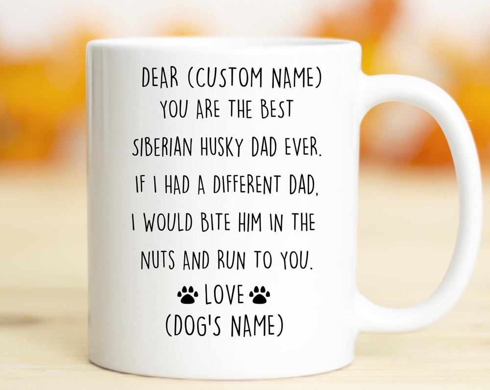 Siberian Husky Dad Birthday Gift Siberian Husky Dad Christmas Gift Husky Dad Valentine Siberian Husky Dad Appreciation Sib Husky Dad Mug Product Details.. This high quality 11oz. ceramic white mug has a premium hard coat that provides crisp and vibrant color reproduction sure to last for years. Perfect for all hot & cold beverages. The highest quality printing possible is used. It will never fade no matter how many times you wash it. Material: 100% Ceramic. Print both sides. Dishwasher and Microwave Safe. High Gloss + Premium White Finish. Printed in the U.S.A. Personalized & Custom. We support personalized and custom mug to add custom, when placing an order, you can add notes to the "order note" in shipping address section. Also you can contact us directly via message. Shipping Info. Ready to ship in 1 to 2 business days, All products are made-to-order and proudly printed in the United States. Shipped by USPS and DHL, You will receive your order in 5-7 days. Replace & Refund. All products are defective during shipping broken, chipped will be replaced free of charge. You are not satisfied with the product, we will refund 100% money to you. If any other issues arise, please do not hesitate to message, we would be more than happy to assist you.
