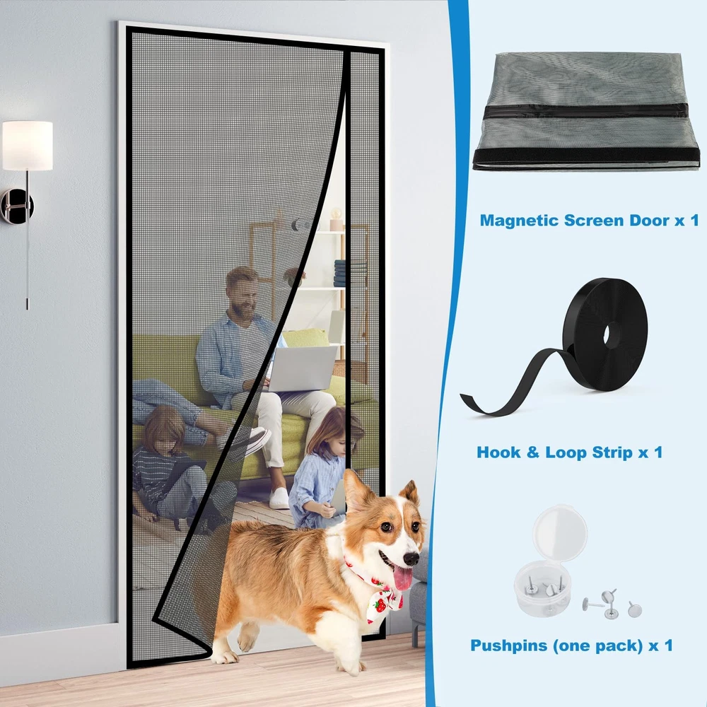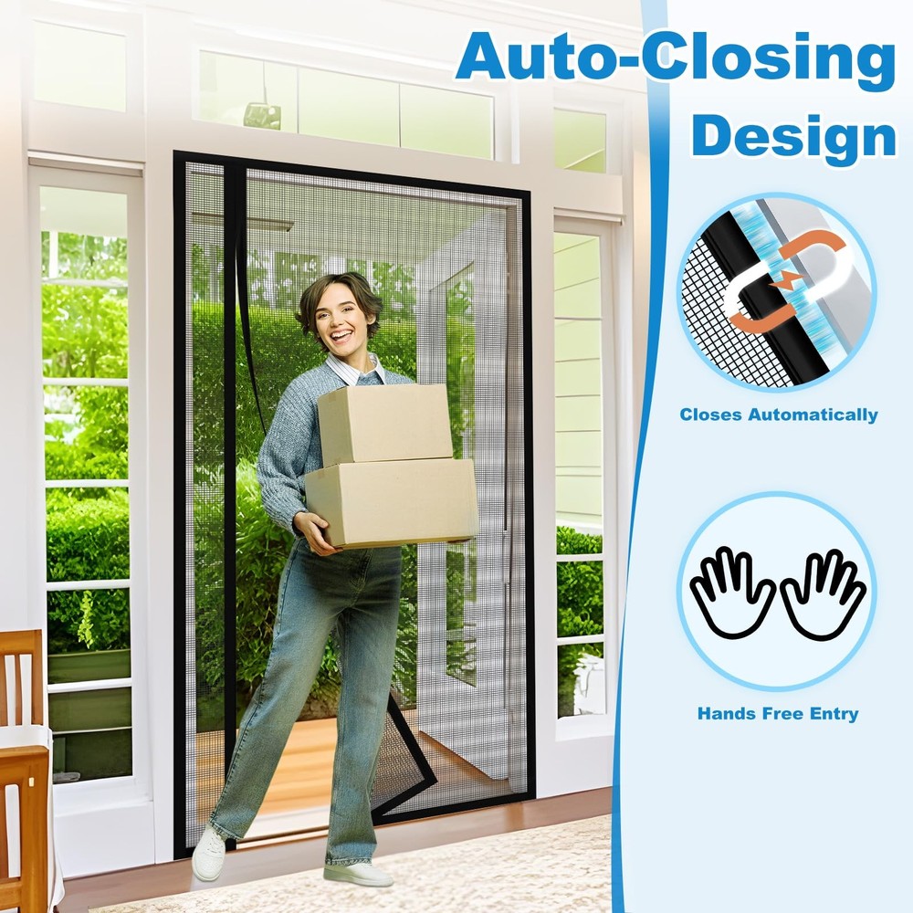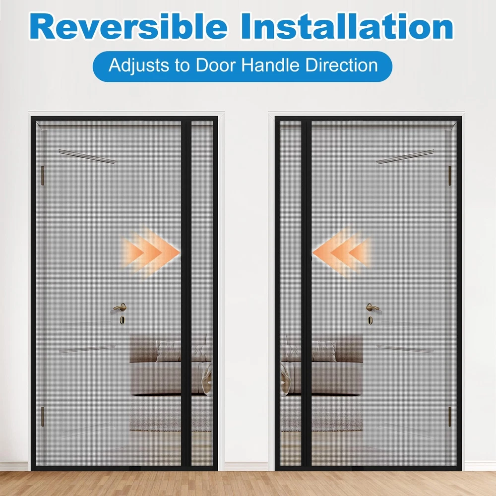 Reversible Left Right Side Opening Magnetic Screen Door Free Left&Right Opening Design:One reversible screen door mesh could open left and right at will, never worry about buying the wrong opening that doesn't fit the direction of your door opening. Multi-function Design:Let fresh air in while avoiding the entry of annoying creatures. Free your hands when going in and out. Pet-friendly, pets can easily enter and go outside the house. After passing,the magnet screen door curtain will close automatically. Magnetic Screen Door:Widely used for various door: front, patio, back, rear, interior, exterior, entry, deck, porch, balcony, glass, garage, sliding doors.BEFORE PURCHASING, please carefully measure your door size and order that size (ONLY door size,doesn't include door frame part). Hands Free Entry: Heavy duty magnets are sewn right into the seam to ensure a quick, automatic silent close every time. Even children and pets can easily walk through and open without using hands Left or Right Side Opening: Feature dual-sided hook & loop design, adjusting the side-opening direction based on your door handle position. your view is unobstructed and convenient for you and your family easy access Tear-Resistant Mesh: Made of heavy-duty polyester mesh, this material is tough enough to resist scratches, tears, and daily wear while staying breathable. It holds its shape in hot conditions and stands up to both curious pets' claws and harsh outdoor weather Magnetic Screen Door Size: Fits Doors 36" x 80" (Actual Mesh Size 38" x 81"), If your measured door size is equal to or slightly smaller than 36" x 80" (excluding door frame), the size is suitable. Please measure your door size before purchase to ensure fit Easy Installation: Simply use hook&loop to attach the magnetic screen to the door frame ,extra push pins are included for added security and strength; Easily remove the screen mesh and fold it for storage when not in use Wide Application: The door screen can keep the annoying creatures out and let you enjoy the fresh air and sunshine blowing in from outside; Suitable for patio door, front back door, balcony door, backyard door, sliding door, etc Quality Assurance: With a wide field of vision no longer has black lines from openings in the centre blocking your eyes, good light transmission and more durable performance. if you have any questions, Please feel free to contact us