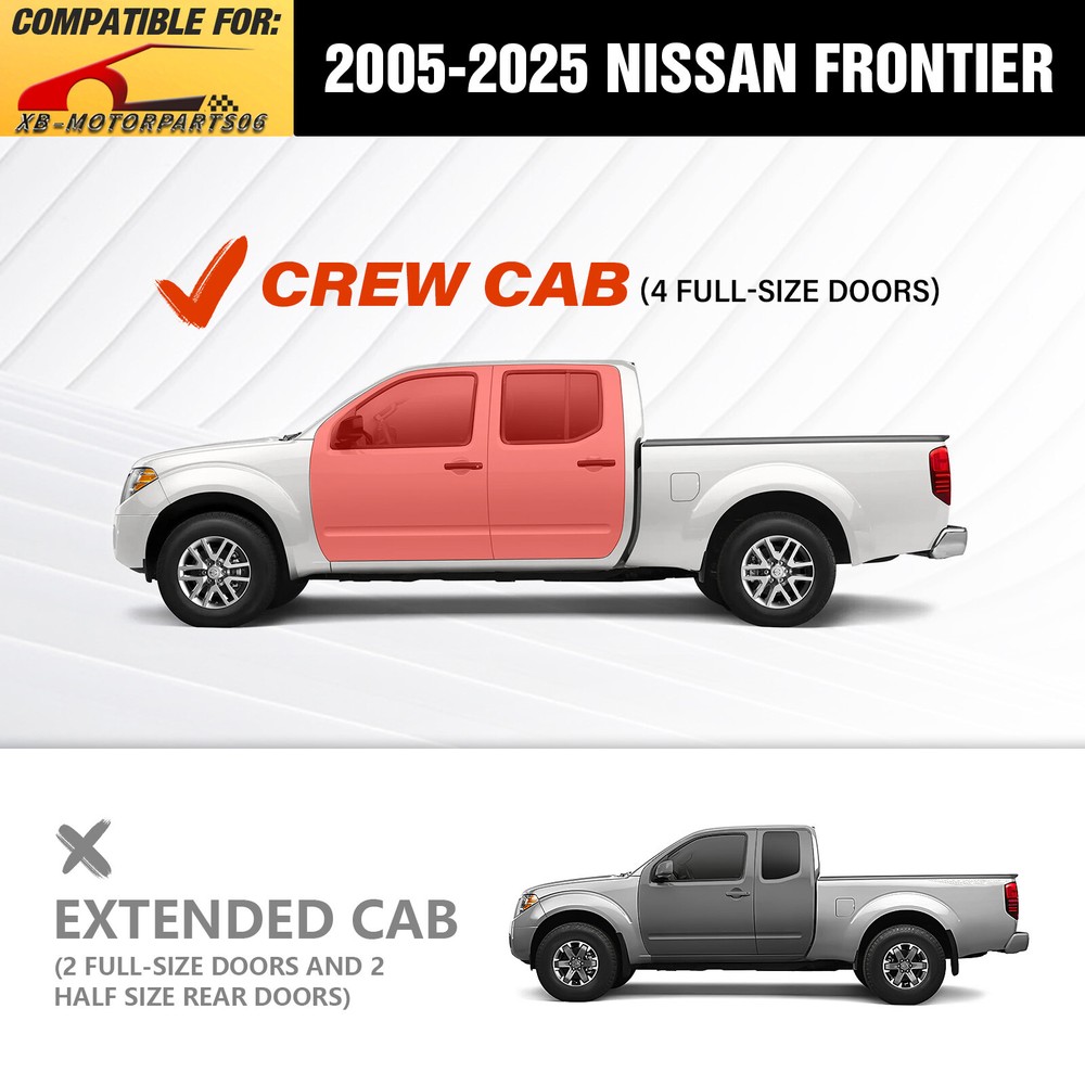 Side Rails Step Nerf Bar Running Boards For 2005-2025 Nissan Frontier Crew Cab Suitable Models : Compatible with 2005-2025 Nissan Frontier Crew Cab (4 Full Size Doors) Package Includes : 2 x Running Boards Side Steps, brackets, instructions, and all necessary hardware Product Information : Product Dimensions: 76 x 7 x 6 inches Installation mode: Bolt-On Weight Limit: 550LBS Placement on Vehicle: Left and Right Item Weight: 64.46 pounds Material: Carbon Steel Color: Black (hand measurements may have an error of 2-3 mm/0.078-0.118 in) Feature: ① The side steps feature a dual-layer design, enhancing convenience for vehicles with lift kits and oversized tires, while also making roof access easier; ② The extra-thick main tube provides superior load-bearing capacity, preventing deformation and enhancing vehicle protection; ③ The stepping area is designed with a high-end textured pattern, ensuring secure and stable footing to prevent slipping; ④ The high-quality black powder coating provides outstanding rust and corrosion resistance. Constructed from heavy-duty 2mm carbon steel, each side can withstand a weight of 550 pounds. Precision laser cutting and stamping techniques contribute to a non-slip step surface and enhanced traction; Warranty Period : 2 year Standard Shipping (FedEx Ground or FedEx Home Delivery) Will usually ship within 3 business days of receiving cleared payment Suitable Models : Compatible with 2005-2025 Nissan Frontier Crew Cab (4 Full Size Doors) Package Includes : 2 x Running Boards Side Steps, brackets, instructions, and all necessary hardware Product Information : Product Dimensions: 76 x 7 x 6 inches Installation mode: Bolt-On Weight Limit: 550LBS Placement on Vehicle: Left and Right Item Weight: 64.46 pounds Material: Carbon Steel Color: Black (hand measurements may have an error of 2-3 mm/0.078-0.118 in) Feature: ① The side steps feature a dual-layer design, enhancing convenience for vehicles with lift kits and oversized tires, while also making roof access easier; ② The extra-thick main tube provides superior load-bearing capacity, preventing deformation and enhancing vehicle protection; ③ The stepping area is designed with a high-end textured pattern, ensuring secure and stable footing to prevent slipping; ④ The high-quality black powder coating provides outstanding rust and corrosion resistance. Constructed from heavy-duty 2mm carbon steel, each side can withstand a weight of 550 pounds. Precision laser cutting and stamping techniques contribute to a non-slip step surface and enhanced traction; Warranty Period : 2 year
