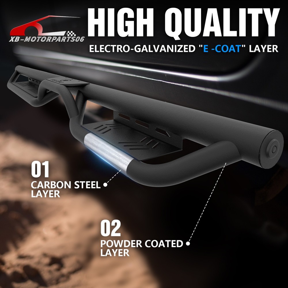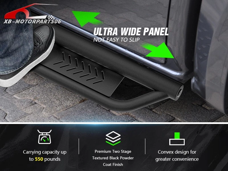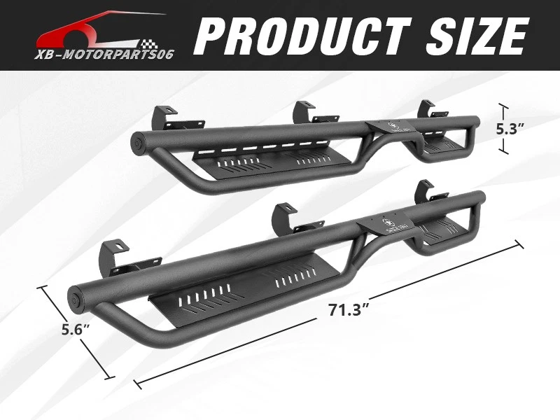 Side Running Boards For 2007-2018 Jeep Wrangler JK JKU Unlimited 4 Doors Bolt-on Suitable Models : Compatible with 2007-2018 Jeep Wrangler JK JKU Unlimited 4 Doors Package Includes : 2 × Running Boards Side Steps, brackets, instructions, and all necessary hardware Product Information : Product Dimensions: 71.30 x 5.60 x 5.30 inches Installation mode: Bolt-On Weight Limit: 550LBS Placement on Vehicle: Left and Right Item Weight: 50.38 Pounds Material: Carbon Steel Color: Black (hand measurements may have an error of 2-3 mm/0.078-0.118 in) Feature: ① The side steps boast a two-tier layout, offering improved convenience for vehicles equipped with lift kits and oversized tires, as well as easier access to the roof ; ② The ultra-thick main tube provides exceptional weight-bearing capacity, ensuring the step resists deformation and enhances vehicle protection; ③ The hollow design of the step area ensures safe and stable footing, prevents water accumulation, and reduces driving resistance; ④ The premium black powder coating offers excellent rust and corrosion resistance. Made from heavy-duty 2mm carbon steel, each side can support up to 550 pounds. Precision laser cutting and stamping techniques ensure a non-slip step surface and improved traction; Warranty Period : 1 year Standard Shipping (FedEx Ground or FedEx Home Delivery) Will usually ship within 3 business days of receiving cleared payment Suitable Models : Compatible with 2007-2018 Jeep Wrangler JK JKU Unlimited 4 Doors Package Includes : 2 × Running Boards Side Steps, brackets, instructions, and all necessary hardware Product Information : Product Dimensions: 71.30 x 5.60 x 5.30 inches Installation mode: Bolt-On Weight Limit: 550LBS Placement on Vehicle: Left and Right Item Weight: 50.38 Pounds Material: Carbon Steel Color: Black (hand measurements may have an error of 2-3 mm/0.078-0.118 in) Feature: ① The side steps boast a two-tier layout, offering improved convenience for vehicles equipped with lift kits and oversized tires, as well as easier access to the roof ; ② The ultra-thick main tube provides exceptional weight-bearing capacity, ensuring the step resists deformation and enhances vehicle protection; ③ The hollow design of the step area ensures safe and stable footing, prevents water accumulation, and reduces driving resistance; ④ The premium black powder coating offers excellent rust and corrosion resistance. Made from heavy-duty 2mm carbon steel, each side can support up to 550 pounds. Precision laser cutting and stamping techniques ensure a non-slip step surface and improved traction; Warranty Period : 1 year
