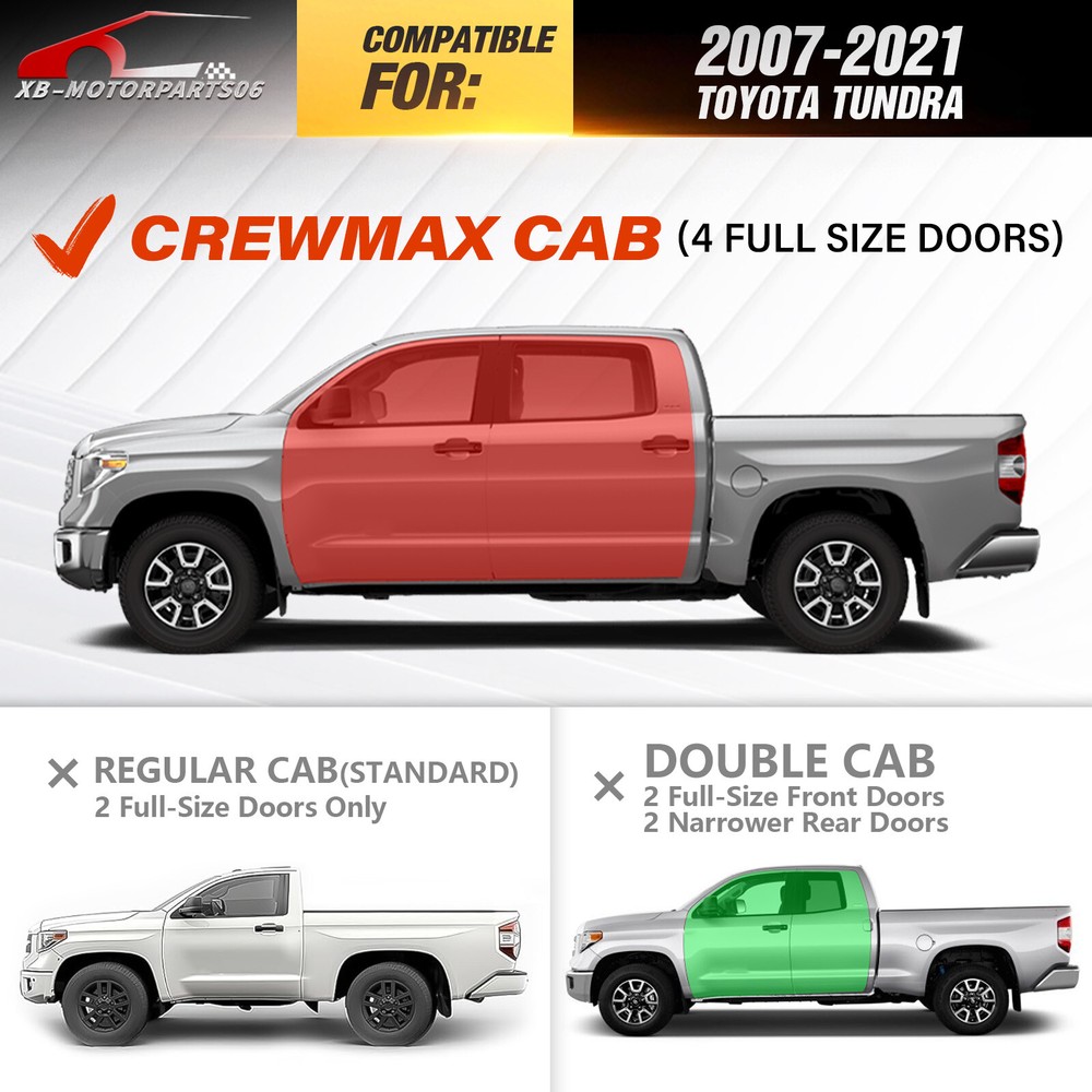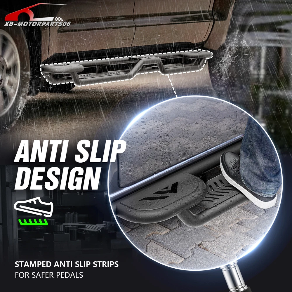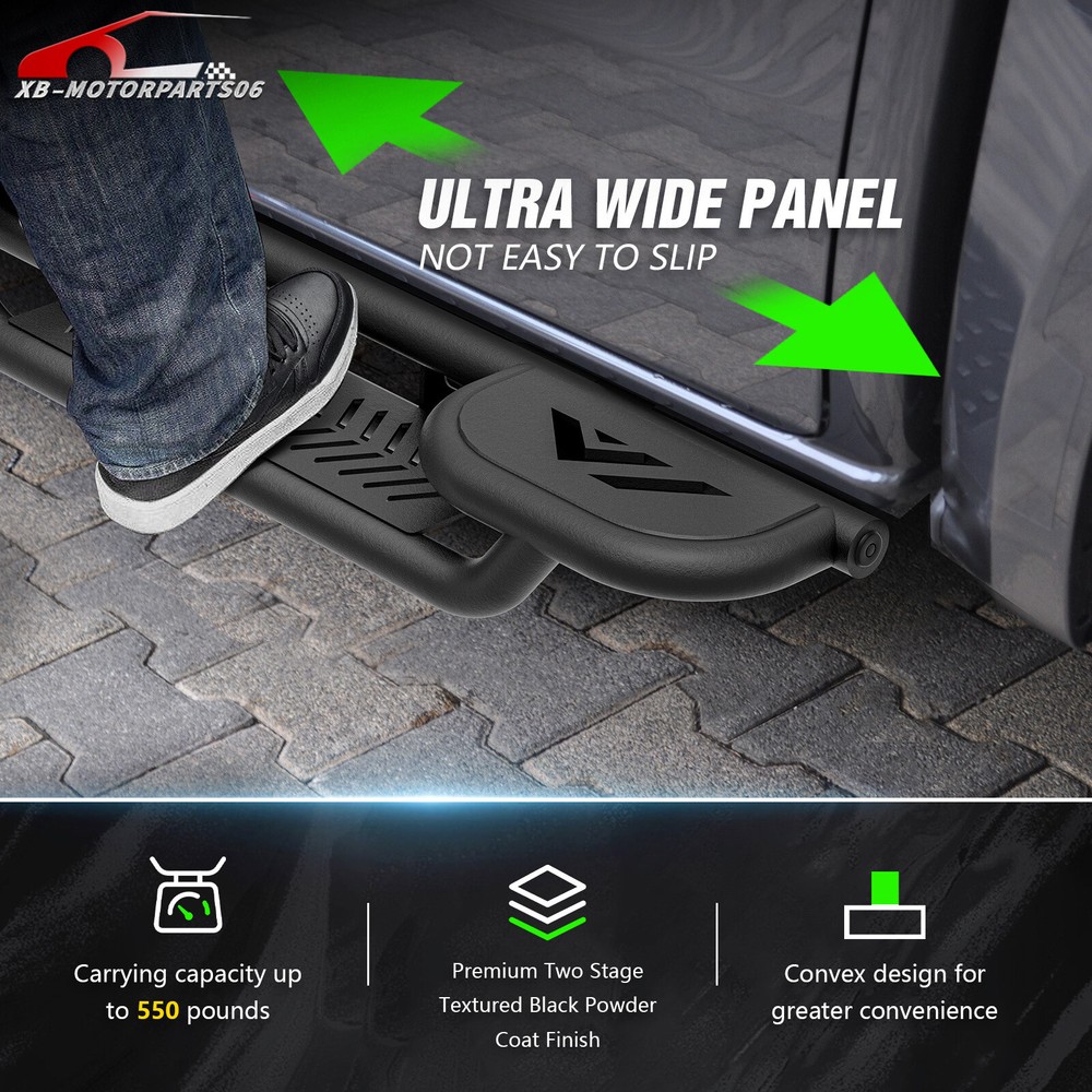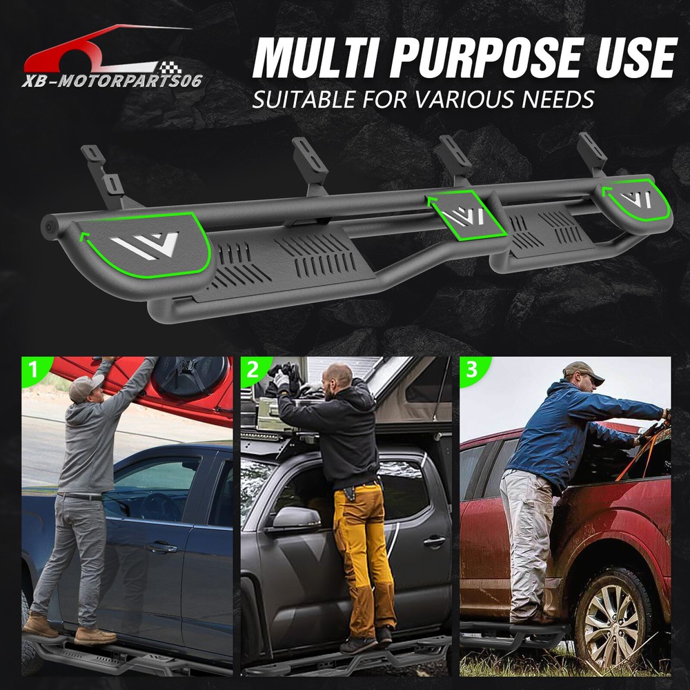Side Running Boards For 2007-2021 Toyota Tundra Crew Max Cab Three Raised Steps Suitable Models : Compatible with 2007-2021 Toyota Tundra Crew Max Cab Package Includes : 2 x Running Boards Side Steps, brackets, instructions, and all necessary hardware Product Information : Product Dimensions: 83 x 7 x 5 inches Installation mode: Bolt-On Weight Limit: 550LBS Placement on Vehicle: Left and Right Item Weight: 71.5 pounds Material: Carbon Steel Color: Black (hand measurements may have an error of 2-3 mm/0.078-0.118 in) Feature: ① Three Raised Steps for easy access to the roof, allowing multiple users to work on the vehicle simultaneously; ② Dual-layer Layout provides enhanced convenience for vehicles equipped with lift kits and oversized tires, offering easier access to the roof while maintaining sufficient ground clearance; ③ The high-quality black powder coating provides outstanding rust and corrosion resistance. Constructed from heavy-duty 2mm carbon steel, each side can withstand a weight of 550 pounds. Precision laser cutting and stamping techniques contribute to a non-slip step surface and enhanced traction; Warranty Period : 2 year Standard Shipping (FedEx Ground or FedEx Home Delivery) Will usually ship within 3 business days of receiving cleared payment Suitable Models : Compatible with 2007-2021 Toyota Tundra Crew Max Cab Package Includes : 2 x Running Boards Side Steps, brackets, instructions, and all necessary hardware Product Information : Product Dimensions: 83 x 7 x 5 inches Installation mode: Bolt-On Weight Limit: 550LBS Placement on Vehicle: Left and Right Item Weight: 71.5 pounds Material: Carbon Steel Color: Black (hand measurements may have an error of 2-3 mm/0.078-0.118 in) Feature: ① Three Raised Steps for easy access to the roof, allowing multiple users to work on the vehicle simultaneously; ② Dual-layer Layout provides enhanced convenience for vehicles equipped with lift kits and oversized tires, offering easier access to the roof while maintaining sufficient ground clearance; ③ The high-quality black powder coating provides outstanding rust and corrosion resistance. Constructed from heavy-duty 2mm carbon steel, each side can withstand a weight of 550 pounds. Precision laser cutting and stamping techniques contribute to a non-slip step surface and enhanced traction; Warranty Period : 2 year
