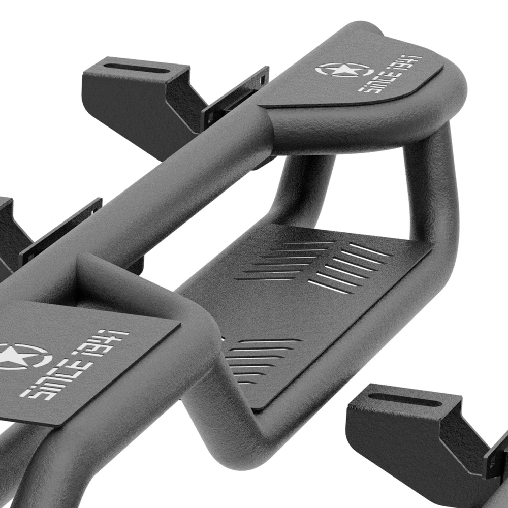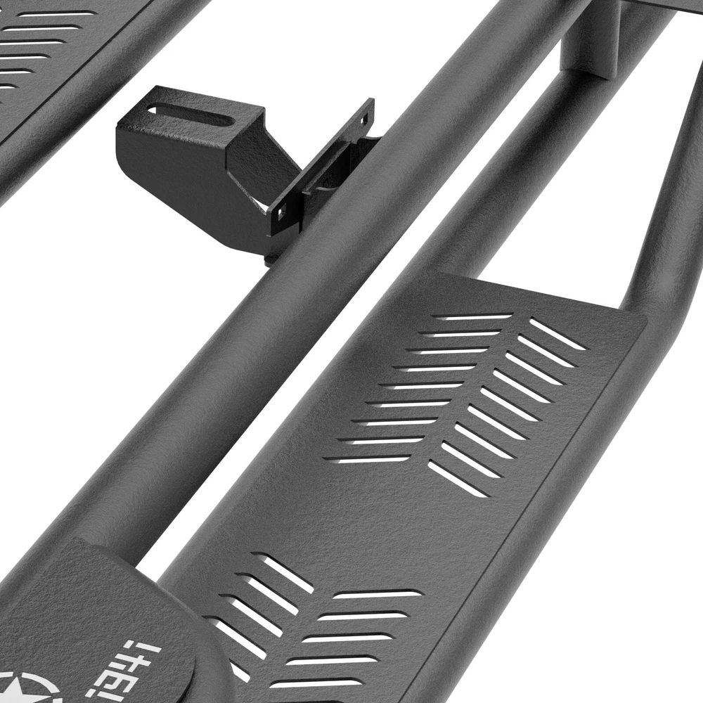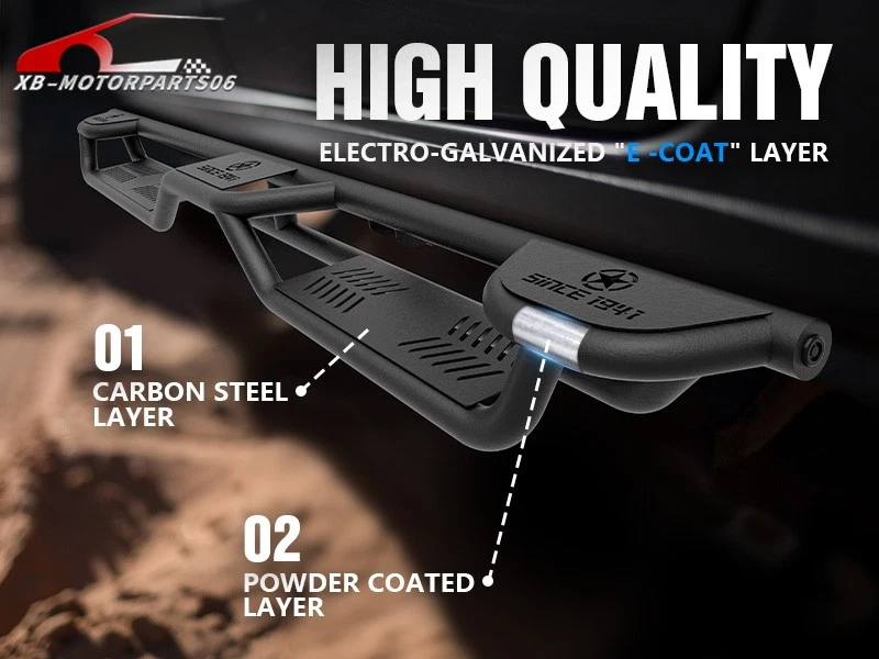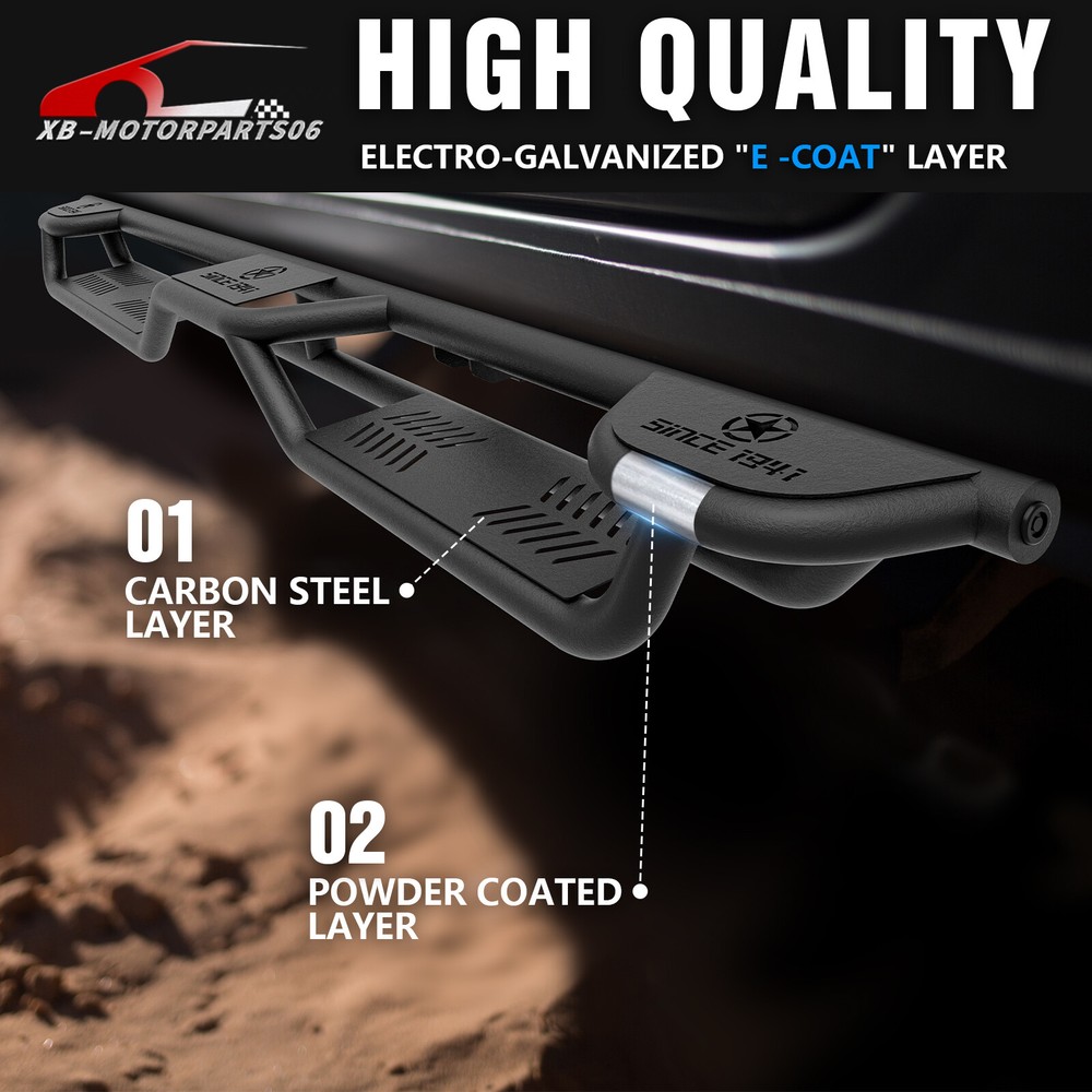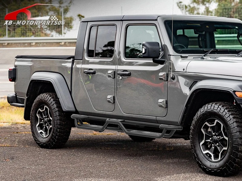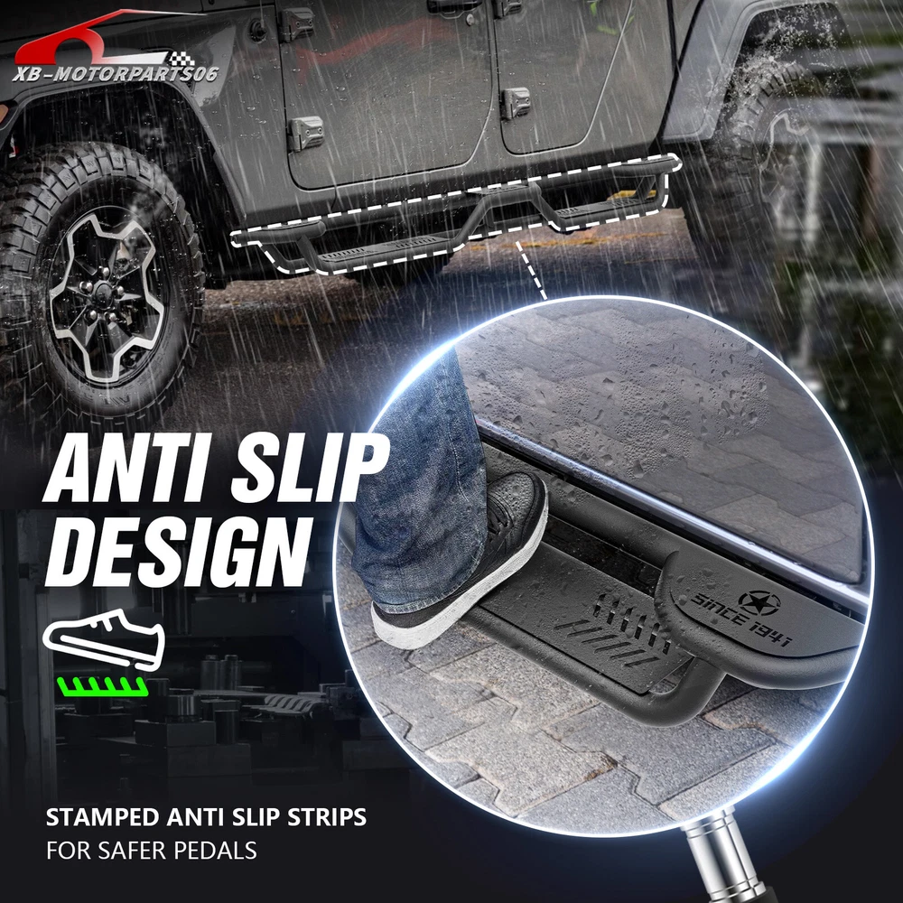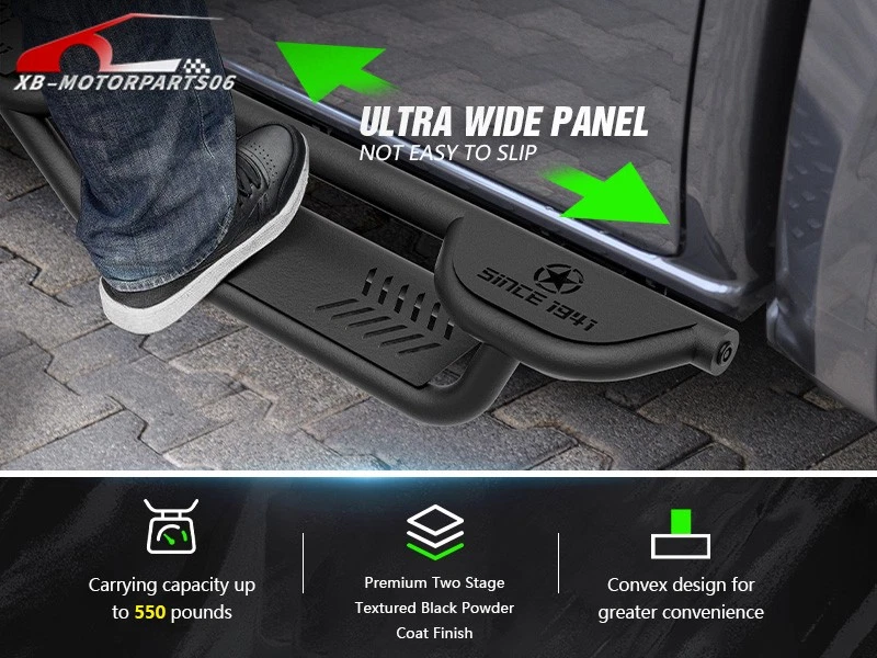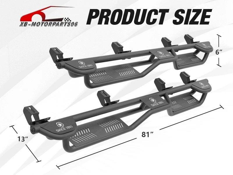 Side Running Boards For 2020-2026 Jeep Gladiator JT 4 Doors Three Raised Steps Suitable Models : Compatible with 2020-2026 Jeep Gladiator JT 4 Doors Package Includes : 2 x Running Boards Side Steps, brackets, instructions, and all necessary hardware Product Information : Product Dimensions: 81 x 13 x 6 inches Installation mode: Bolt-On Weight Limit: 550LBS Placement on Vehicle: Left and Right Item Weight: 74.14 pounds Material: Carbon Steel Color: Black (hand measurements may have an error of 2-3 mm/0.078-0.118 in) Feature: ① The unique "Since 1941" logo gives your nerf bars a distinctive look. The cutout design helps reduce the chances of dust, sand, or snow being brought into the cabin by your shoes, helping to keep your vehicle clean. It also provides extra grip when entering and exiting the truck; ② These truck running boards extend from the rear of the front fender to the front of the rear fender, providing a longer step surface. Ideal for easy access to the truck and bed, especially for frequent loading and unloading without climbing deep into the truck bed. The drop-down step makes it easier for children or those with mobility issues to enter the truck; ③ No cutting or drilling is required for easy installation. Note: Installation bolts are not included as they are already in the original vehicle . Simply locate them during installation. Ensure secure installation before driving; ④ Made from heavy-duty 2.0-inch tubular steel with a dual-beam system for maximum underbody protection. Supports up to 550 pounds. The textured powder coating offers excellent rust and corrosion resistance; Warranty Period : 2 year Standard Shipping (FedEx Ground or FedEx Home Delivery) Will usually ship within 3 business days of receiving cleared payment Suitable Models : Compatible with 2020-2026 Jeep Gladiator JT 4 Doors Package Includes : 2 x Running Boards Side Steps, brackets, instructions, and all necessary hardware Product Information : Product Dimensions: 81 x 13 x 6 inches Installation mode: Bolt-On Weight Limit: 550LBS Placement on Vehicle: Left and Right Item Weight: 74.14 pounds Material: Carbon Steel Color: Black (hand measurements may have an error of 2-3 mm/0.078-0.118 in) Feature: ① The unique "Since 1941" logo gives your nerf bars a distinctive look. The cutout design helps reduce the chances of dust, sand, or snow being brought into the cabin by your shoes, helping to keep your vehicle clean. It also provides extra grip when entering and exiting the truck; ② These truck running boards extend from the rear of the front fender to the front of the rear fender, providing a longer step surface. Ideal for easy access to the truck and bed, especially for frequent loading and unloading without climbing deep into the truck bed. The drop-down step makes it easier for children or those with mobility issues to enter the truck; ③ No cutting or drilling is required for easy installation. Note: Installation bolts are not included as they are already in the original vehicle . Simply locate them during installation. Ensure secure installation before driving; ④ Made from heavy-duty 2.0-inch tubular steel with a dual-beam system for maximum underbody protection. Supports up to 550 pounds. The textured powder coating offers excellent rust and corrosion resistance; Warranty Period : 2 year