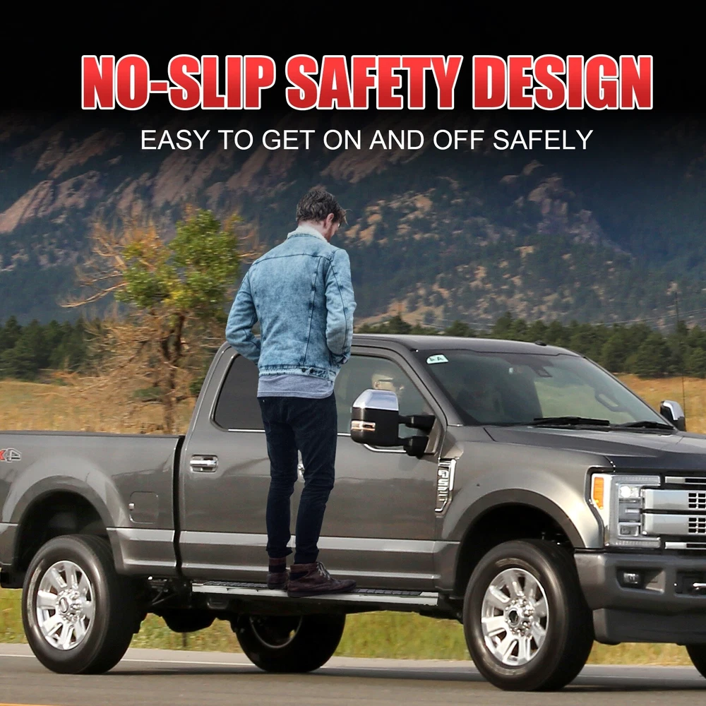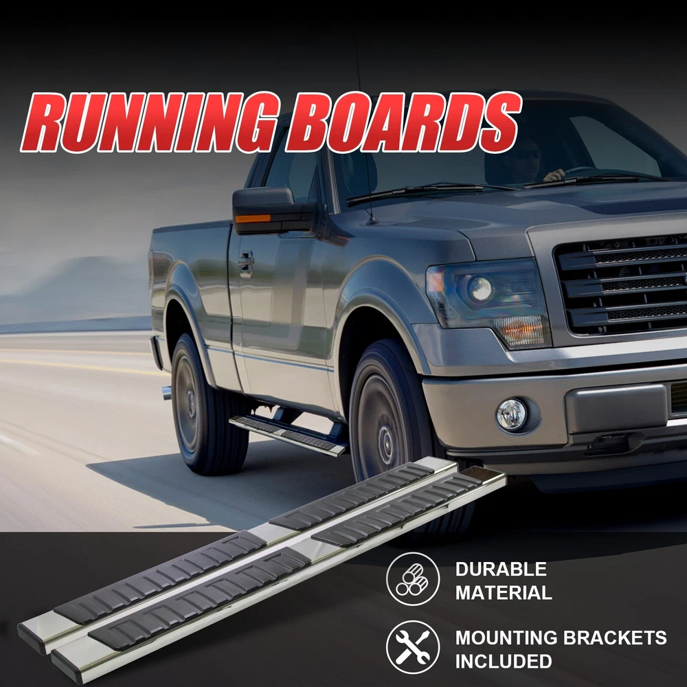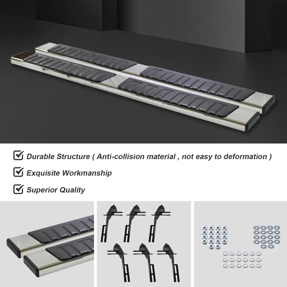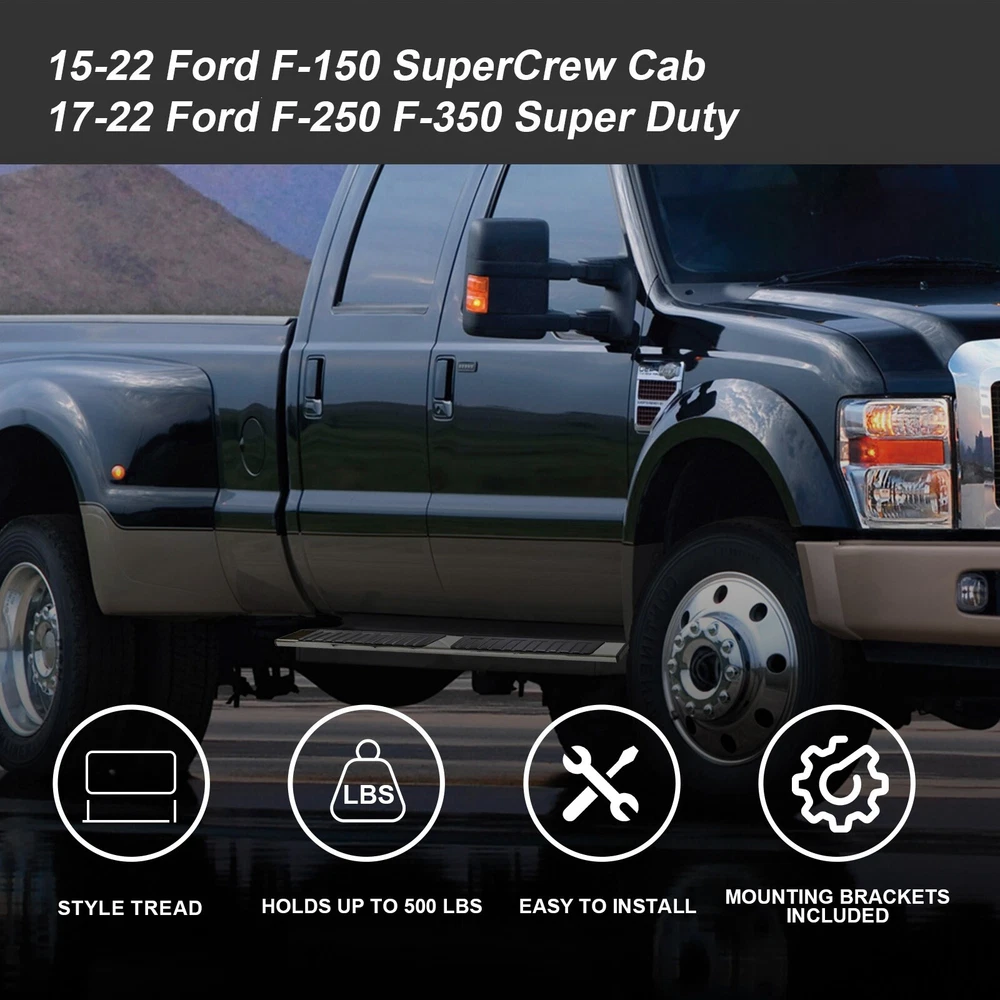 Specification Package Include: 1x Pair of Running Boards (Left + Right) Brackets on Each Side Mounting Hardware Sealing End Cover: Yes Manufacturer Warranty: 1 Year Color: Black, Silver Fitment Type: Direct Replacement Vehicle Service Type: Truck Placement on Vehicle: Left+Right Material: Stainless Steel,ABS Only Fit: Crew Cab Item Weight(lbs): 46.85 Package Dimensions(LengthxWidthxHeight:inch): 85.43x8.66x7.87 Condition: New Style: OE Style Installation Instruction: Not Included Package Weight(lbs): 49.05 Tread(inch):6" Fitment 2017-2022 Ford F-250 Super Duty 2017-2022 Ford F-350 Super Duty 2017-2022 Ford F-450 Super Duty 2015-2022 Ford F-150 Description 1. Made with durable, heavy-duty high light stainless steel and ABS plastic. Seamless joined ABS plastic tread with powder coated body surface to achieve great UV rays, rust, and slippery resistance. 2. Our running boards are made from the finest aluminum alloy, which is sturdy, durable, wear-resistant and rust-resistant. After repeated tests, they can resist the corrosion of salt spray, and withstand UV radiation without discoloration. 3. To a certain extent, they also help protect the paint on the side of the car from being scratched. At the same time, you can easily reach the top of your car when you need it, such as accessing the luggage rack or cleaning the rooftop. 4. Slider Design, Able to adjust position on vehicle forward & backwards for better customization. the whole closed end design make your running board inside clean. 5. Whatever finish you choose, the result is a smooth, finished look that complements your factory chrome and trim perfectly. 6. Running Boards & Side Steps make your life safe and simple for taking your coworkers to the job place, take your pets go out or carpooling the kids to school both. You have a very solid under foot feeling thanks to the Anti-slip tread surface and rugged construction. 7. Easy bolt-on installation: No cutting or drilling. On Nov 18, 2024 at 02:02:27 PST, seller added the following information: On Nov 22, 2024 at 01:59:28 PST, seller added the following information: