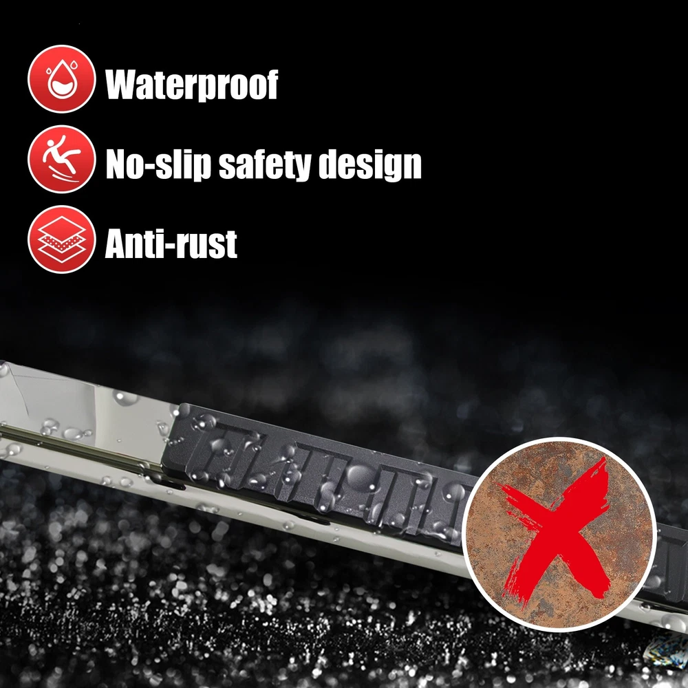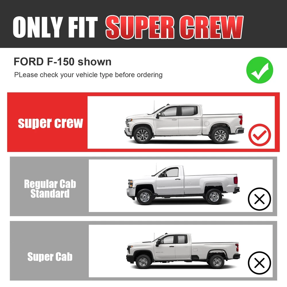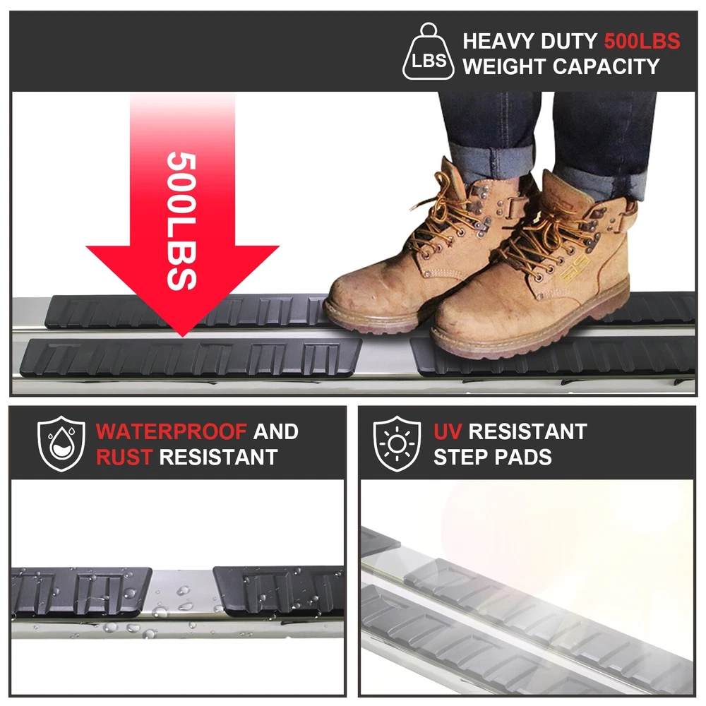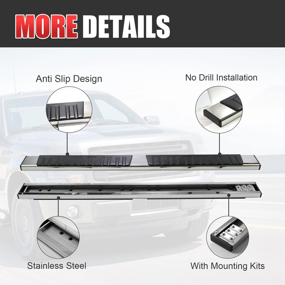 Specification Package Include: 1x Pair of Running Boards (Left + Right) Brackets on Each Side Mounting Hardware Sealing End Cover: Yes Manufacturer Warranty: 1 Year Color: Black, Silver Fitment Type: Direct Replacement Vehicle Service Type: Truck Placement on Vehicle: Left+Right Material: Stainless Steel,ABS Only Fit: Crew Cab Item Weight(lbs): 46.85 Package Dimensions(LengthxWidthxHeight:inch): 85.43x8.66x7.87 Condition: New Style: OE Style Installation Instruction: Not Included Package Weight(lbs): 49.05 Tread(inch):6" Fitment 2017-2022 Ford F-250 Super Duty 2017-2022 Ford F-350 Super Duty 2017-2022 Ford F-450 Super Duty 2015-2022 Ford F-150 Description 1. Made with durable, heavy-duty high light stainless steel and ABS plastic. Seamless joined ABS plastic tread with powder coated body surface to achieve great UV rays, rust, and slippery resistance. 2. Our running boards are made from the finest aluminum alloy, which is sturdy, durable, wear-resistant and rust-resistant. After repeated tests, they can resist the corrosion of salt spray, and withstand UV radiation without discoloration. 3. To a certain extent, they also help protect the paint on the side of the car from being scratched. At the same time, you can easily reach the top of your car when you need it, such as accessing the luggage rack or cleaning the rooftop. 4. Slider Design, Able to adjust position on vehicle forward & backwards for better customization. the whole closed end design make your running board inside clean. 5. Whatever finish you choose, the result is a smooth, finished look that complements your factory chrome and trim perfectly. 6. Running Boards & Side Steps make your life safe and simple for taking your coworkers to the job place, take your pets go out or carpooling the kids to school both. You have a very solid under foot feeling thanks to the Anti-slip tread surface and rugged construction. 7. Easy bolt-on installation: No cutting or drilling. On Nov 18, 2024 at 02:02:27 PST, seller added the following information: On Nov 22, 2024 at 01:59:28 PST, seller added the following information: