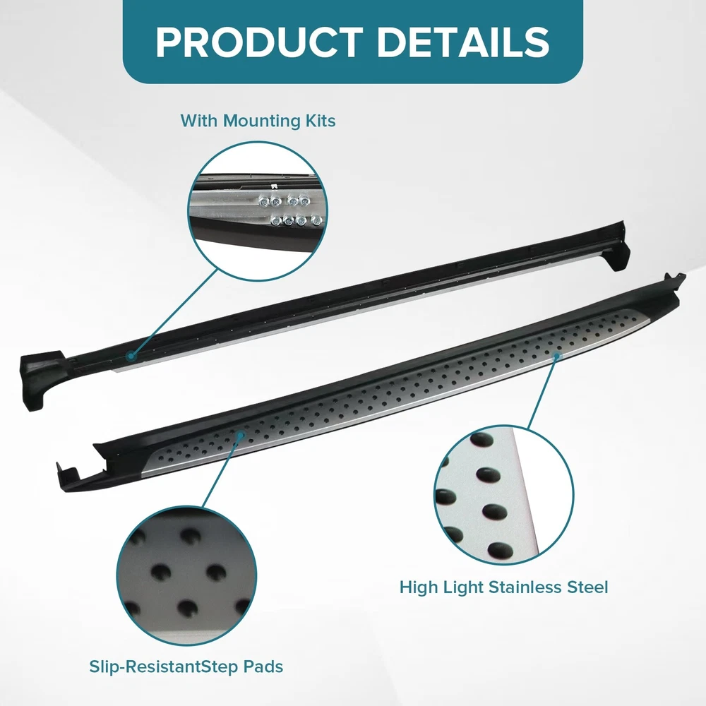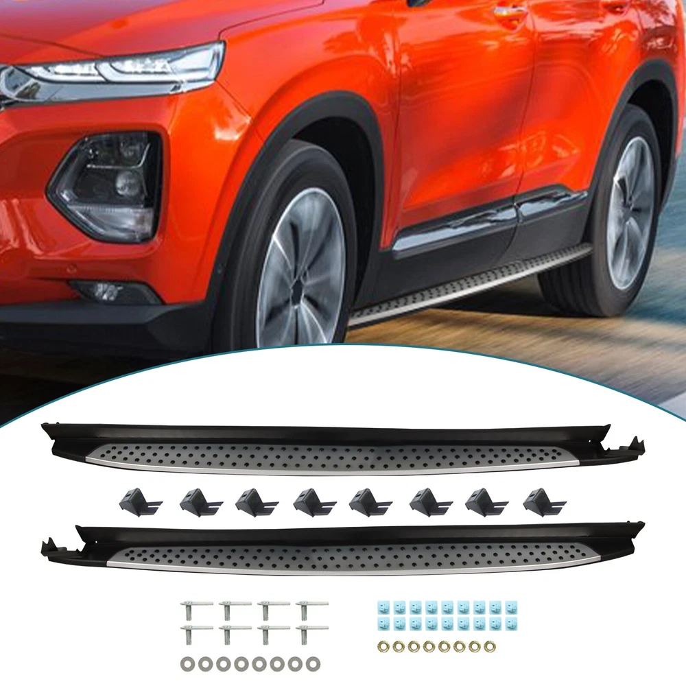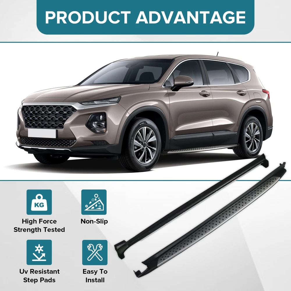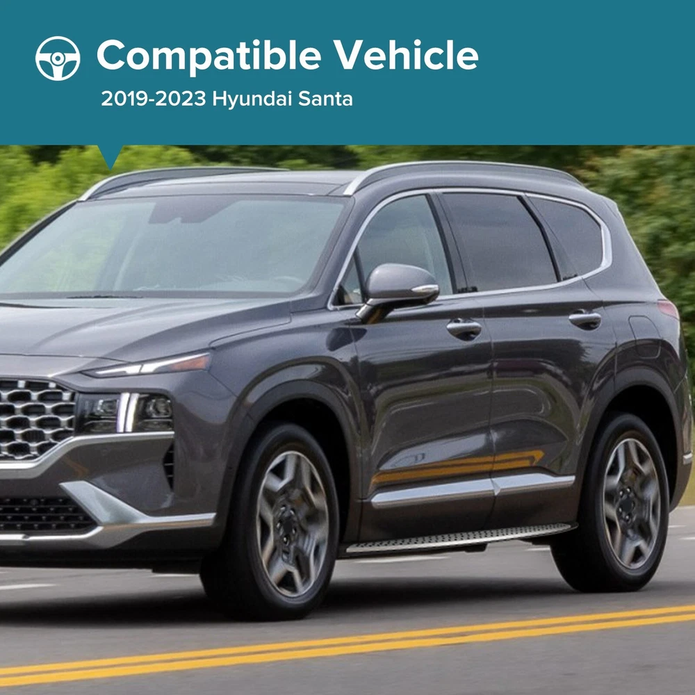 Specification Color: Black+silver Type: Step Nerf Bar Placement on Vehicle: Left, Right Fitment Type: Performance/Custom Material: Stainless Steel,ABS Shape: Rectangular Mounting Hardware Included: YES Package Size: 76.97*10.63*8.46 Package Weight: 25.9 Fitment 2019-2023 Hyundai Santa Fe Features & Benefits 1. High-Grade Construction: These running boards, also known as Side Steps, are made from high-grade Stainless Steel. This makes them lightweight yet extremely durable, perfect for long-term use. 2. Weather Resistant: Built tough, these running boards are highly resistant to corrosion. They perform well in all weather conditions, making them a reliable addition to your vehicle. 3. Easy Assembly and Removal: These running boards are designed for easy assembly and removal. This means you can easily install them when needed and remove them when not in use. 4. OEM Replacement with Quality Guarantee: These running boards serve as the perfect OEM replacement. They come with a quality guarantee, ensuring that you get the best value for your money. 5. Enhances Vehicle's Exterior: Apart from their functional benefits, these running boards also provide a great upgrade for your vehicle's exterior look. Please ensure to check the compatibility of these running boards with your vehicle before ordering. Feel free to contact us if you have any questions. On Nov 19, 2024 at 01:55:37 PST, seller added the following information: On Nov 22, 2024 at 01:59:13 PST, seller added the following information:
