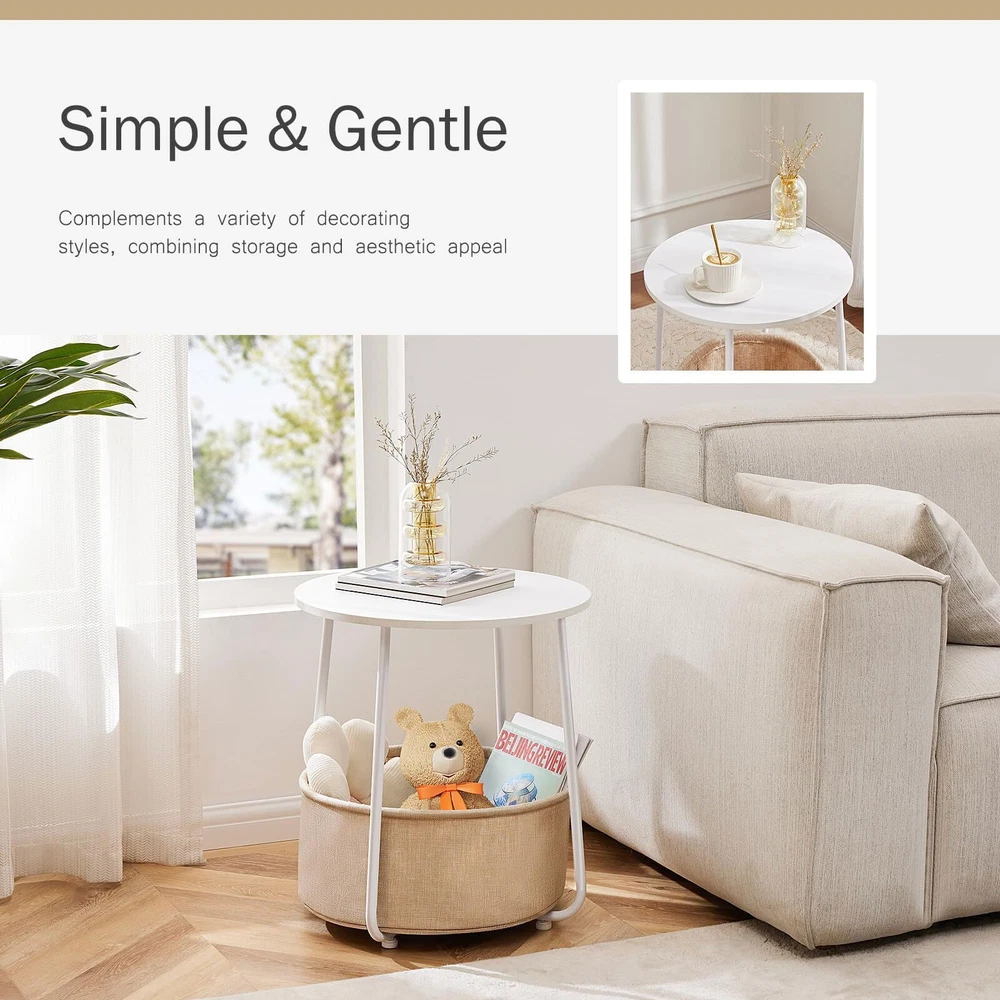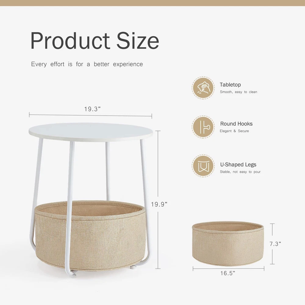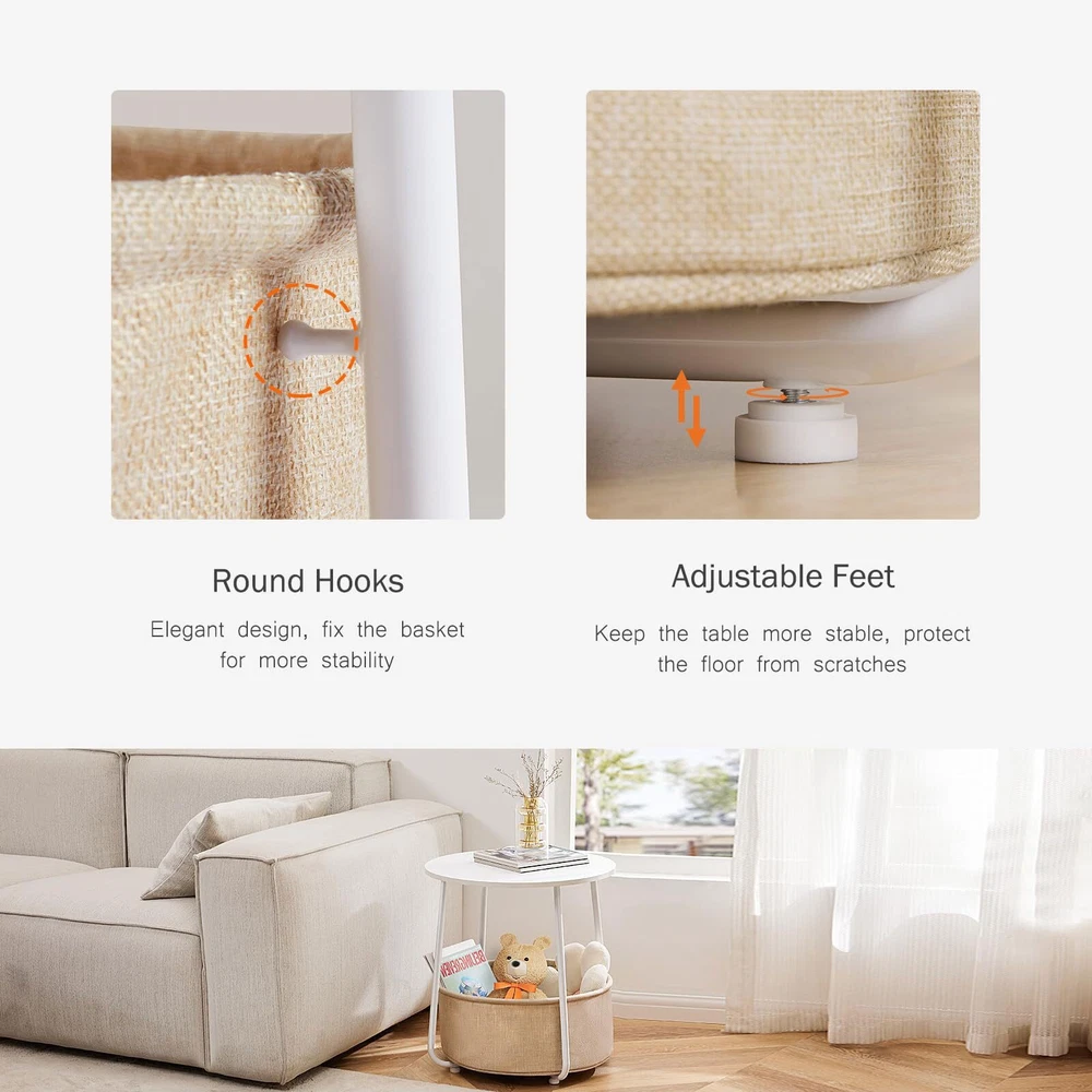 End Table boasts a classic and functional design that exudes sophistication. The durable linen basket not only enhances its aesthetic appeal but also provides ample storage space for various items, from toys and blankets to magazines and more. Versatile and Space-saving: Round small table is the perfect solution for small spaces, serving as a versatile bedside table, accent table, or mini table. Its compact design, measuring 19.3''x19.9'', allows it to fit seamlessly into various spaces, making it an ideal addition to your living room, bedroom, nursery, and more. Classic and Functional Design: With its simple yet beautiful design, this living room tables adds a touch of elegance to any room. The table features a durable linen basket that not only enhances its sophistication but also provides convenient storage space for toys, blankets, magazines, game consoles, and even as a cozy bed for your pet. Sturdy and Reliable: Crafted from sturdy particleboard and supported by an integrated U-shaped base, our end table offers unrivaled stability and durability. The adjustable support feet at the bottom ensure stability while protecting your floors from scratches. Rest assured, this table is built to withstand everyday use. Seamless Integration: round end table is designed to seamlessly integrate with your existing furniture. The versatile design allows you to mix and match it effortlessly, creating a cohesive and stylish look in your home. Whether you need a functional bed side tables, a chic accent piece, or a practical storage solution, our round end tables is the perfect choice. Easy Installation: We value your satisfaction and strive to provide excellent . Our nightstand comes with a detailed installation manual and all necessary tools for easy assembly.