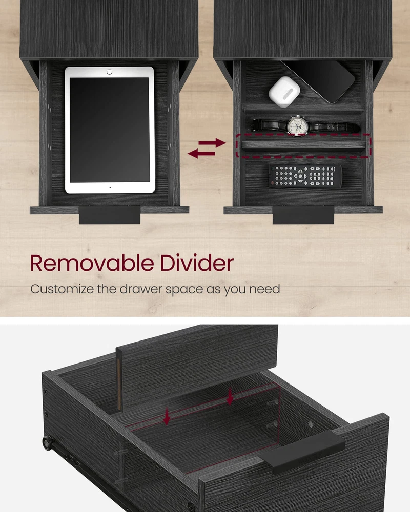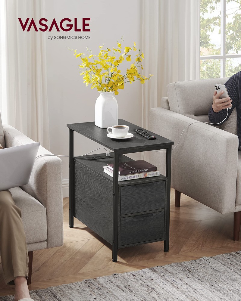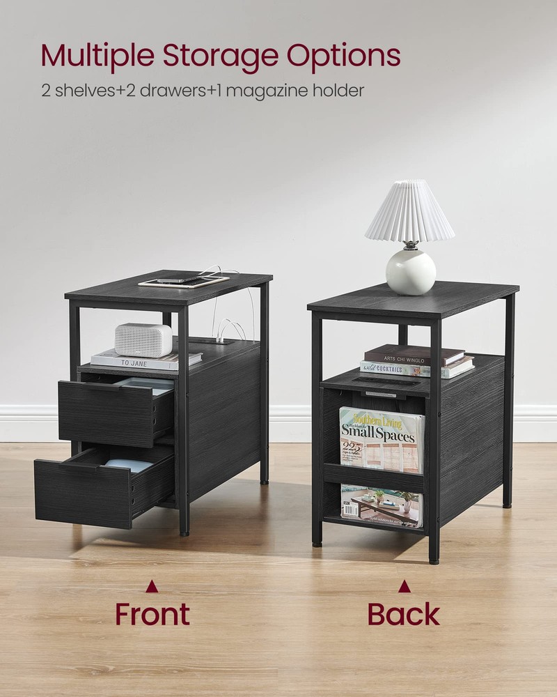 [Attached Power Strip] Power up your devices with our side table featuring a built-in charging station with 2 AC outlets, 2 USB ports, and a 6.5 ft cable, keeping your space organized and free from messy cords [Plenty of Storage] This narrow side table features 2 drawers with removable inner dividers, 2 open shelves for easy access, and a convenient magazine holder on the back, providing ample storage space for your books and electronics [Stable and Durable] Constructed with steel and particleboard, this slim nightstand will provide sturdy and reliable support (max. static load 200 lb) for your bedside essentials in the coming years [Thoughtful Additions] Designed with thoughtful details such as stylish easy-to-grab handles and smooth drawer slide rails, this end table brings convenient utility right by your bedside [Bring Rustic Charm to Any Room] This narrow bedside table can serve as a sofa side table, nightstand, or accent table. Its rustic design will add a touch of charm to your living room, bedroom, or wherever you need it