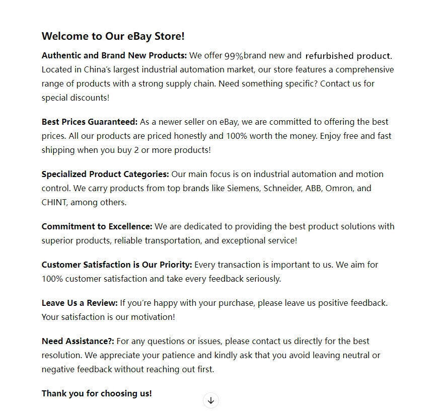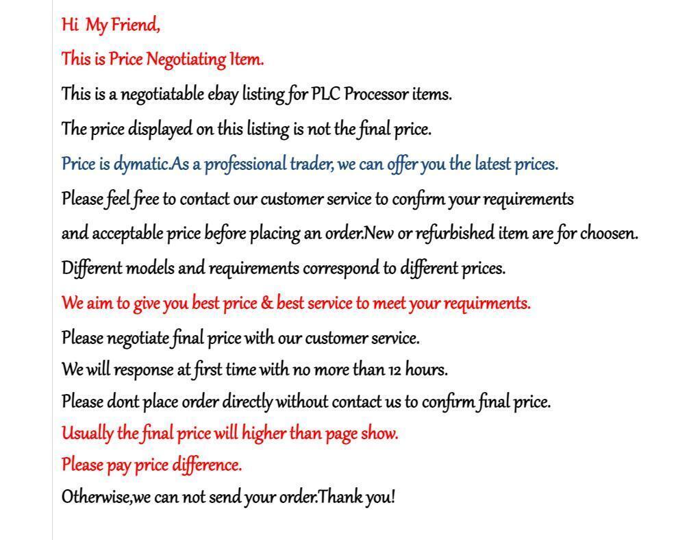 Hi My Friend, This is Price Negotiating Item. This is a negotiatable ebay listing for PLC Processor items. The price displayed on this listing is not the final price. Price is dymatic.As a professional trader, we can offer you the latest prices. Please feel free to contact our customer service to confirm your requirements and acceptable price before placing an order. New or refurbished item are for choosen. Different models and requirements correspond to different prices. We aim to give you best price & best service to meet your requirments. Please negotiate final price with our customer service. We will response at first time with no more than 12 hours. Please dont place order directly without contact us to confirm final price. Usually the final price will higher than page show. Please pay price difference. Otherwise,we can not send your order.Thank you! BRAND NEW PARTS OR REFURBISHED PARTS 100% CUSTOMER SATISFACTION 90 DAYS MONEY BACK WARRANTY! HIGH QUALITY meets your HIGH STANDARDS MORE QUANTITY MORE DISCOUNTS------>>> JUST CONTACT US 1. No any handle fees. 2. Items will be shipped in 3-5 business days on payment received. 3. We ship to eBay's address only. Please make sure your address in eBay is matched with your shipping address before payment. 4. We provide Economy Int'l Shipping and Express shipping services. 5. We provide free shipping for some items and there is no Tracking NO available. Economy or Standard Int'l Shipping: We ship to USA,Europe by SpeedPAK and other countries by International parcel with registed T/N. Estimated Shipping time Country Estimated Delivery time United States About 7-12 business time Asia About 10 business time Most Occident countries About 12 business time Russia About 7-18 business time Canada About 15 business time Australia About 20 business time Africa & European remote About 20 business time South America About 22-30 business time Express international shipping: We provide express shipping service if you need the parts urgently. We will ship by DHL , Fedex or EMS and charge $ 30 as expess shipping freights. And the delivery time is about 3 to 5 working days according to your locations. · Returns Policy We provide 90 days warranty, buying with confidence! If you are not satisfied with your parts, you can return it back within 60 days for replacement or money back. Any question, please contact us and we will response in 24 hours. · About Us Benton Chips is a B2B & B2C online store dedicated to support companies and people engaged in the Electronic Components Industry. Benton Chips enables buyers to source electronic components around the world. Benton Chips holds more than 200,000 lines in stock. We don't list all lines on eBay. Please send us RFQ if you look for any electronic component. Benton Chips is not only an electronic component retailer, but also an wholesale company. If you look for large quantity, please contact us to get better offer. Benton Chips wants to earn your trust through reliable and competive services. ? PAYMENT We accept Payoneer PayPal payment All major credit cards are accepted through secure payment processor PayPal.(* If you use e-check on PayPal, delivery may take longer, as we will hold your order until your e-check clear) Payment must be received once after you placed your order of buy it now. Please make sure your PayPal and eBay address is correct. If not, please correct it before payment. Thank you. Custom duties, taxes, or charges are not included in the cost you pay to us. Please check with your country's customs office to determine what these additional costs will be prior to bidding/ buying. ? SHIPPING We Ship to Worldwide, except China (Hong Kong,Taiwan,Macao), and we do not ship to APO/FPO. Orders processed within 24-48 hours of payment verification. Before buying, Please make sure your PayPal and eBay address is correct. If not, please correct it before payment.if you want me send the item to another address,please send me a message. If you have not received your shipment within 40 days from payment, please contact us. We will track the shipment and get back to you as soon as possible with a reply. Our goal is customer satisfaction! Due to stock status and time differences, we will choose to ship your item from our first available warehouse for fast delivery. Many of our products have overseas warehouses, including Australian warehouses, American warehouses and ? RETURNS If you are not satisfied when you receive your item, please return it within 30 days for a replacement or money back. Please contact me before you return it. Defective items Must Be reported and returned to us within the warranty period (and in the original packaging, if possible). You must tell us what the defect is and give us your eBay ID. Return shipping is to be paid by the Buyer. We act as a responsible seller; we are willing to actively undertake the following responsibilities: a. The item is lost during transit; b. The item is damaged during transport; c. Due to our work errors, transporting the wrong items to the buyer; d. The item in the actual use of the process of quality problems. ? FEEDBACK We will leave POSITIVE FEEDBACK after receiving the payment. Please contact us if you are not satisfied with the item after receiving it. All email will be answered within One working day. If you do not receive our reply, please kindly re-sent your email and we will reply to you as soon as possible. We maintain high standards of excellence and strive for 100% customer satisfaction! Feedback is very important to us. We request that you contact us immediately. Before you give us neutral or negative Feedback, so that we can satisfactorily address your concerns. Good communication can fix all problems, we always believe that as long as you are willing to communicate with us, we will give you a satisfactory answer. ? ABOUT US Welcome to my shop,We offer an extensive range of products selected by our professionals.superiority in details and qua