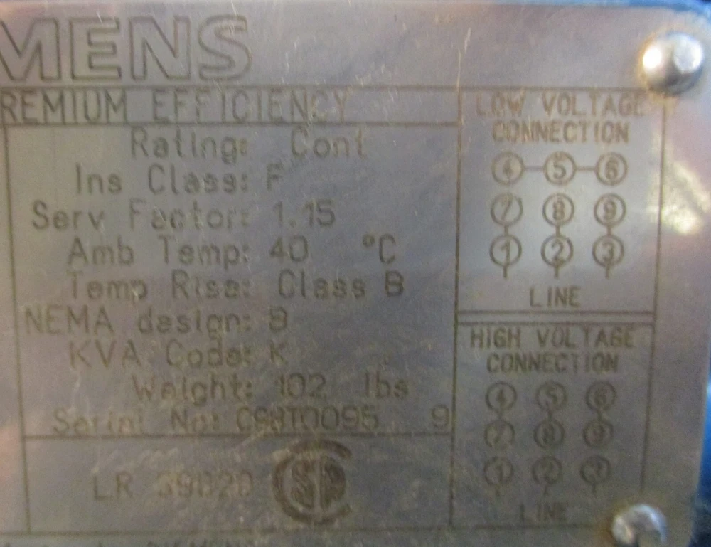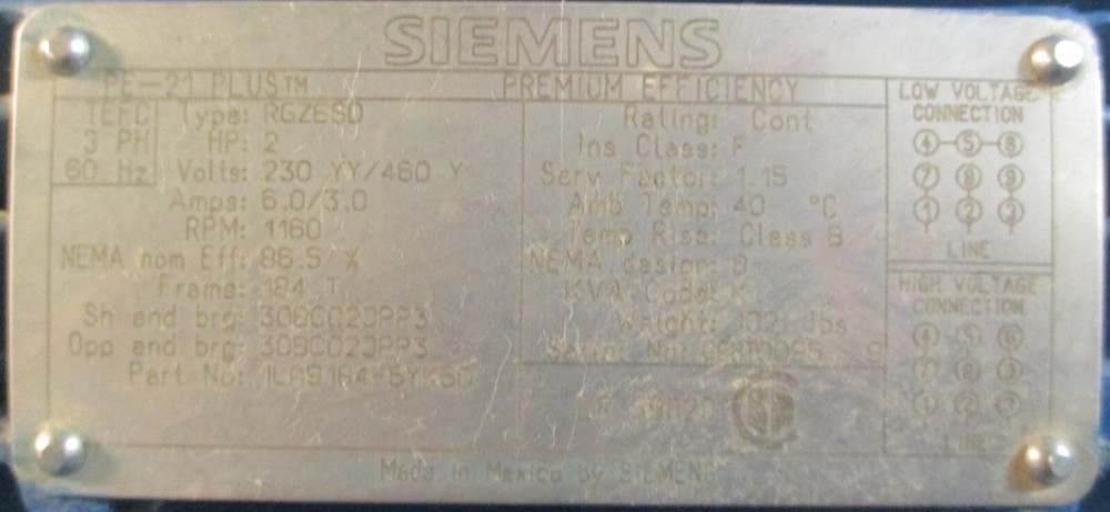 AC Phase: Three Phase MPN: 1LA9184-6YK60 NEMA Frame Suffix: T Enclosure Type: TEFC (Totally Enclosed Fan Cooled) Rated Load (HP): 2 Seller Notes: “Good used condition, running when taken out of service” Current Type: AC NEMA Design Letter: Design B (General Purpose) Shaft Diameter: 1 1/8 in Brand: Siemens Service Factor: 1.15 Model: RGZESD Insulation Class: F (Max 311°F) Country of Origin: Mexico AC Frequency Rating: 60 Hz