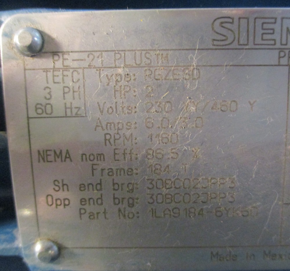 Siemens PE-21 Plus 3PH AC Motor RGZESD 1LA9184-6YK60 230/460V 1-1/8" Shaft Dia