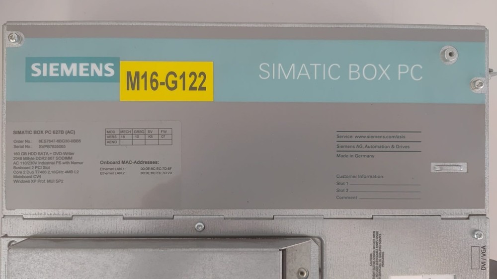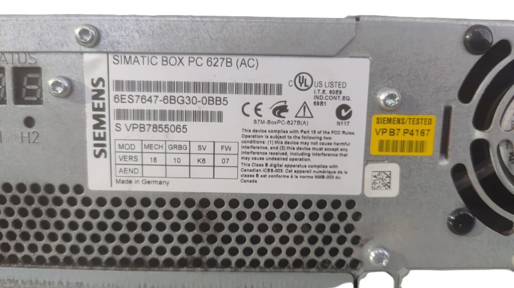 Spezifikation: Modell / Typ: Siemens SIMATIC Box PC 627B Industrie-PC Teilenummer (MNR): 6ES7647-6BG30-0BB5 Eingangsspannung: 100–240 V AC, 50–60 Hz Frequenz: 50–60 Hz Herkunftsland: Deutschland Hersteller: Siemens Specification: Model / Type: Siemens SIMATIC Box PC 627B Industrial PC Part Number (MNR): 6ES7647-6BG30-0BB5 Input Voltage: 100–240 V AC, 50–60 Hz Frequency: 50–60 Hz Country of Origin: Germany Manufacturer: Siemens