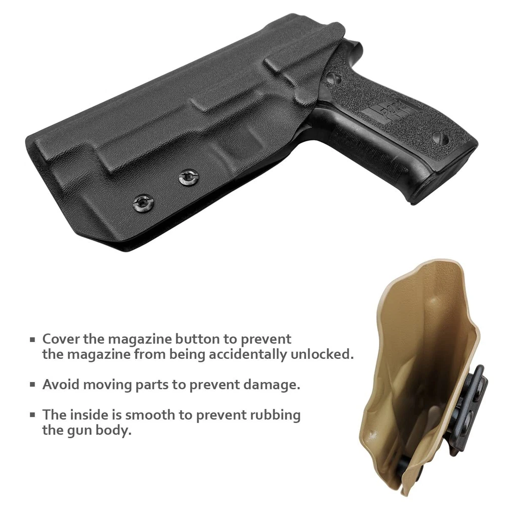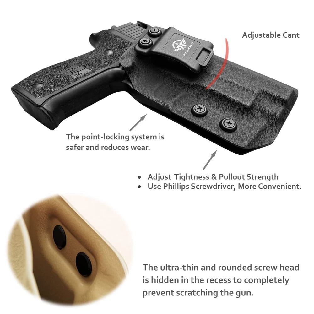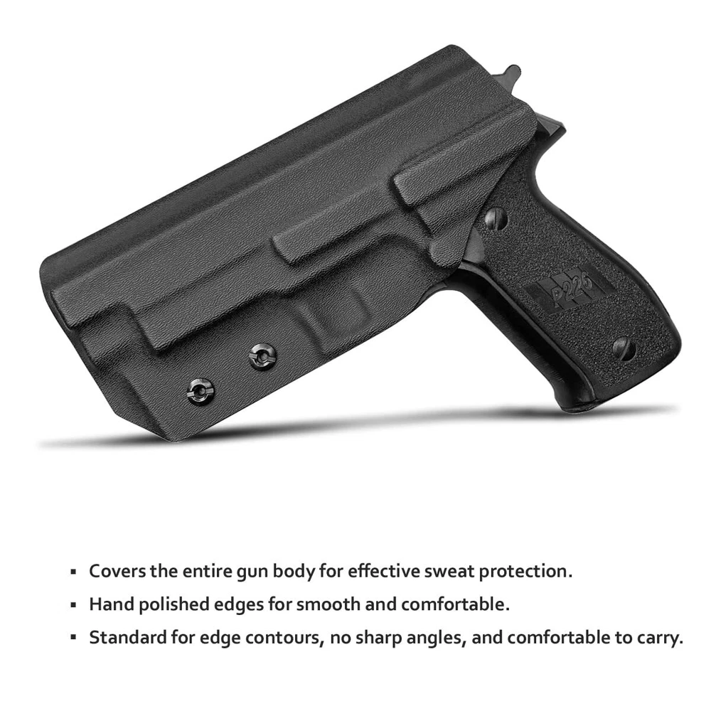 The obvious choice for concealed carry KYDEX Holster It's a holster hidden in a belt and clothes that protects you from anywhere, without causing anxiety. The KYDEX holster is very thin and has no sharp edges or corners for comfort and convenience. Can be effectively hidden under the clothes. High quality and excellent performance Our Sig Sauer P226 Full Size 4.4'' holster has a Posi-Click Audible Retention Lock system, and the pistol has a crisp “click” sound when it is inserted, so you know that your gun is firmly seated. Since reaction time is critical to survival, we use a set screw to adjust the tightness to determine the force required for extraction. Nylon + fiberglass belt clips are solid and reliable, you can adjust the angle of 0 to 15 degrees according to your own habits, so that you can achieve the fastest speed. High matching, no sloshing, no jitter, no wear. Inserting and unplugging is easy. Perfectly protect your love gun. The Sig Sauer P226 Full Size 4.4'' Holster is hand-made from the sturdy 0.8" KYDEX. It is not only waterproof, sweat-resistant, but also has high strength, high toughness, impact resistance, abrasion resistance and aging resistance. It can be used under various conditions. So you can always rely on it to save your life. We offer a lifetime warranty and if our Sig Sauer P226 Full Size 4.4'' Barrel IWB holster does not perform as promised under normal use, please return it for replacement or a full refund. Keep your Sig Sauer P226 Full Size 4.4'' Barrel at your fingertips while keeping it out of someone else's. Add the Kydex IWB Sig Sauer P226 Holster to your cart today.