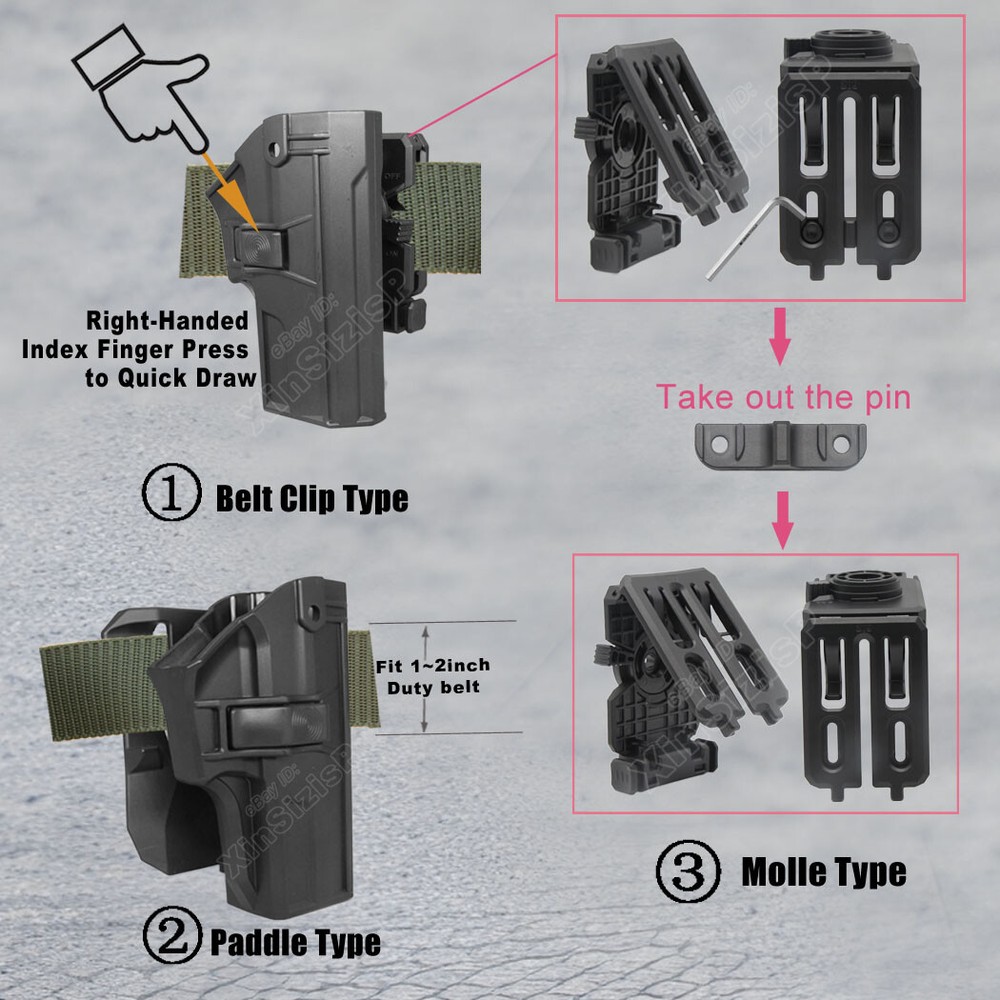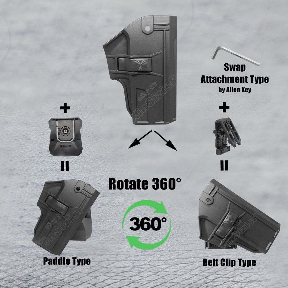 High Quality Military & Police Grade Polymer OWB Holster Specially Designed For Fast Draw During Duty Or Shooting Competition. This is a Combo Holster Comes With Paddle and Belt Clip Attachment ,which means you can swap paddle type to belt clip type with the Allen key by yourself. Item Description: Outside the Waistband Duty Holster with Paddle attachment Holster fit S ig Sauer SP2022 Full-Size 9mm Luger Sig Sauer SP2022 SAR Sport Full-Size 9mm Luger Sig Sauer SP2022 Full-Size .40 S&W Sig Sauer SP2022 Full-Size .357 SIG ( I t can not fit the gun with Optic Mount Mini Sight , laser , embedded chassis, or flashlight style ) Ease and Comfort Push side buttons to achieve the fast opening and closing, unique design allows for belt carrying or vest carrying, perfectly used by duty holsters, uniformed law enforcement officers, security personnel, military personnel, private persons, and shooting sports holsters. And it fits closer to the body which can achieve better concealment under clothes. High S afety Secure Level II Retention - Auto-locking system restrain pistol in the holster to ensure ultimate safety, activate the release by pressing the button with the index finger to achieve gun access . A djustable Easily set Holster 360 degrees to your desire position with Allen key, compatible belt width up to 2 inch . Tough & Durable Material Custom-molded body made of polymer stronger than leather that will wear out, adapt to every bad environment In the Package: · 1*Holster with Paddle Attachment · 1*Belt Clip Attachment · 1*Allen Key Shipping: Ships same day or next except Sundays and Holidays ! Free shipping! Ship by USPS First Class Package. 100% MONEY BACK GUARANTEE. Any question please be free to contact with us .Thanks!