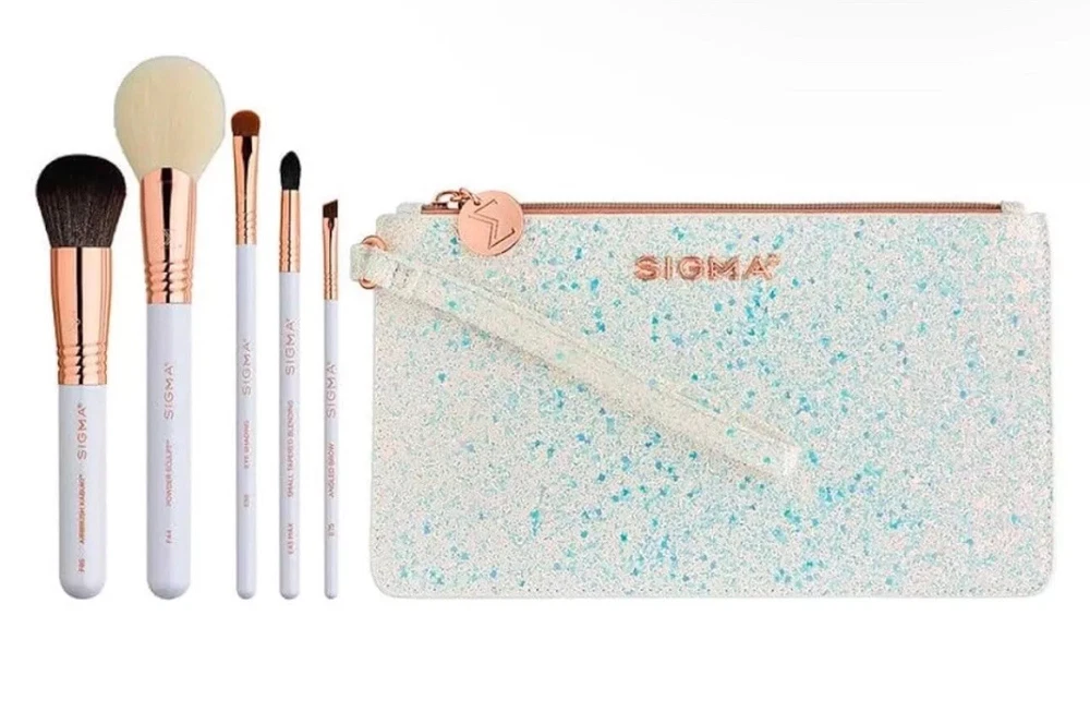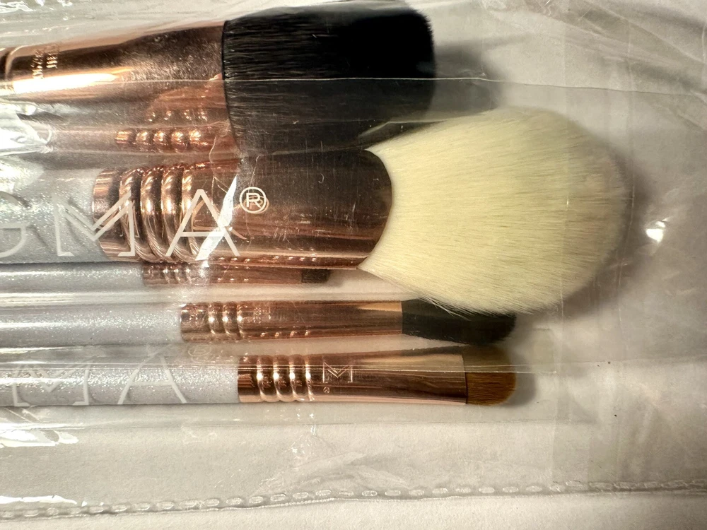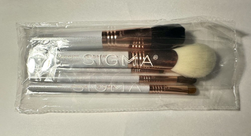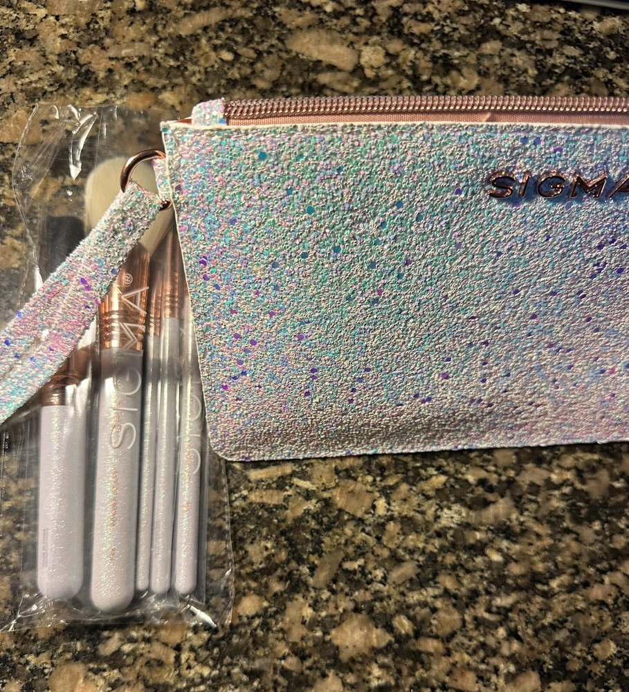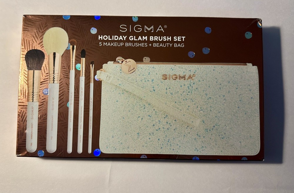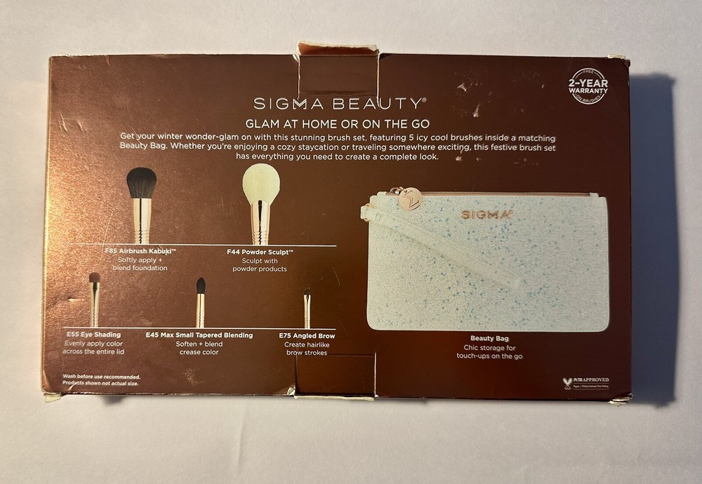 Sigma Beauty Holiday Glam 5-Piece Brush Set & Beauty Bag BRAND NEW! Please note that there are several creases on the box, as well as ripping at the top. Also, there are remnants of a price sticker that was peeled off on the back of the box (refer to photos for further details). “Get your winter wonder-glam on with this stunning brush set, featuring 5 icy cool brushes inside a matching Beauty Bag. Whether you’re enjoying a cozy staycation or traveling somewhere exiting, this festive brush set has everything you need to create a complete look. Includes: -F85 Airbrush Kabuki: soft apply + blend foundation -F44 Powder Sculpt: sculpt with powder products -E55 Eye Shading: evenly apply color across entire lid -E45 Max Small Tapered Blending: soften + blend crease color -E75 Angle Brow: create hairlike brow strokes -Beauty Bag: chic storage for touch-ups on the go. The bag has a peach satin interior and rose good hardware. ——————- Returns accepted within 30 days. The product should be shipped in same condition/packaging/seal that it was sent. Thank you for checking this listing! 🎁